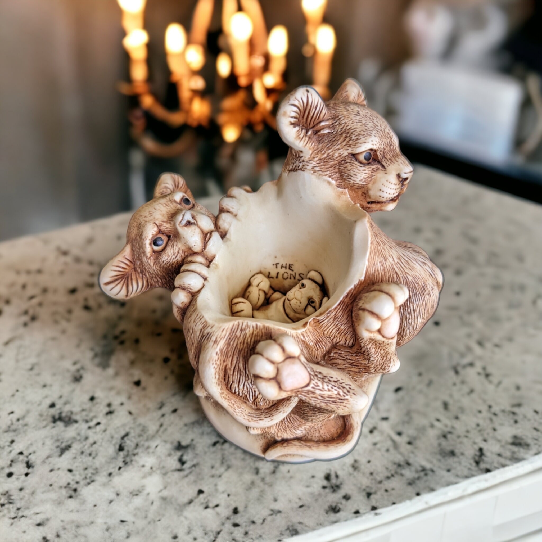 Adorable lion cub resin trinket box. Made in England . In great condition. No box. 3 inches tall and 3 inches wide. EM