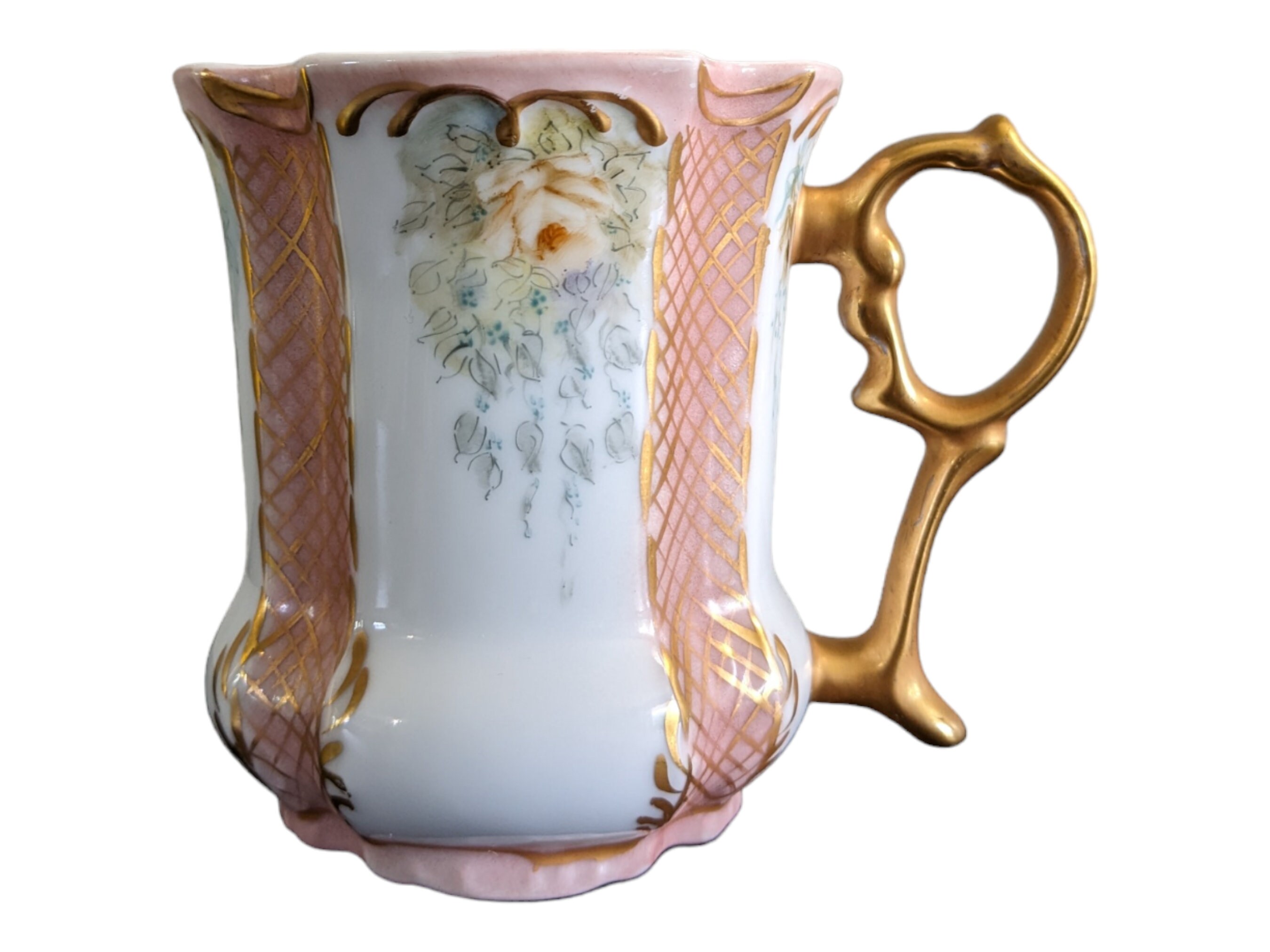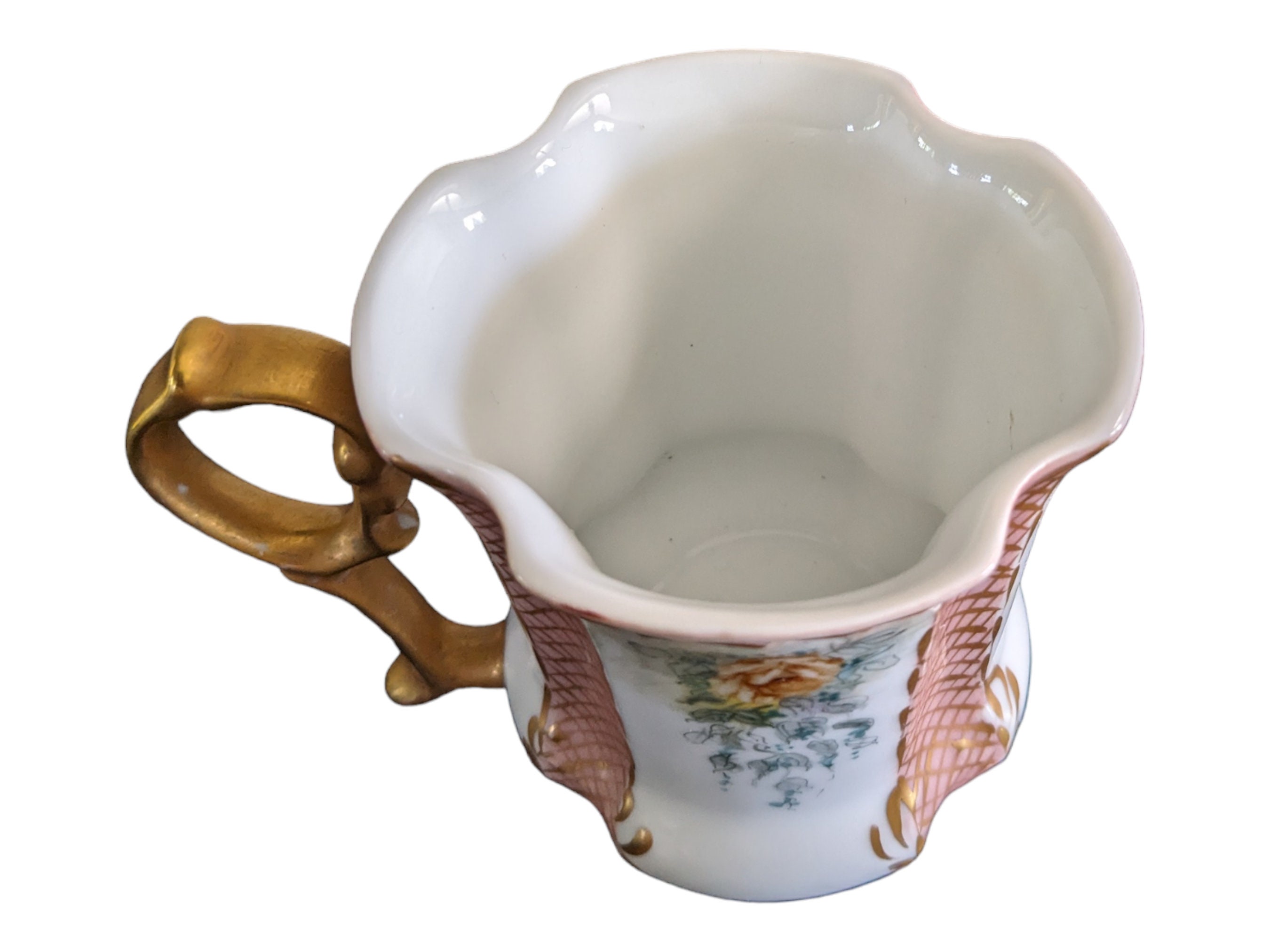 Form: The mug boasts a unique scalloped rim and a heavily gilded, ornate "C-scroll" handle that feels substantial and luxurious in the hand.