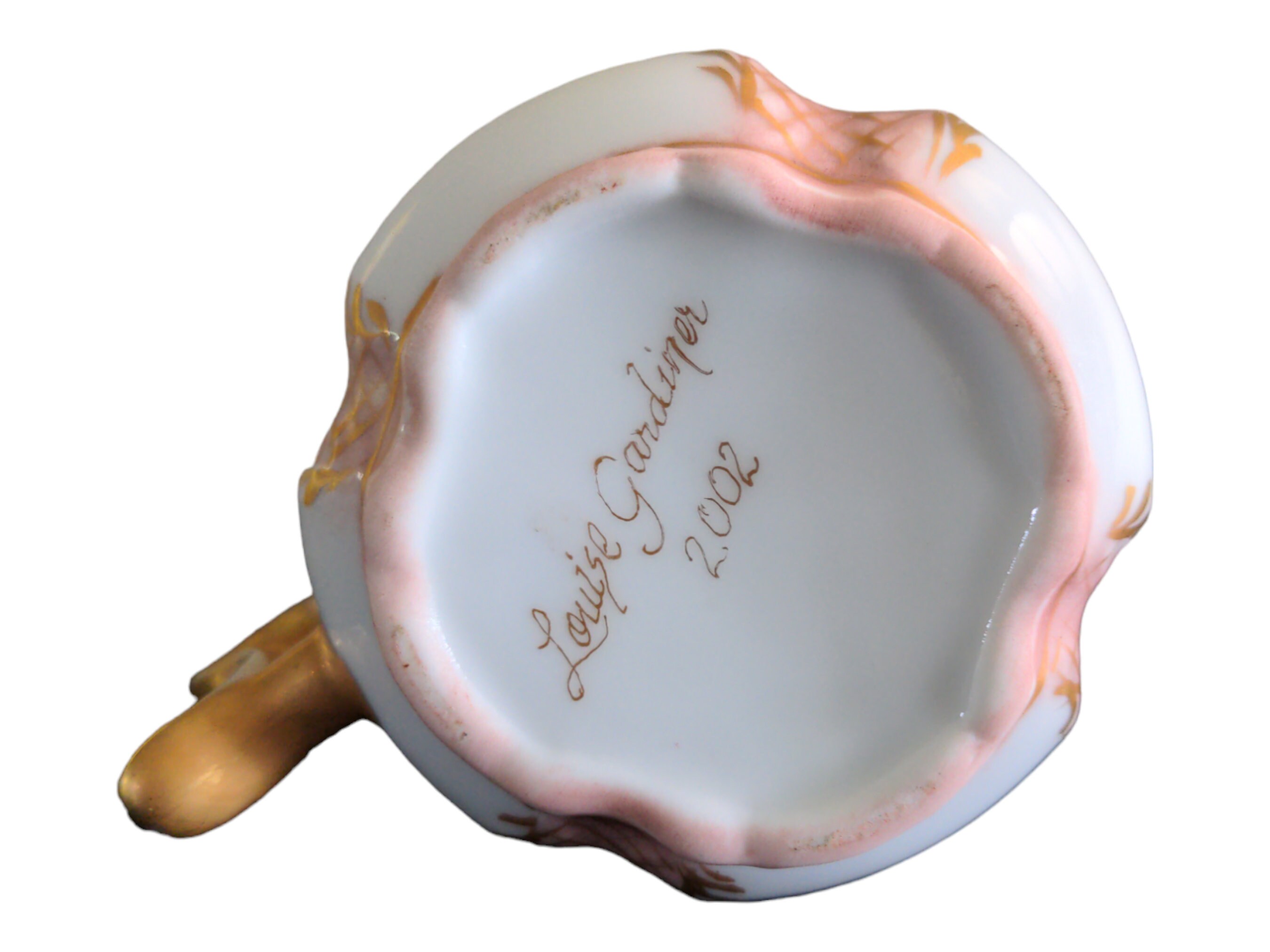 Step into a world of timeless elegance with this exquisite hand-painted porcelain mug by artist Louise Gardiner. Dated 2002, this piece captures the romantic essence of the Victorian era with a modern "Grandmillennial" twist. It is the perfect statement piece for a curated bookshelf, a sophisticated tea service, or as a thoughtful gift for a lover of fine florals and gold accents.Artist: Louise Gardiner (Signed and dated 2002 on the base).