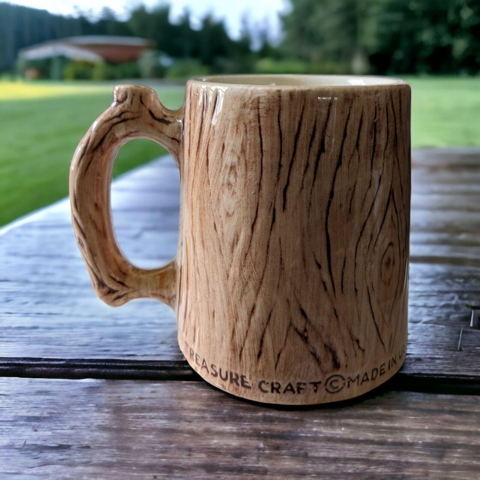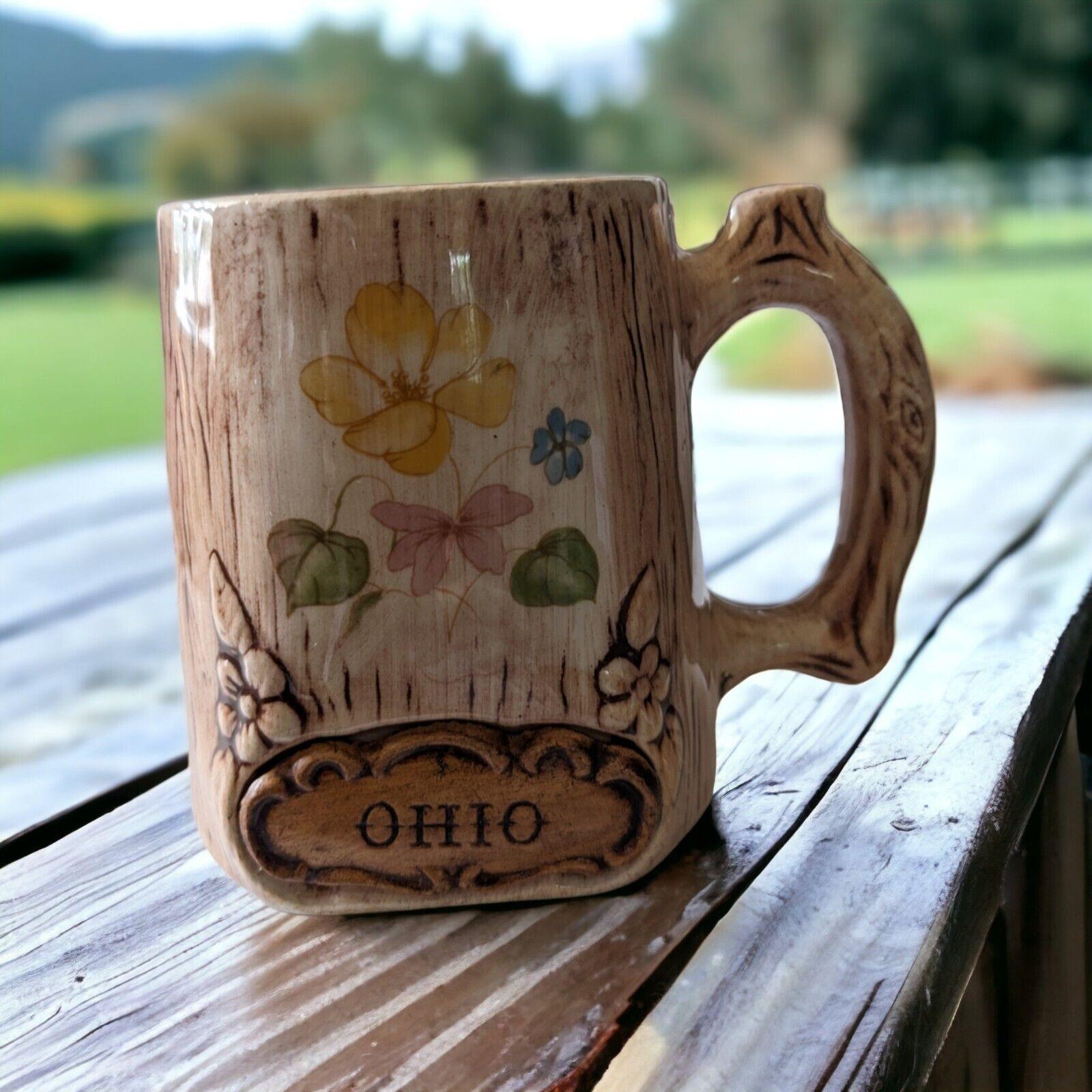 Embrace the rustic charm of the 1960s with this authentic Treasure Craft of California ceramic mug. Designed to mimic a hand-carved piece of timber, this mug features a deeply textured "bark" finish and a handle shaped like a sturdy tree branch. The front is adorned with a delicate, hand-painted floral motif and a raised relief "OHIO" plaque, making it a perfect piece of retro Americana.