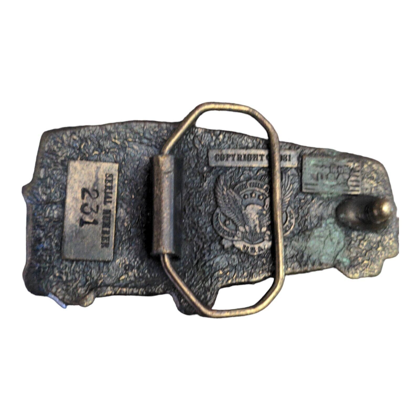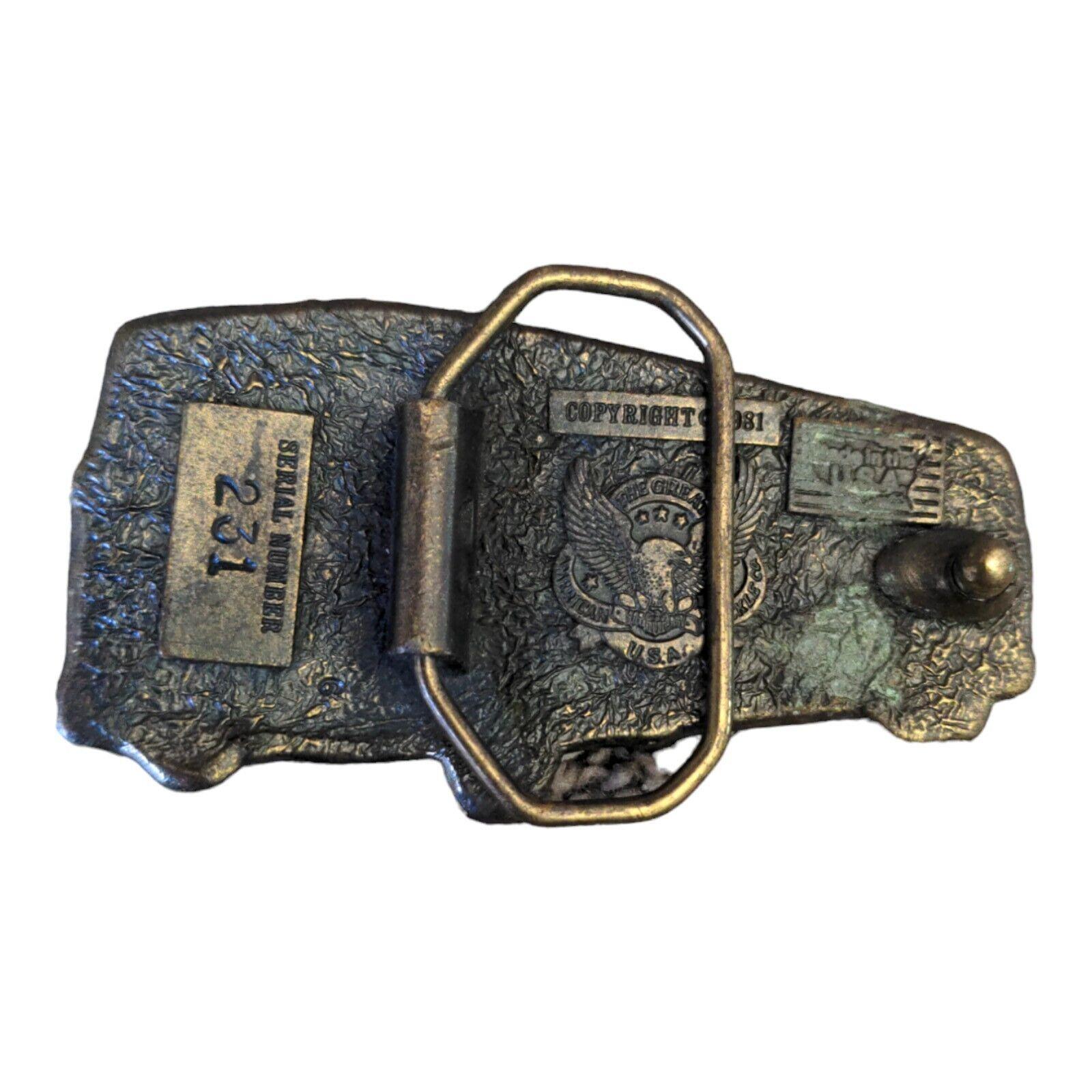 In good used condition.See photos. 4 inches high 2" inches wide. Made by the great American buckle co in 1981. I9