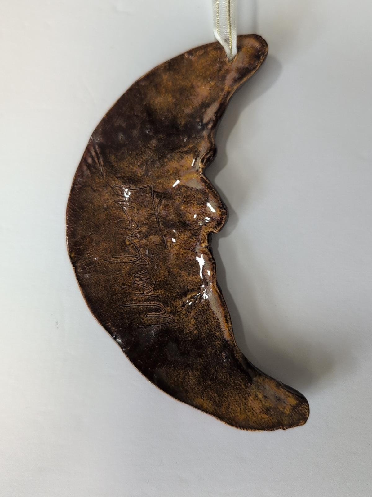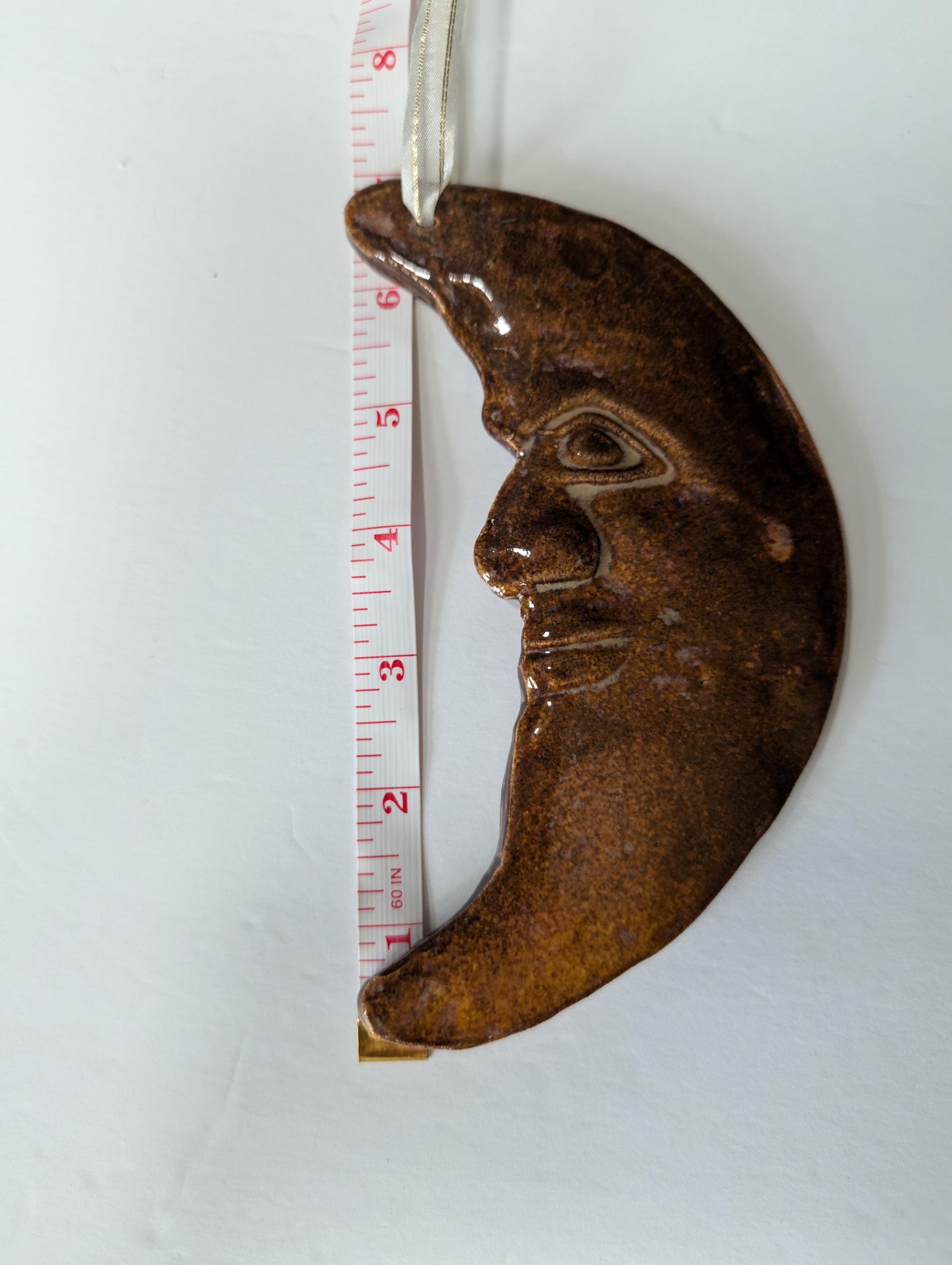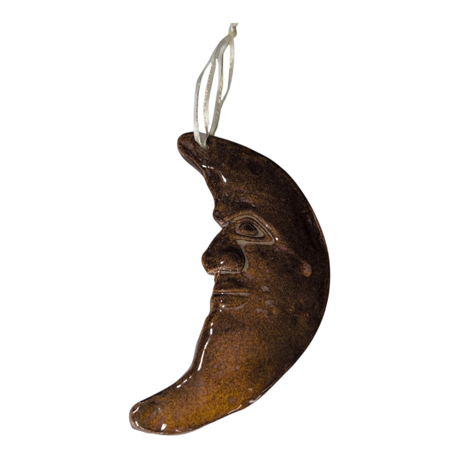 Add a touch of cosmic charm to your home with this enchanting vintage Windsong Pottery Crescent Moon ornament! This unique piece features a beautifully sculpted "man in the moon" face, with intricate details that bring the celestial body to life. Its rich, earthy tones and handcrafted texture evoke a sense of warmth and natural beauty.