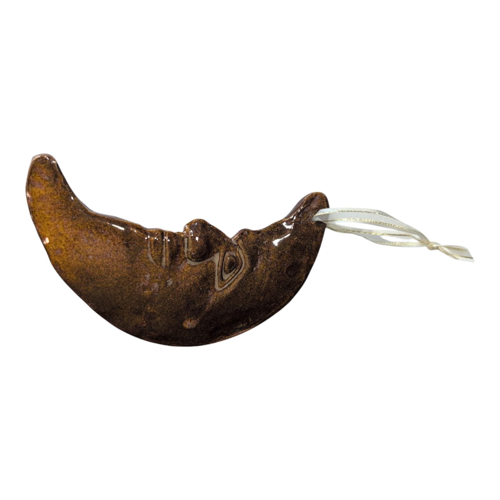 This delightful ornament is a testament to the artisan craftsmanship of Windsong Pottery, a brand known for its distinctive stoneware creations. Perfect for hanging on a wall, in a window, or as a unique addition to your holiday tree, this moon will bring a serene and mystical ambiance to any space.Signed Windsong . Approx. 7 inches long. 4 inches wide. M32