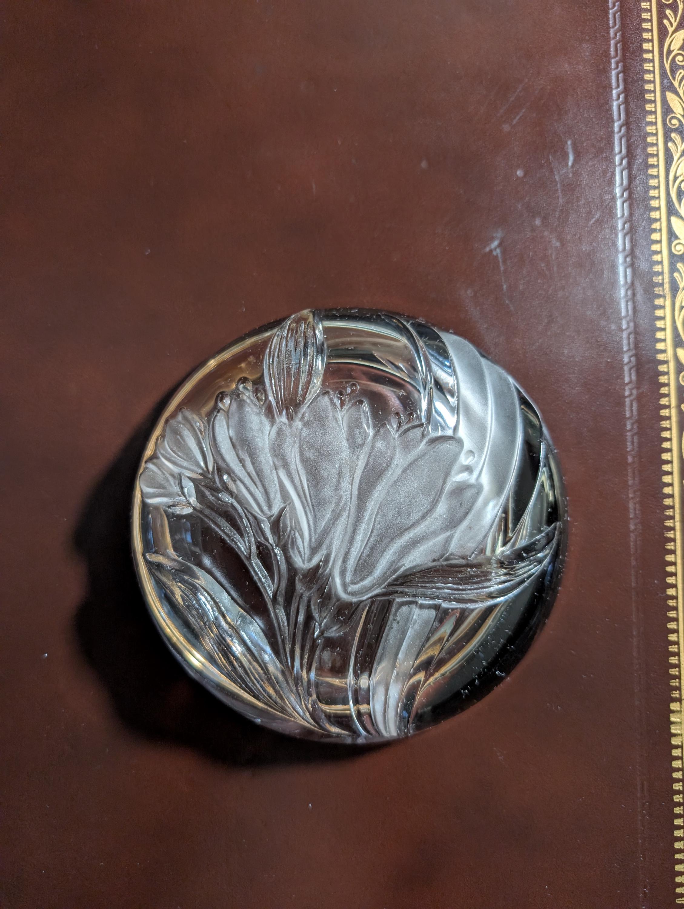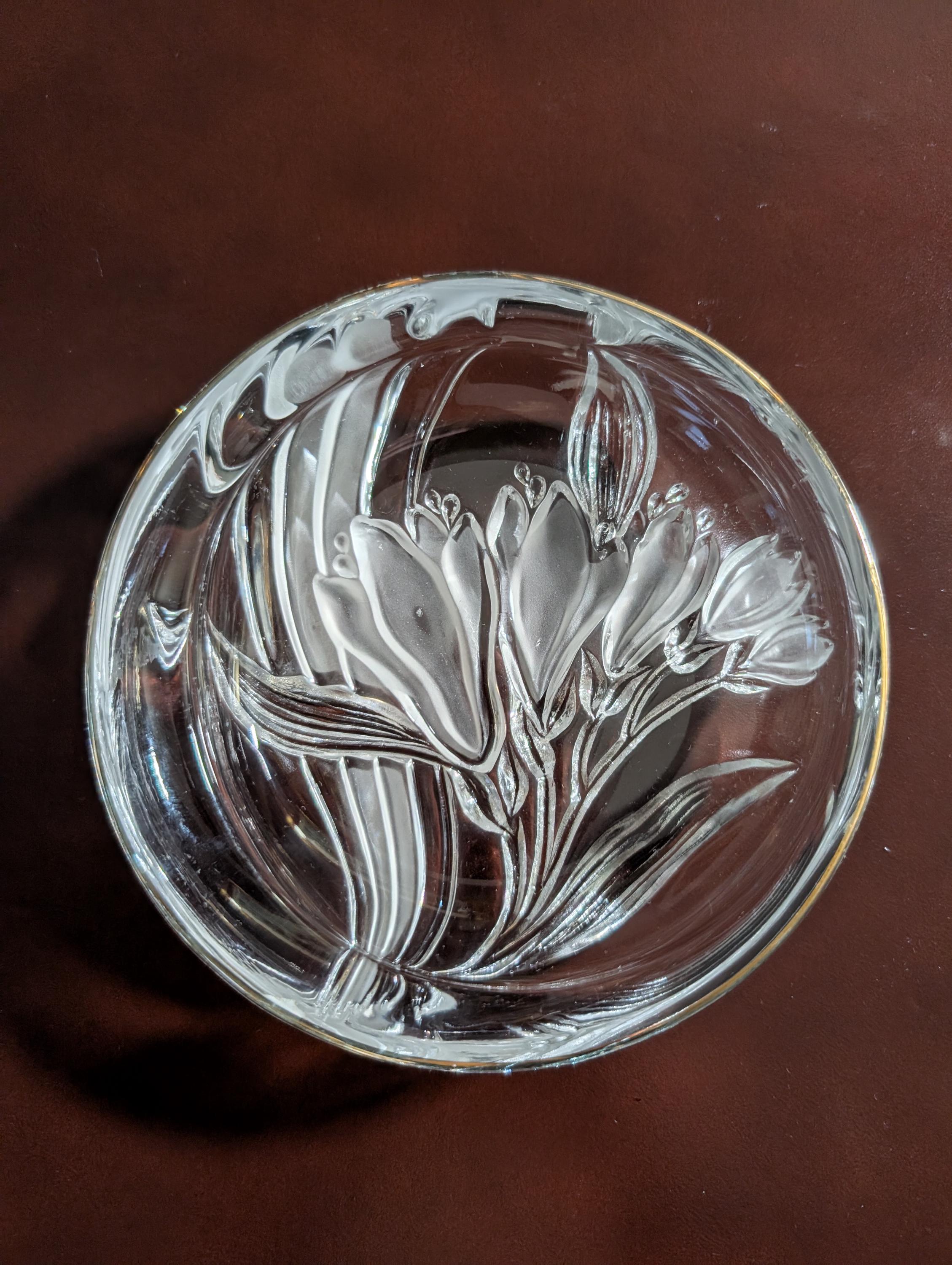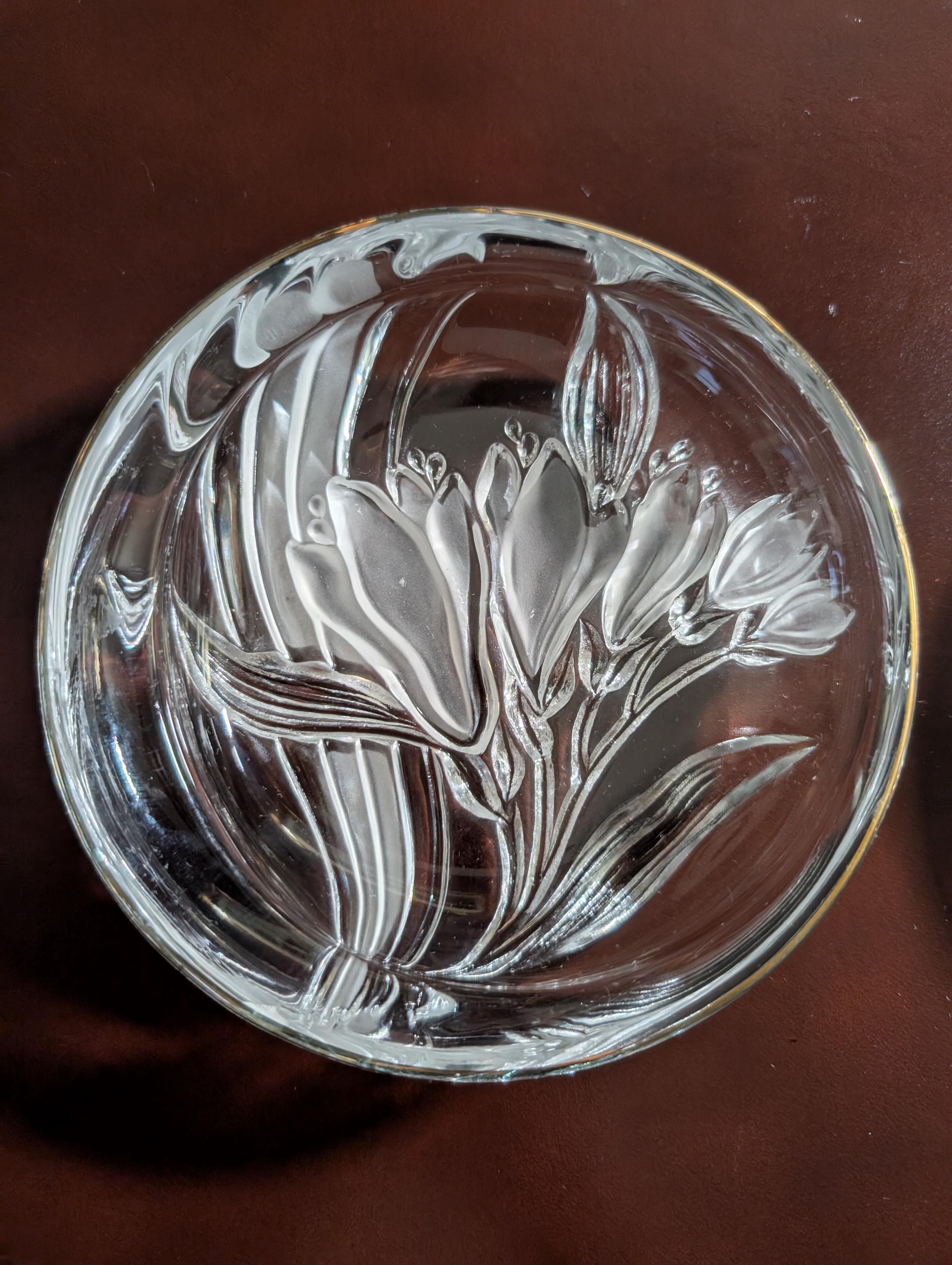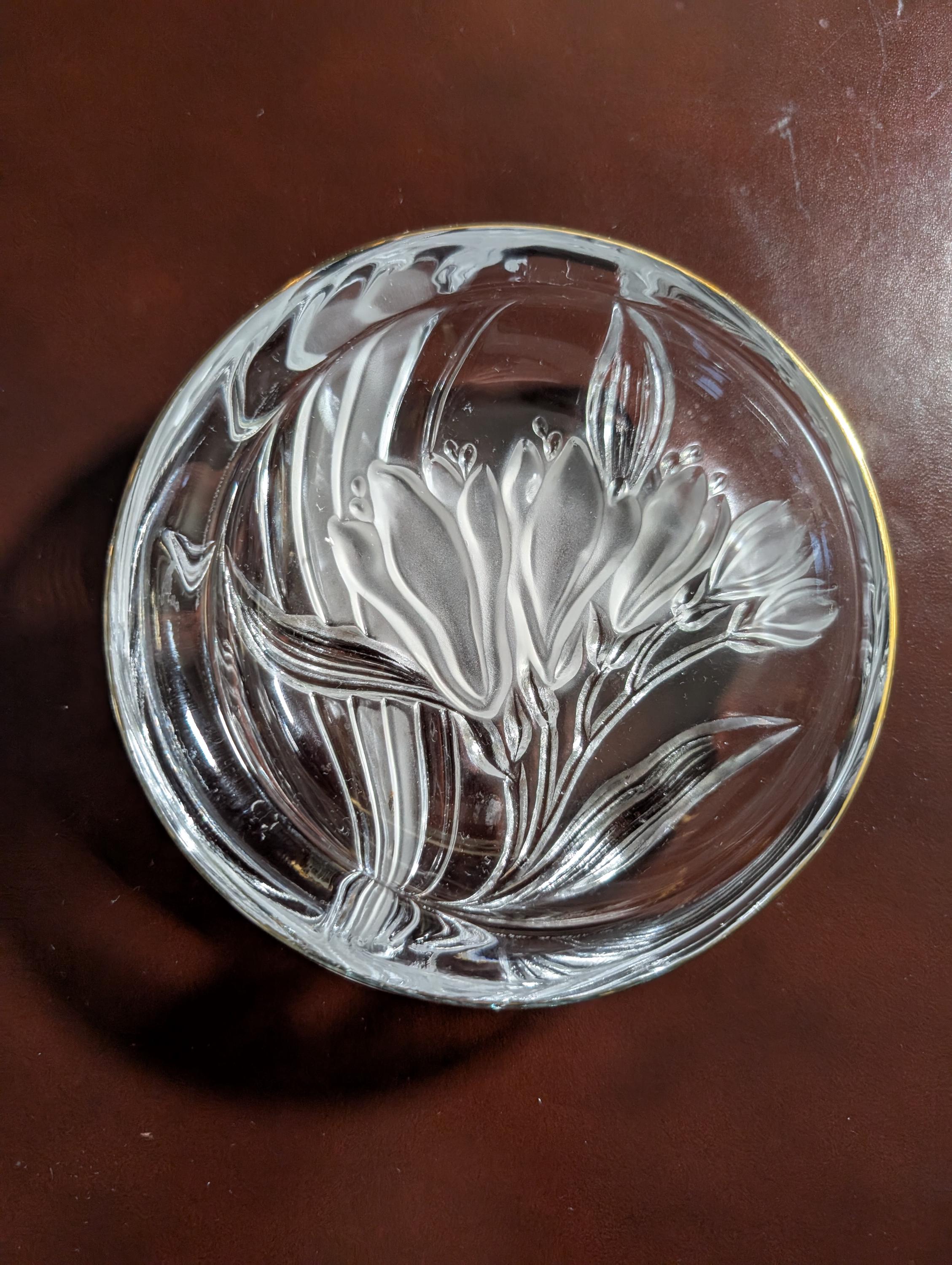 Two beautiful vintage heavy glass iris -floral trinket dishes or candy dishes. In great used condition. 5 inches across. K13