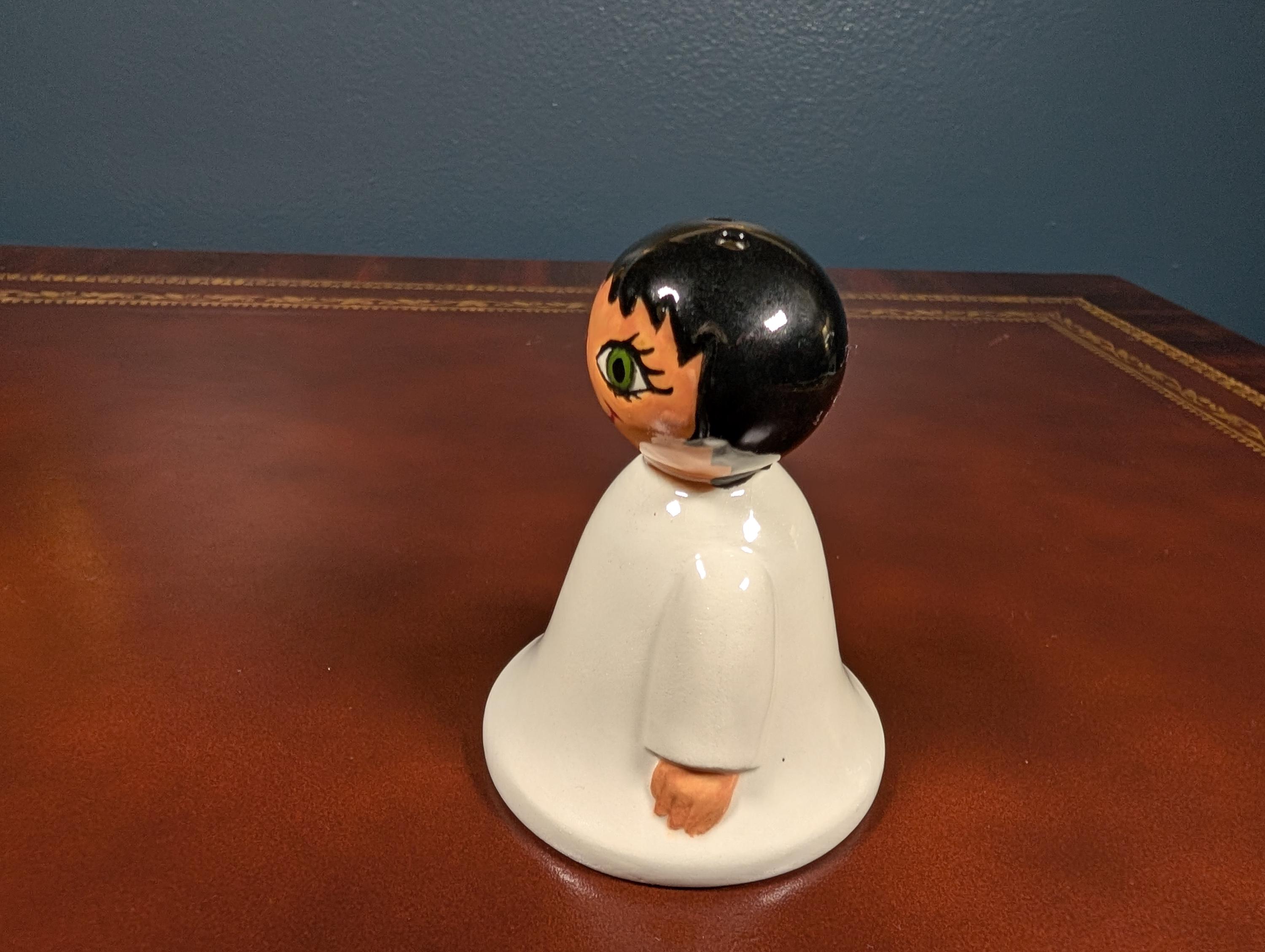 Adorable hand painted green eyed girl with black hair bell. Has the date of 1974 on the back. In great used vintage condition. 3 1/2" inches tall and 2 1/2" inches wide. K13
