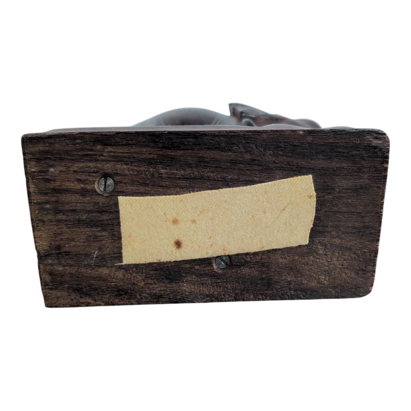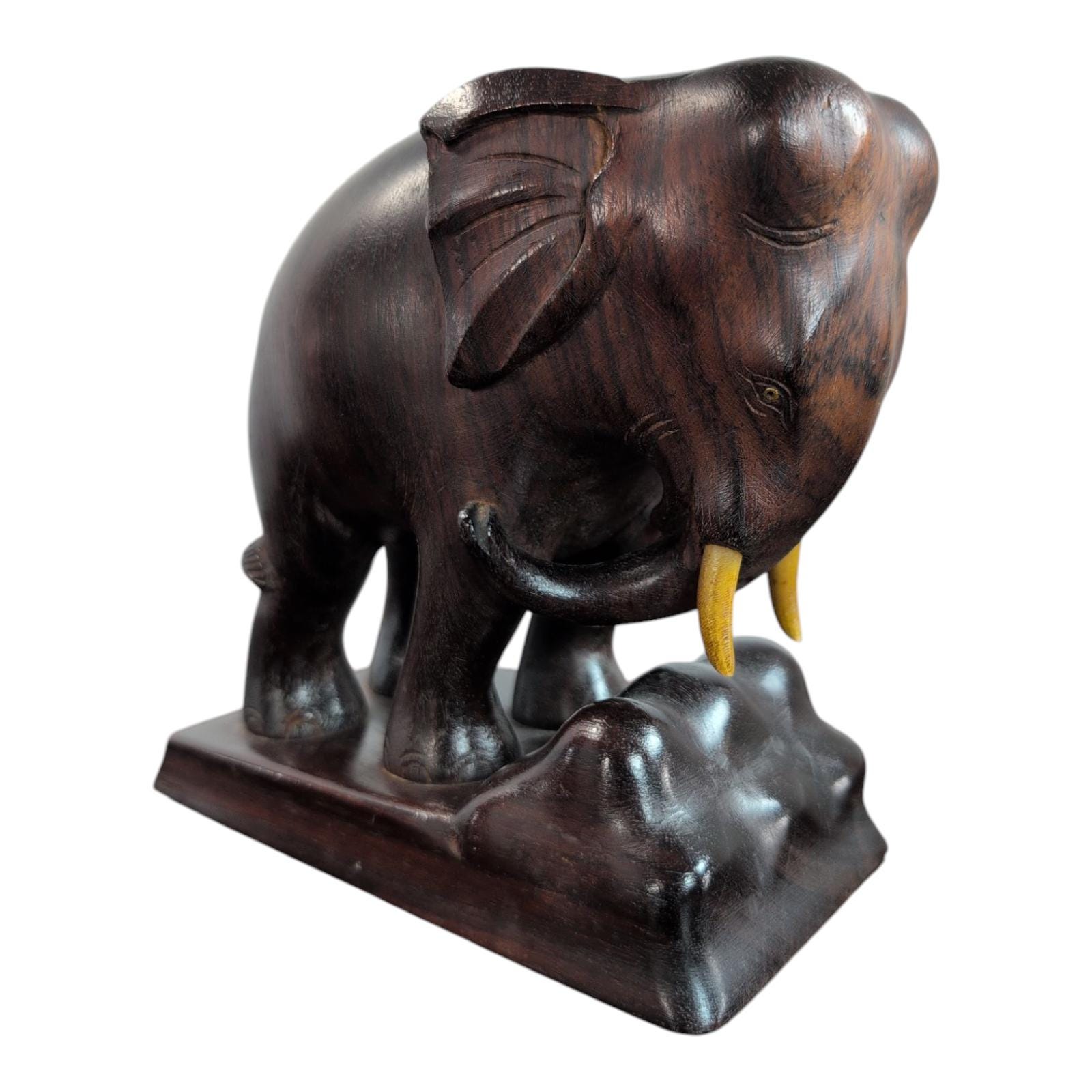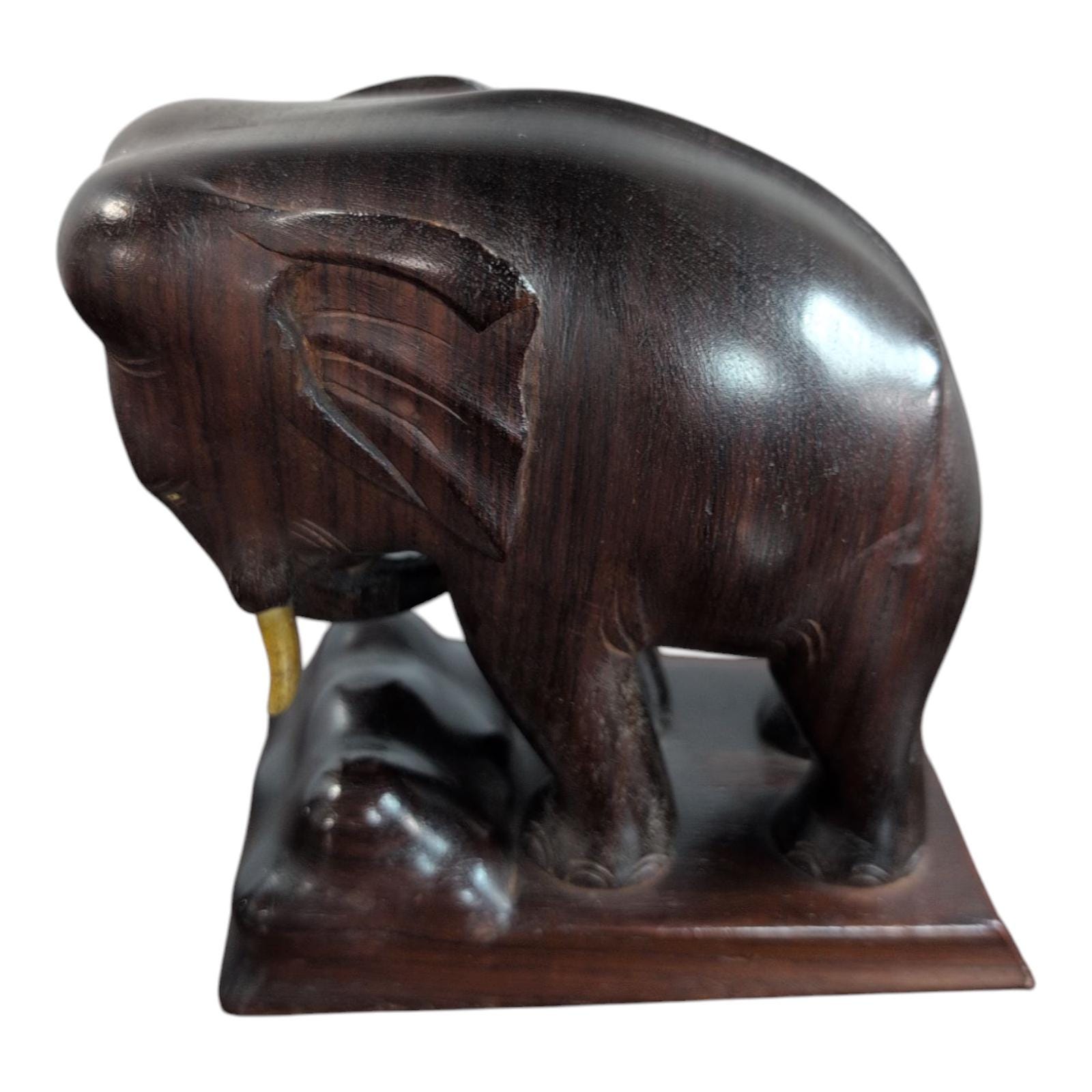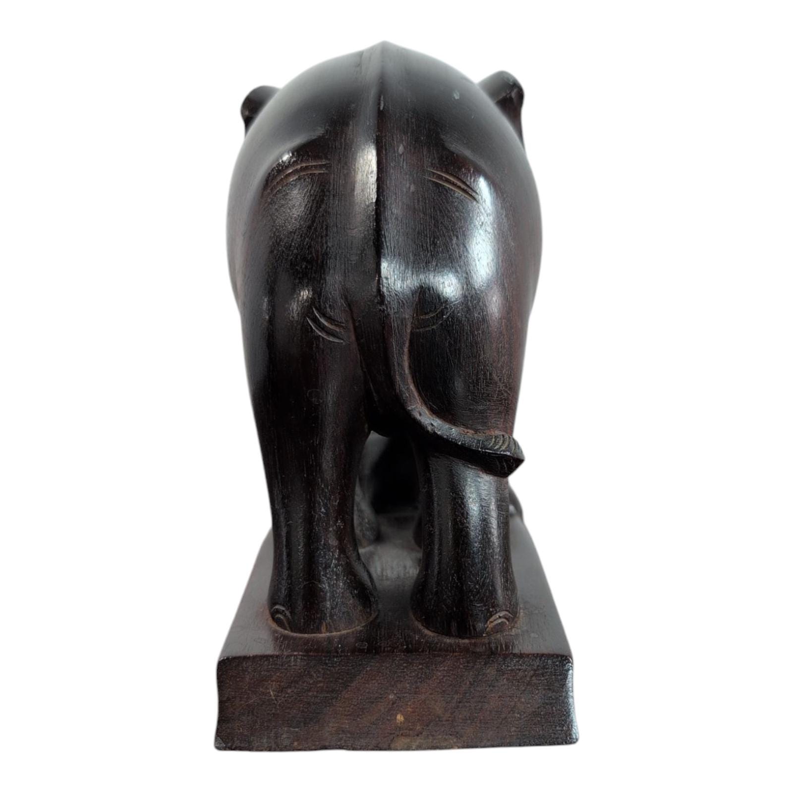Bring a touch of exotic elegance and timeless charm to your home with this stunning vintage hand-carved wood elephant bookend. Crafted from rich, dark brown wood, this beautiful elephant sculpture stands majestically on a raised base, showcasing intricate details and a truly artisanal quality. Its sturdy design makes it a perfect bookend for your cherished collection, or a captivating decorative piece on its own.Beautifully carved and in good used condition. Minor surface wear typical of age. See photos . 7 inches tall. 6 1/2" inches long and 3 1/2" inches wide.