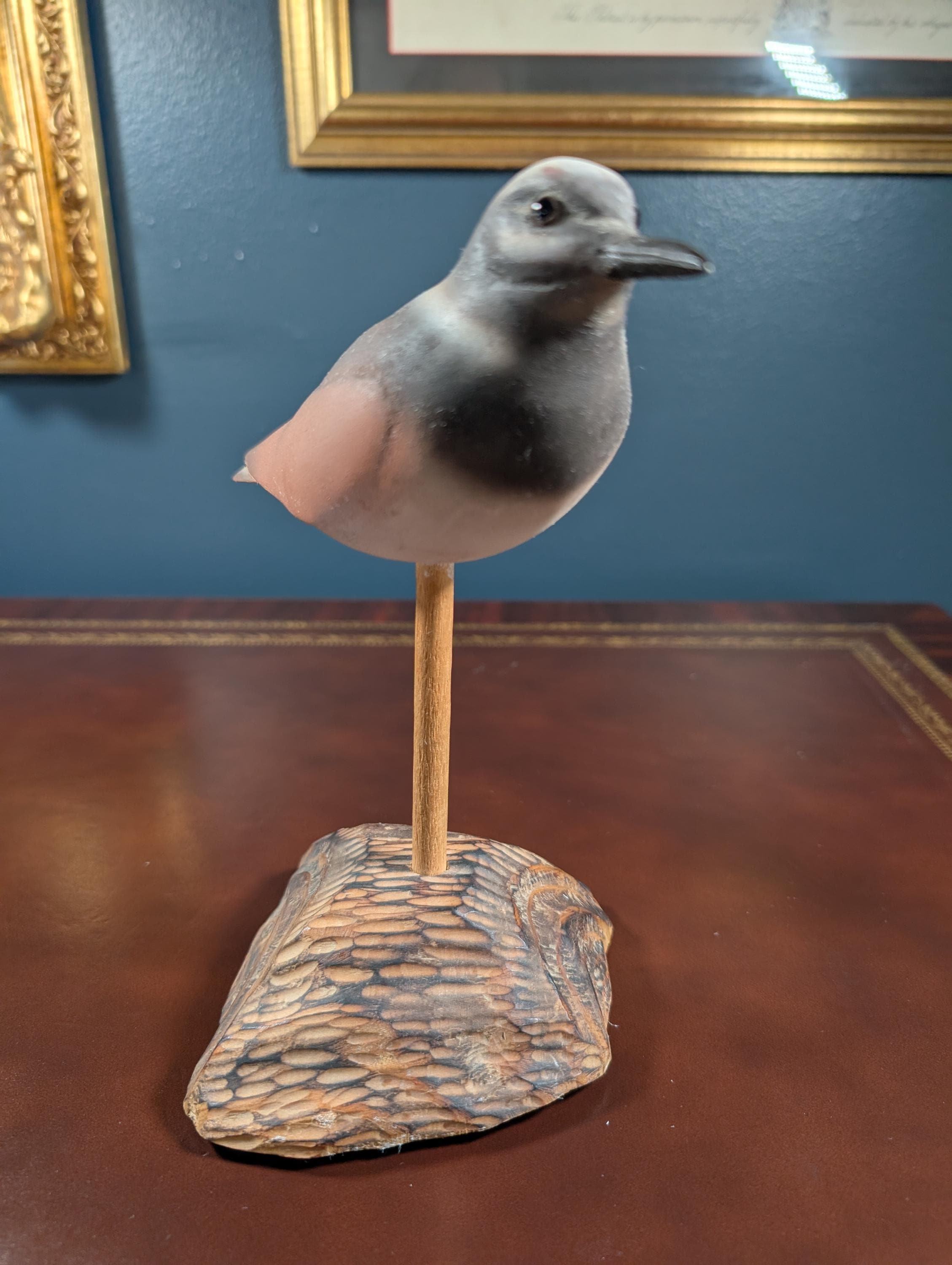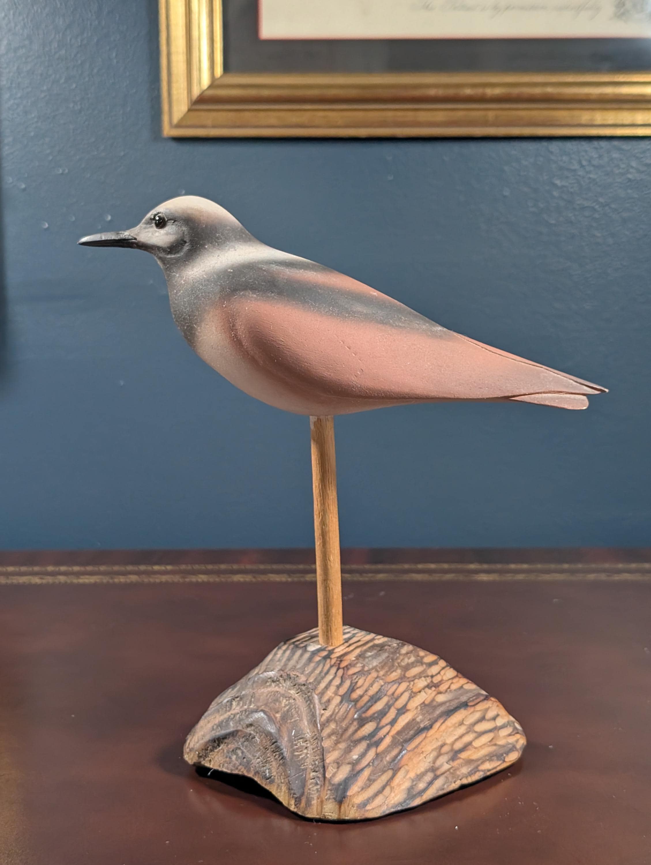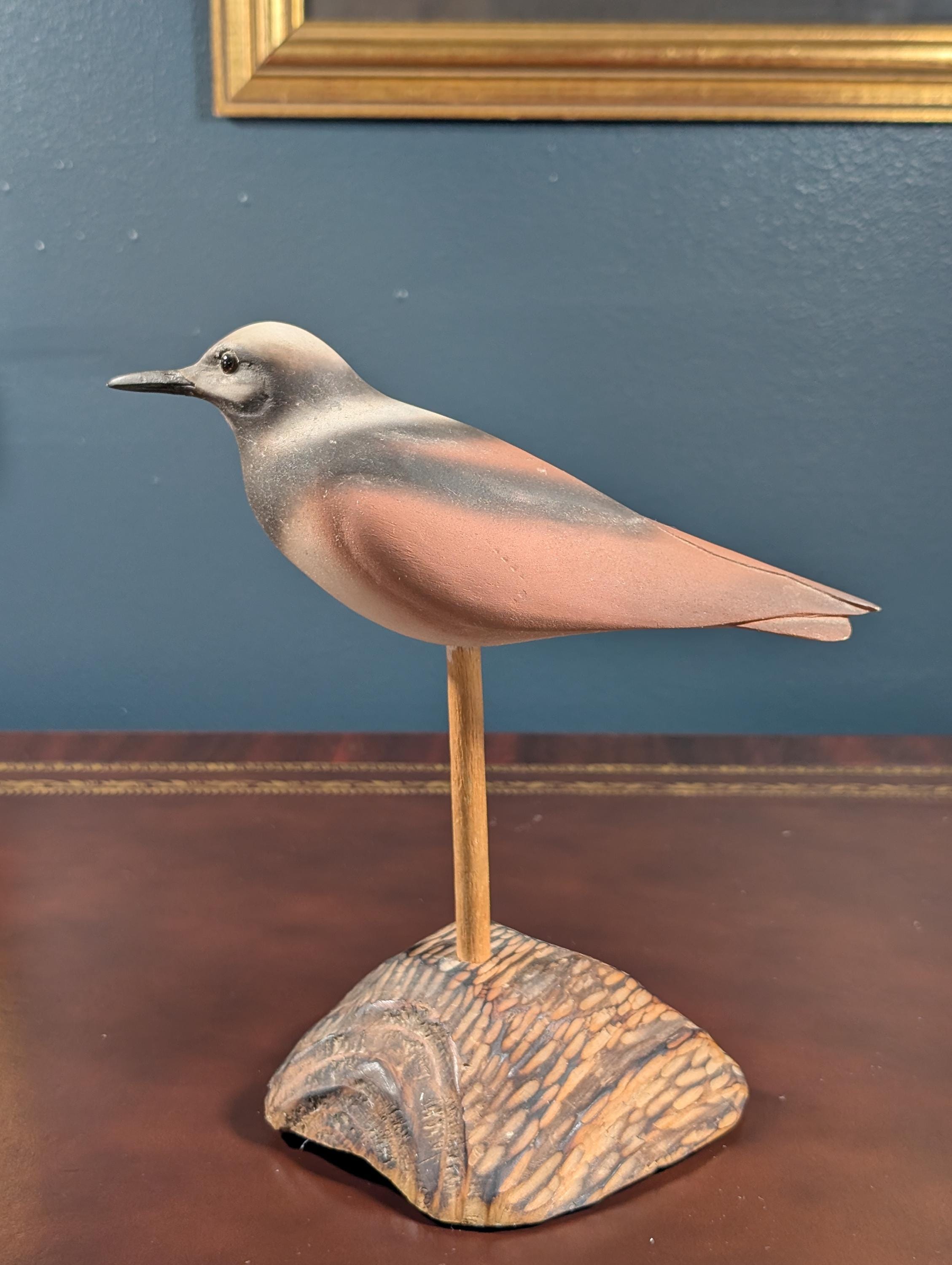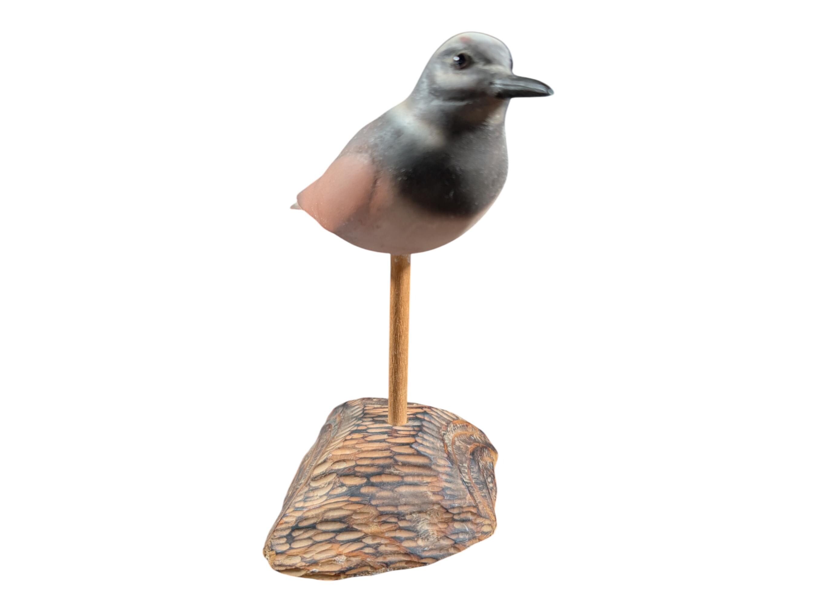 Vintage Hand Carved Wood Shorebird Decoy on Driftwood Base – Painted Folk Art Sandpiper / Red Knot Sculpture – Coastal Mantle Decor