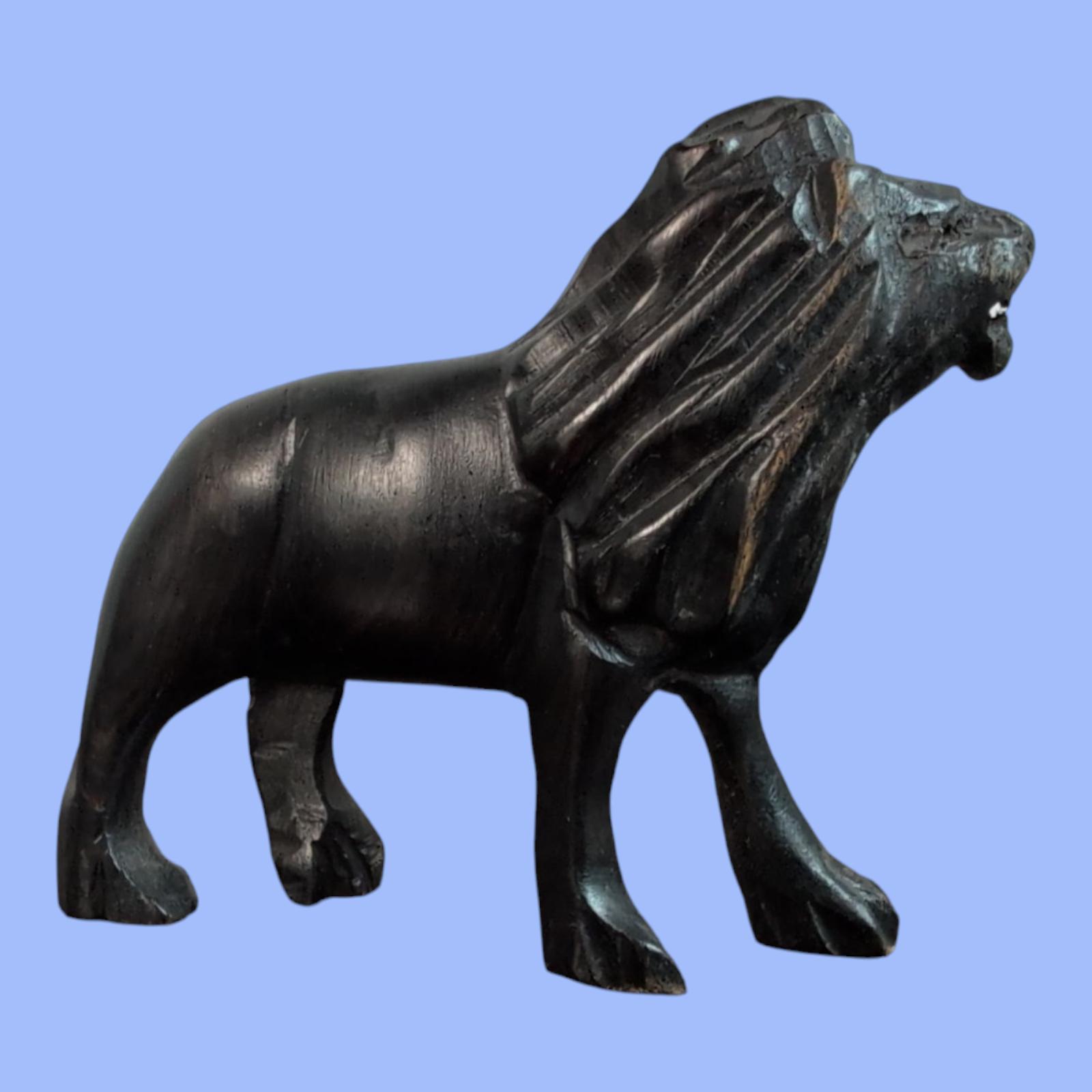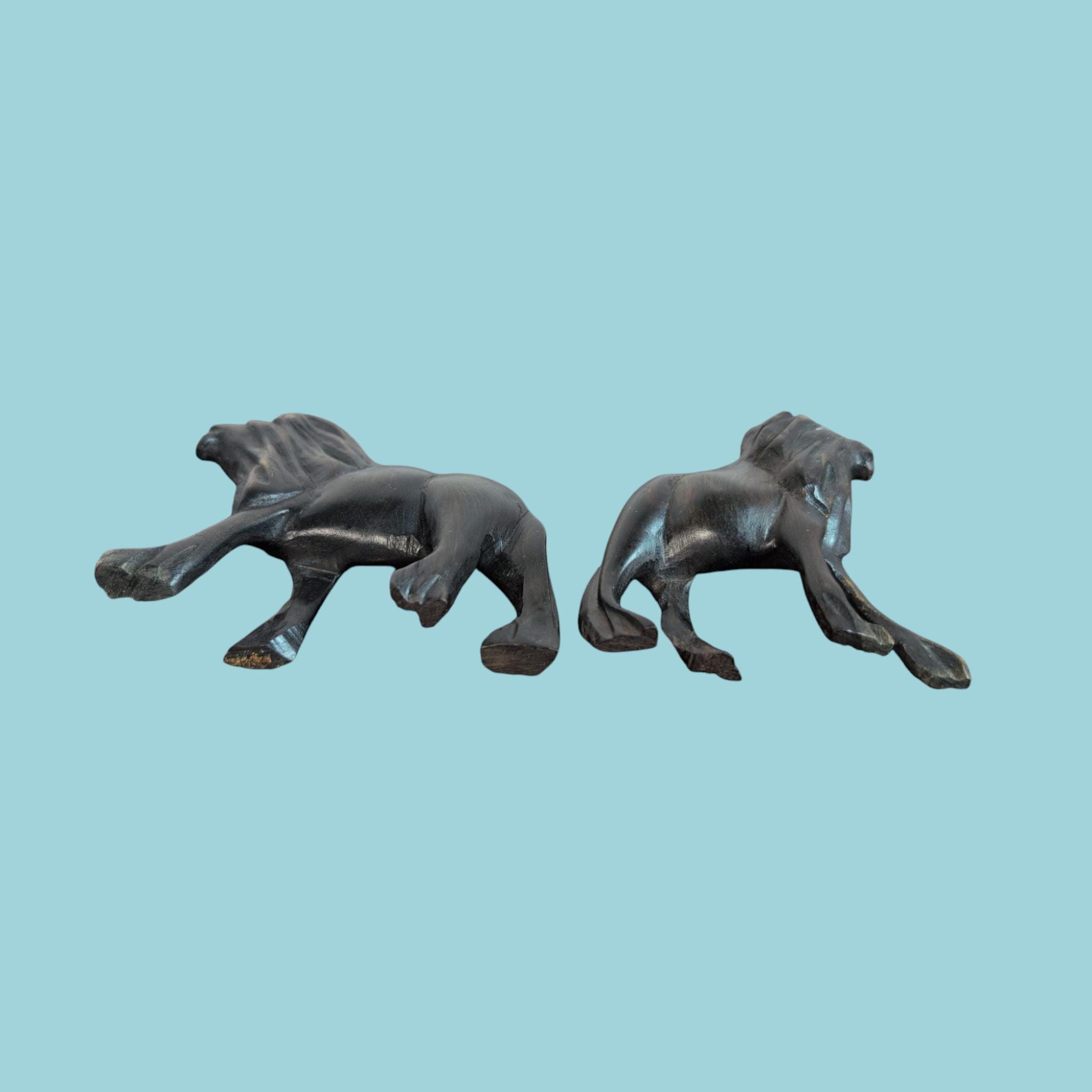 Add a touch of global drama to your home with this striking pair of vintage hand-carved dark wood lions. Sold as a set of two, these figures are captured in a dynamic, facing pose, as if they are roaring or communicating. The beautiful, dark wood (possibly ebony or ebonized) has a rich patina and showcases the intricate, stylized details of the carving, especially in the flowing manes. Listing Includes: Two wooden Lions.In great vintage condition. Please review all photos carefully for details on texture and condition.