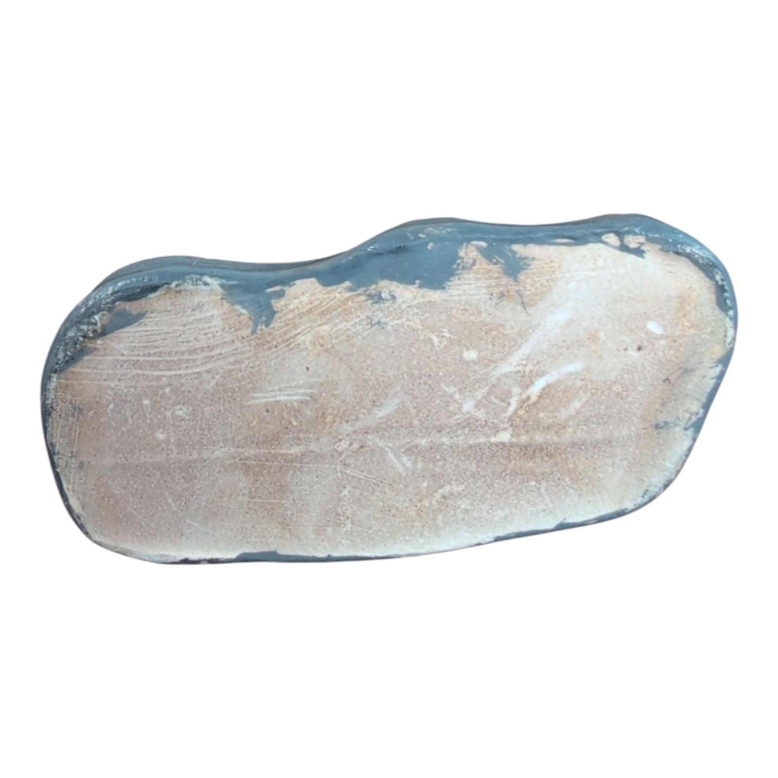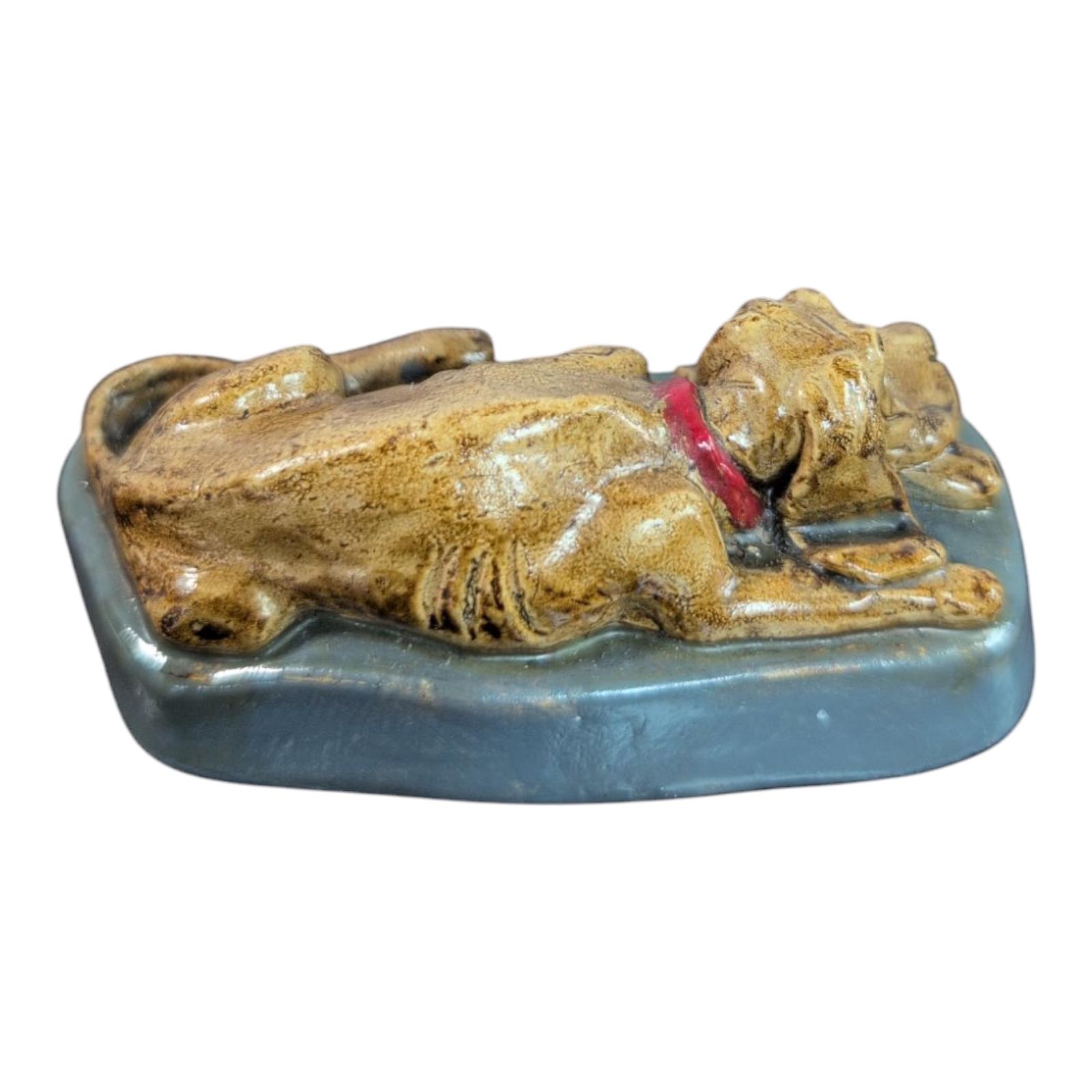 This vintage miniature chalkware figurine features a bloodhound laying on a gray bed . In good used vintage condition. 3" inches long . 1.25 inches tall . X20