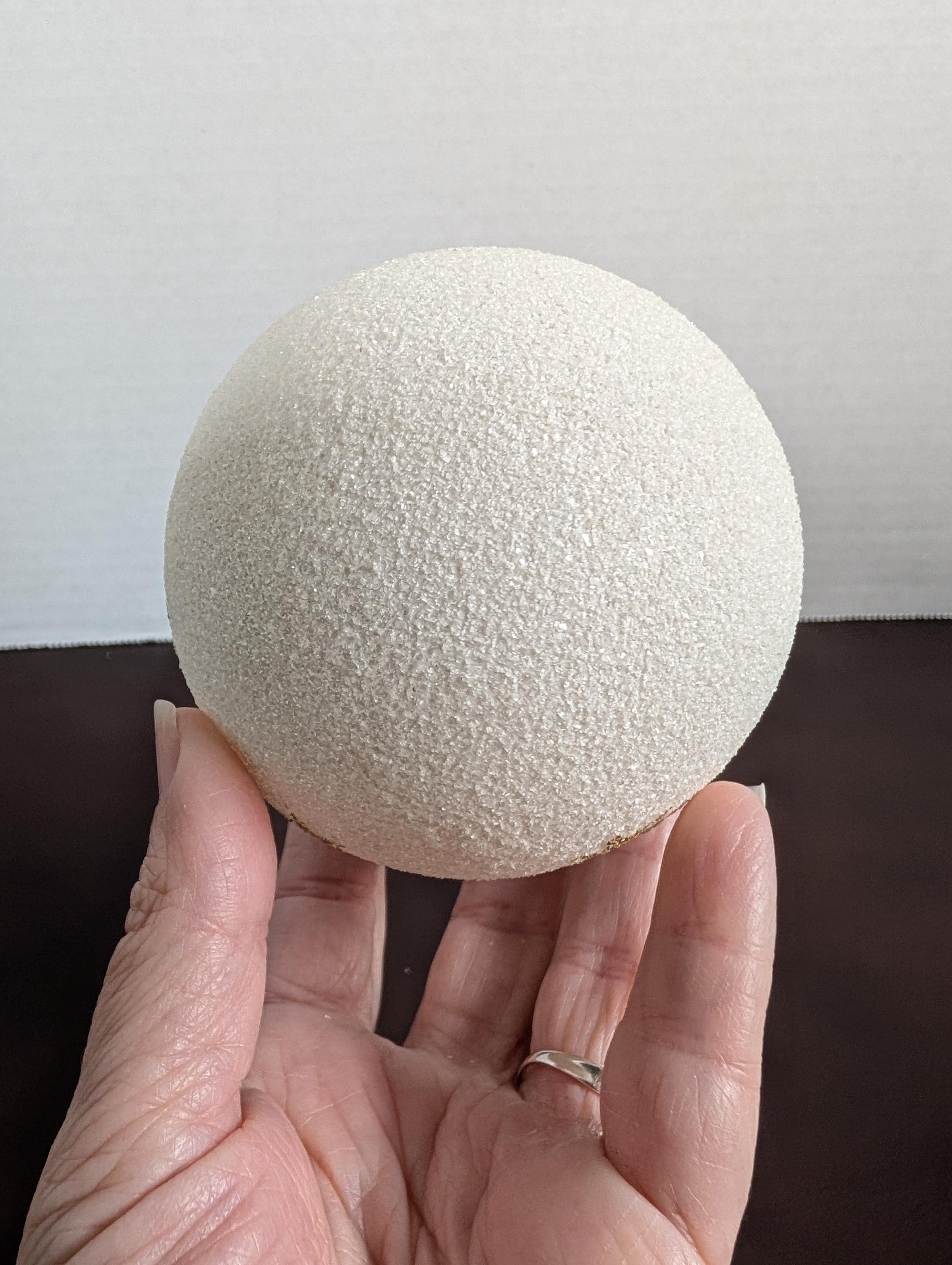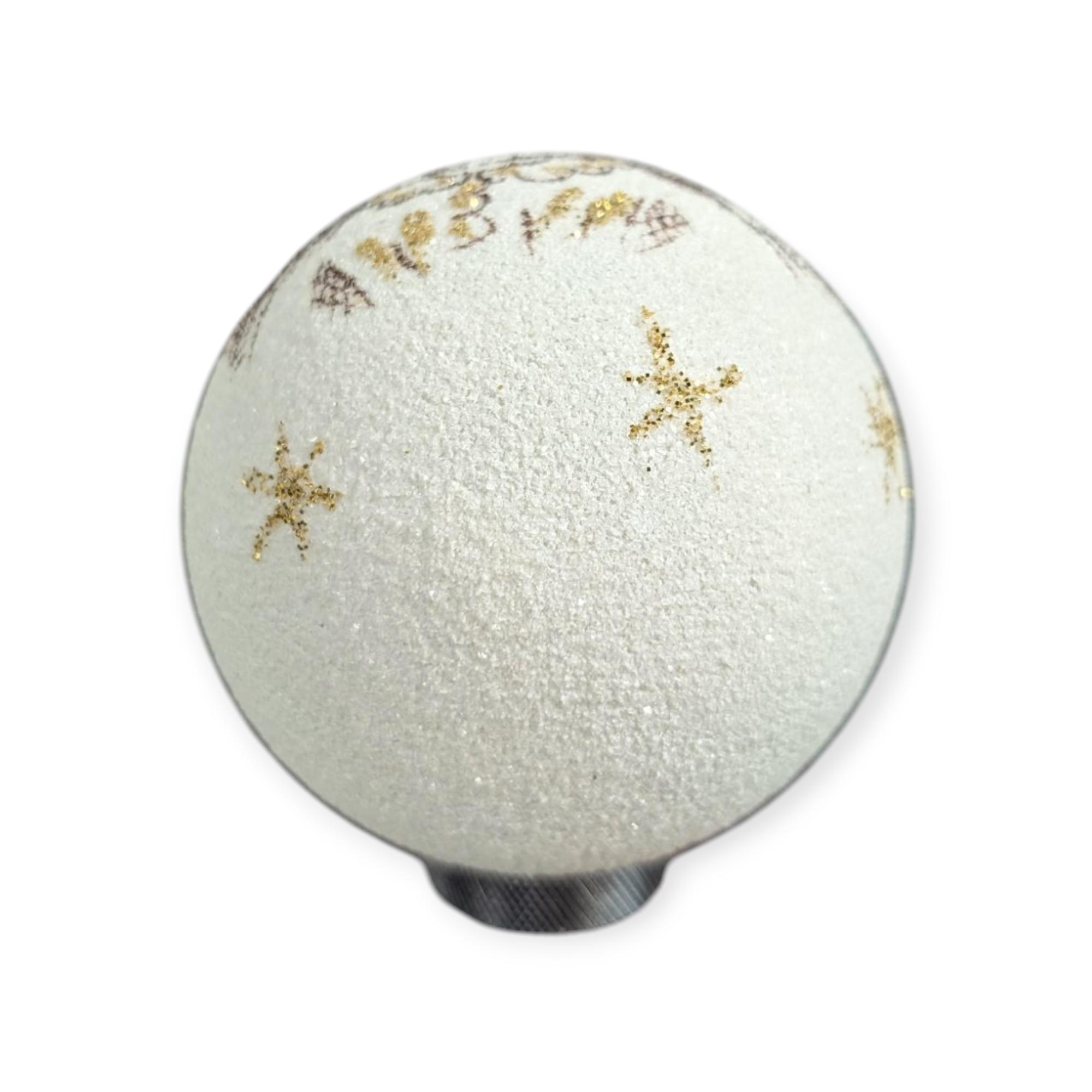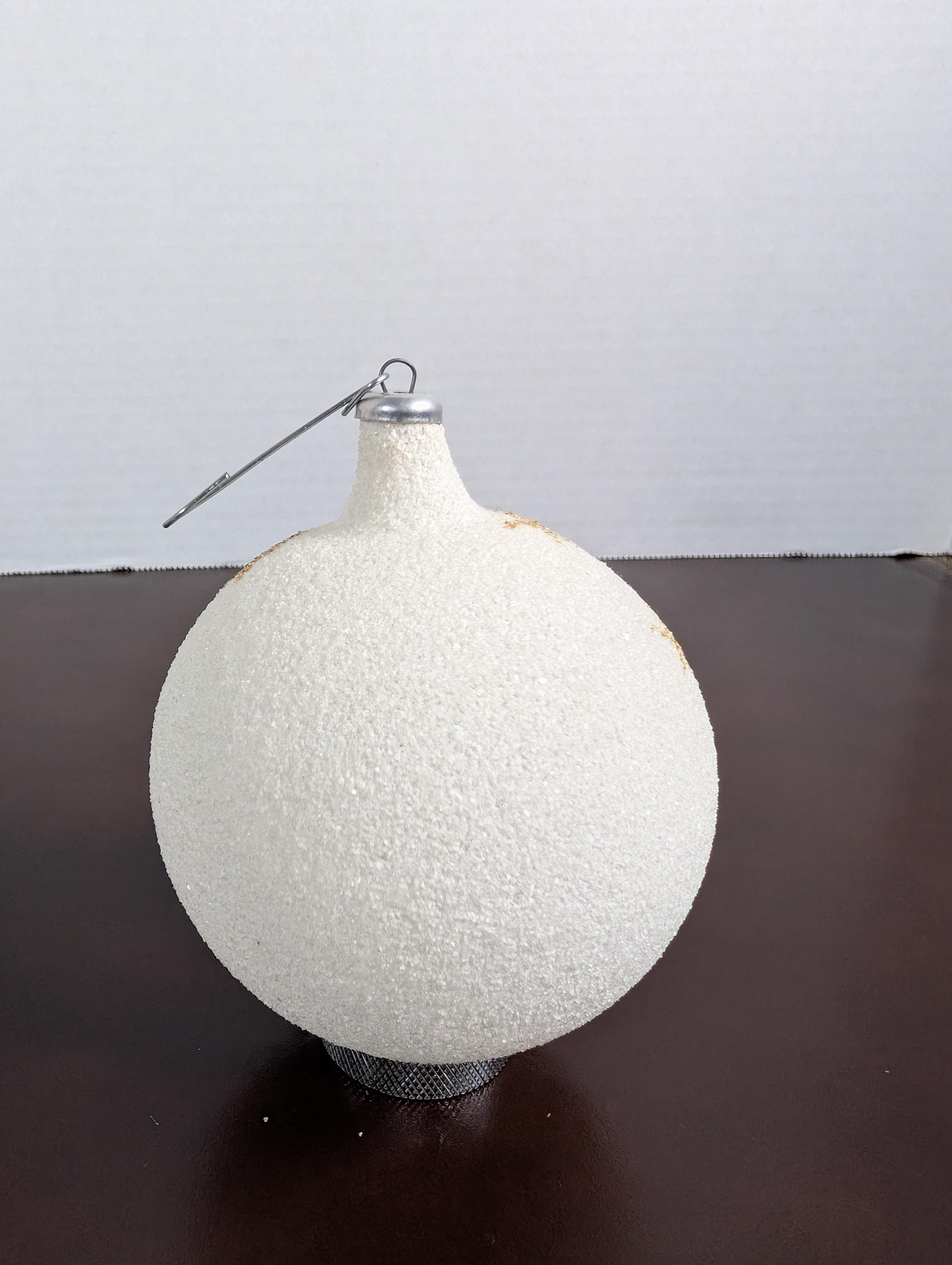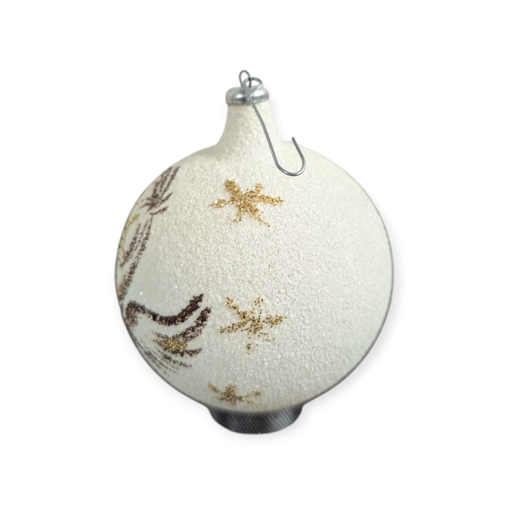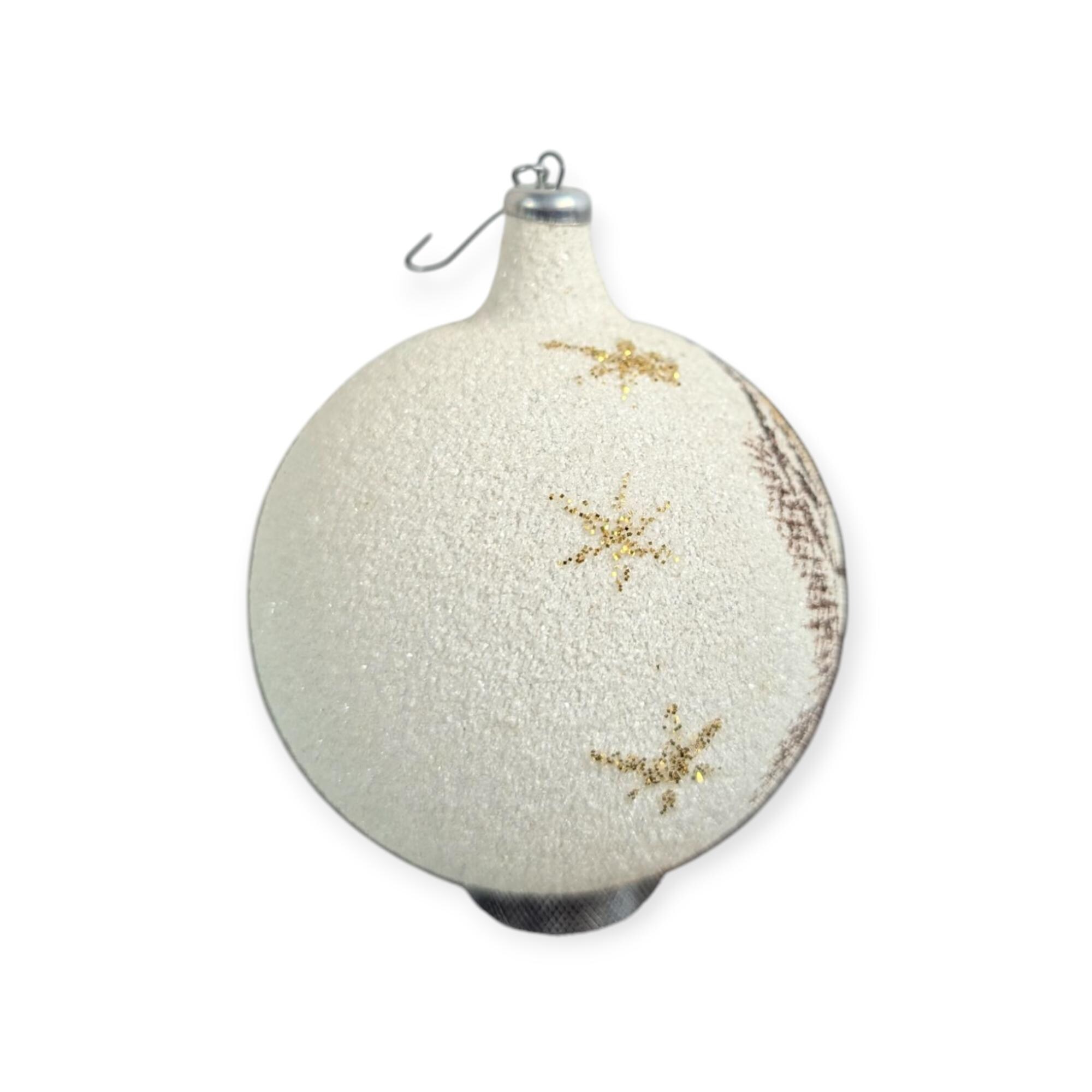 Vintage glass Christmas ornament made in Italy. It is covered in sparkling white snow and has a hand painted angel design, with gold accents. In excellent condition. A little over 4 inches tall and 5 inches at the widest. X30