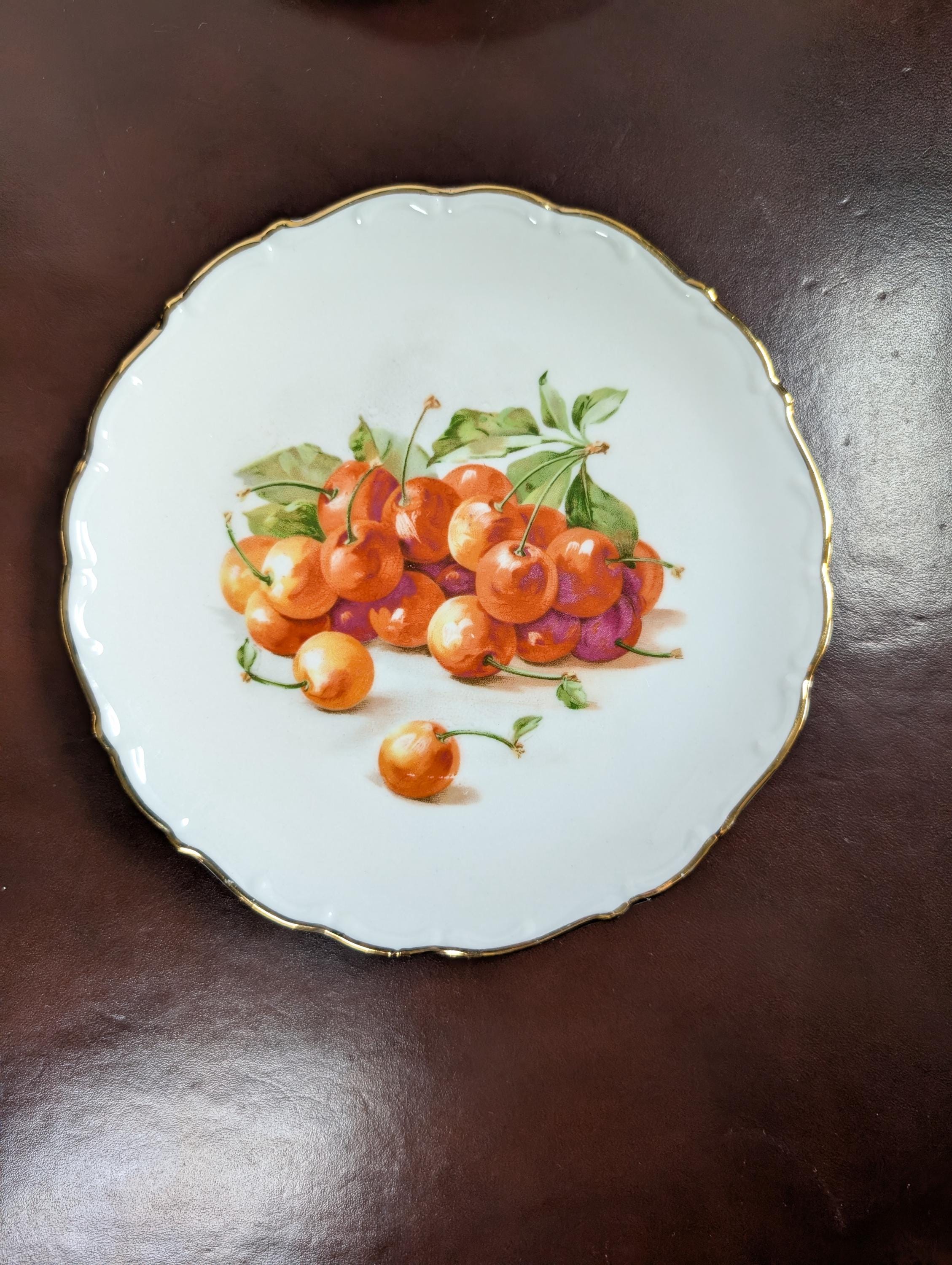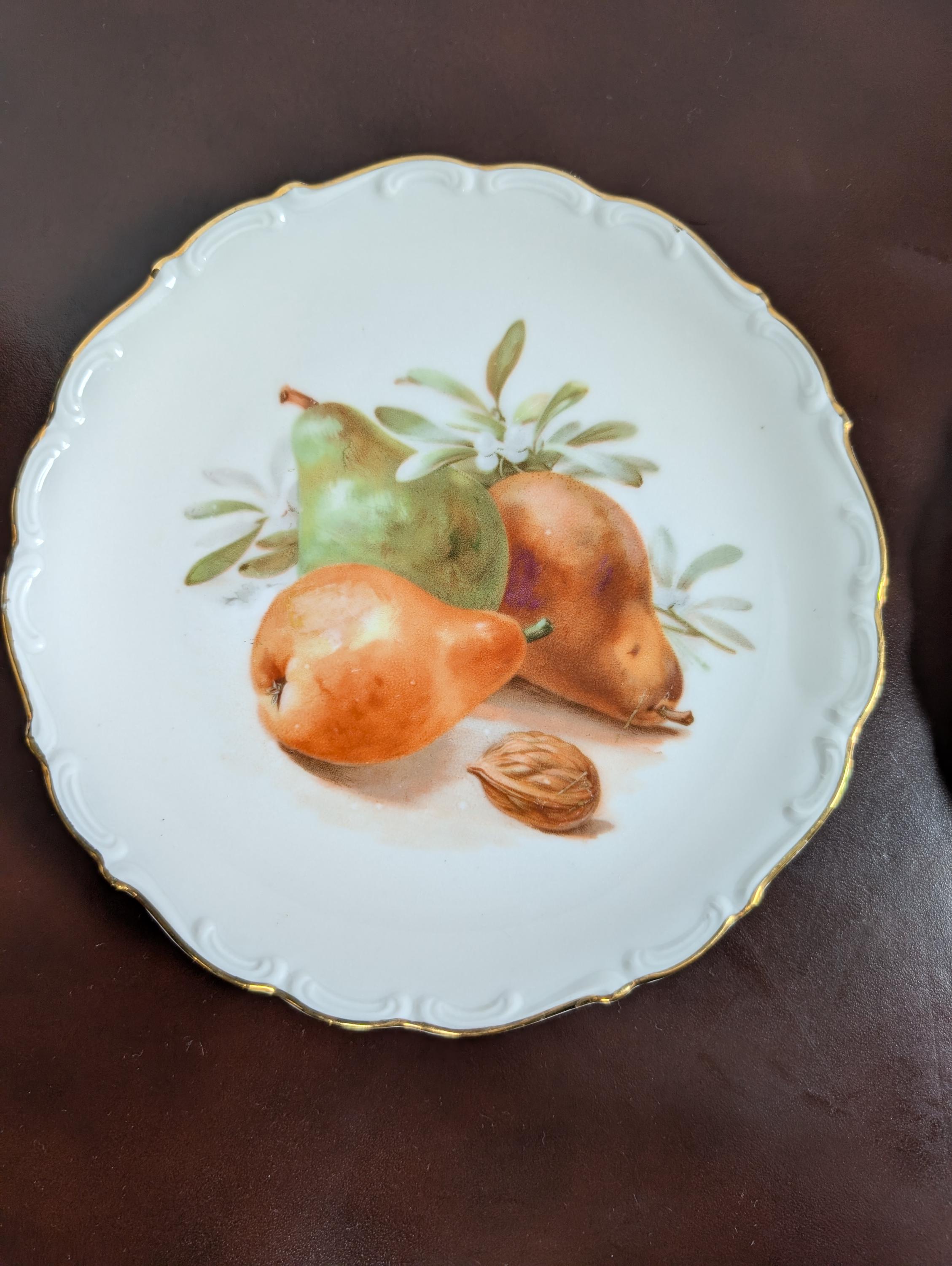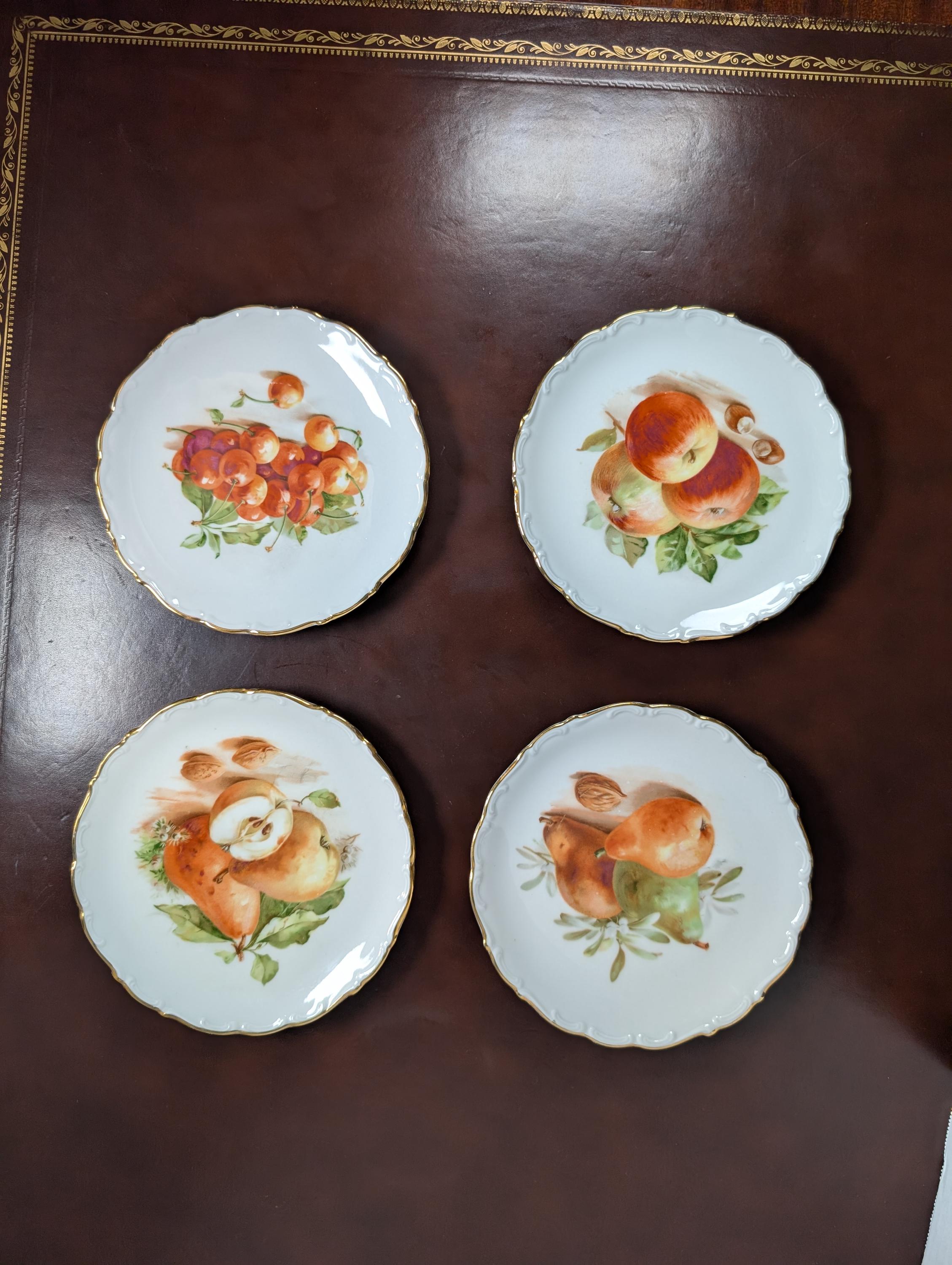 Four beautiful vintage fruit plates with scalloped edges and gold trim . Very Minor wear . Backs do have some discoloration areas see photos from being in a hanging plate rack. No chips or cracks.X31