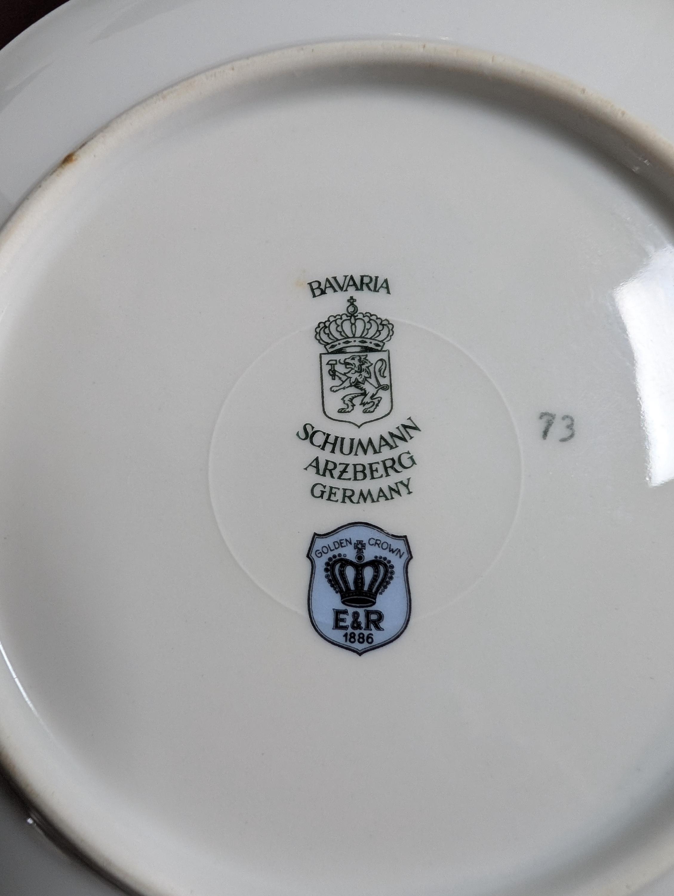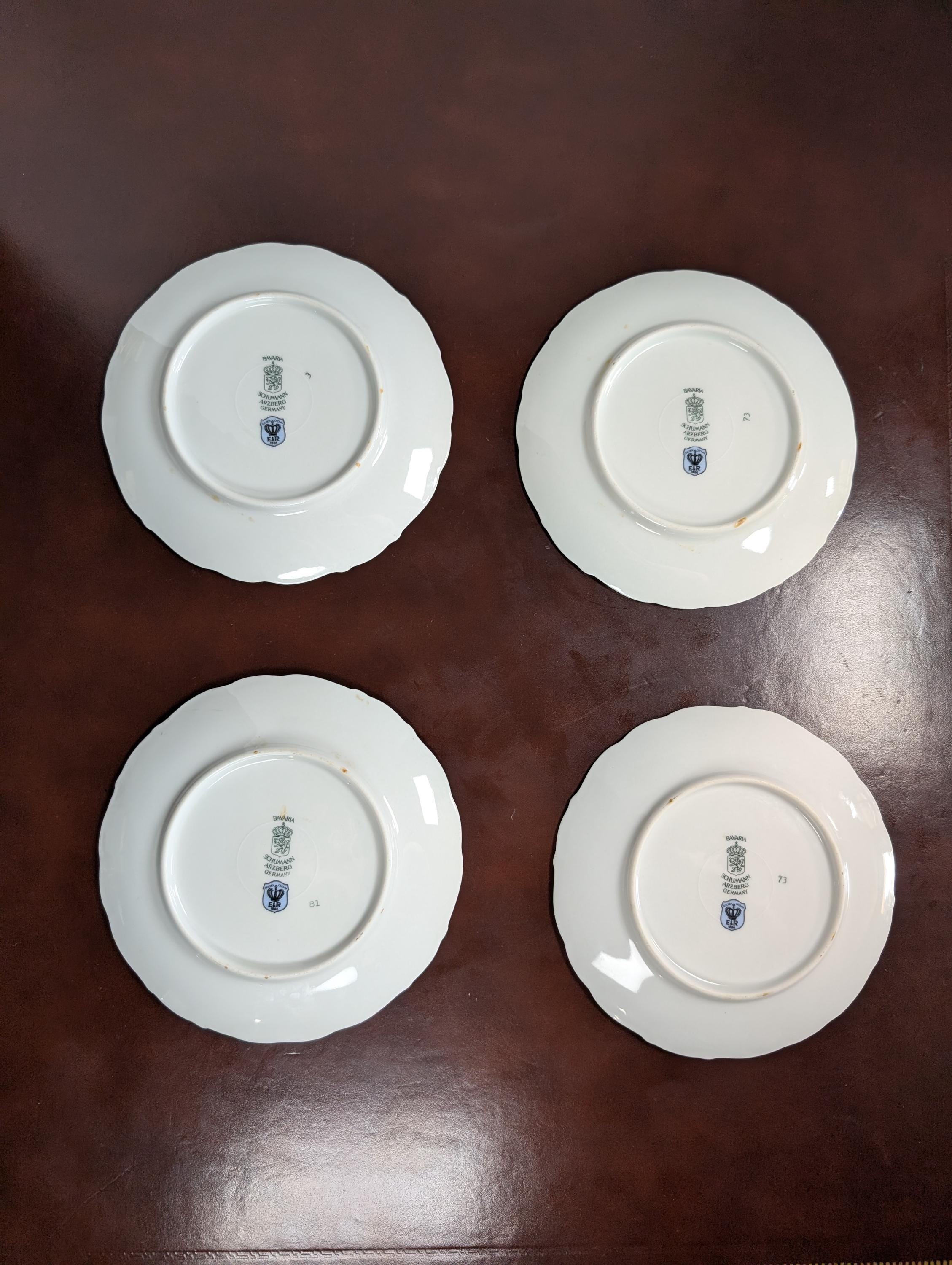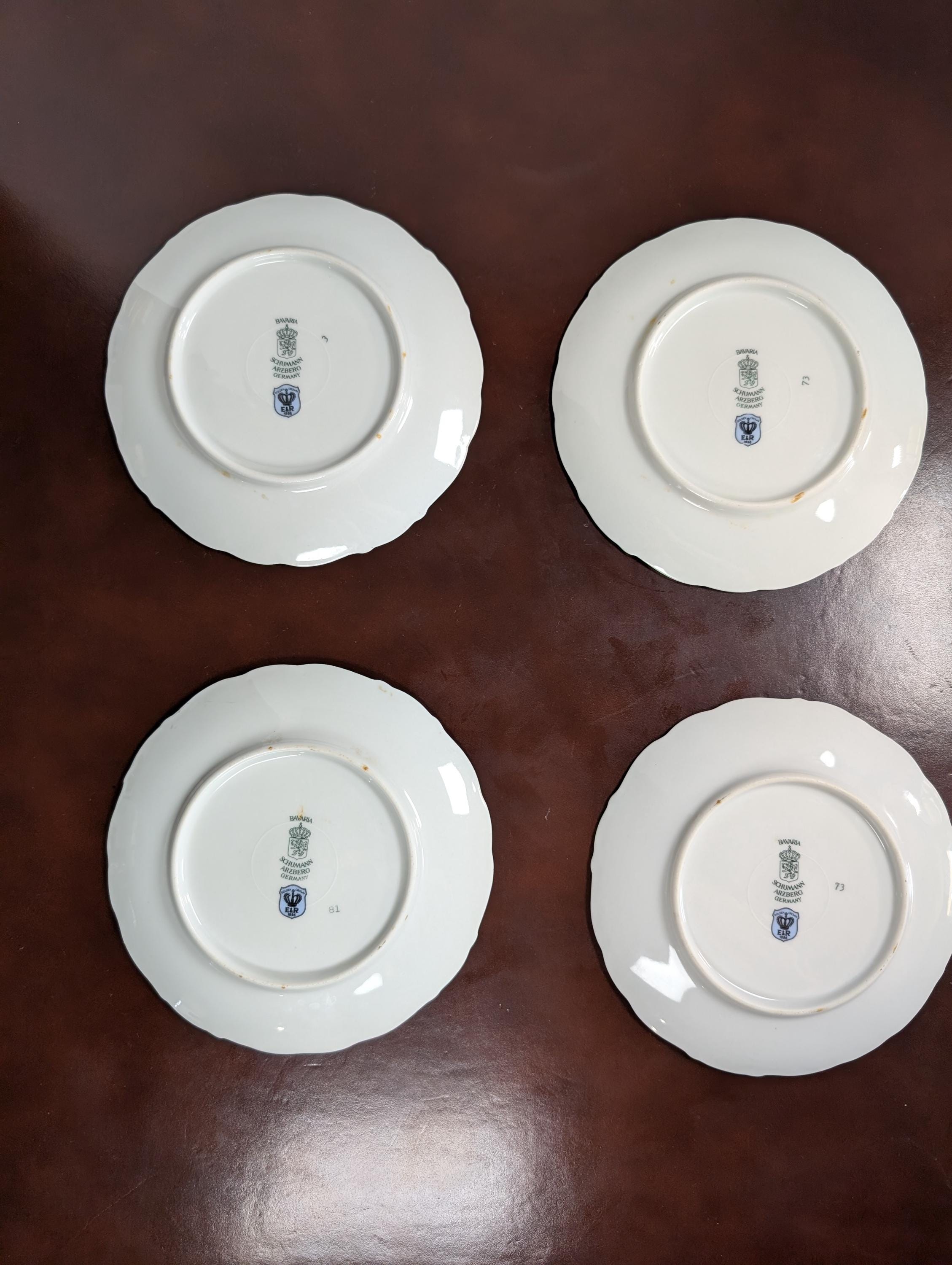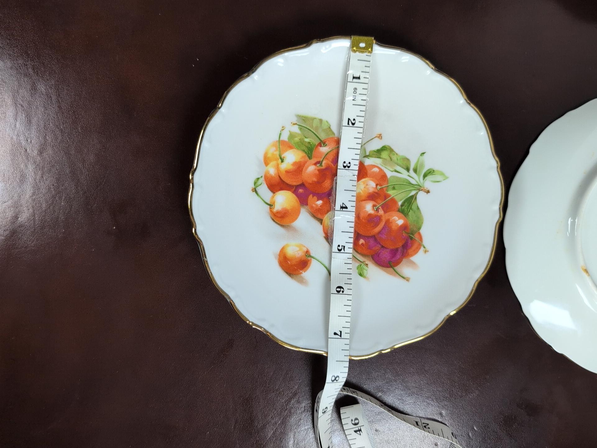 Four beautiful vintage fruit plates with scalloped edges and gold trim . Very Minor wear . Backs do have some discoloration areas see photos from being in a hanging plate rack. No chips or cracks.X31