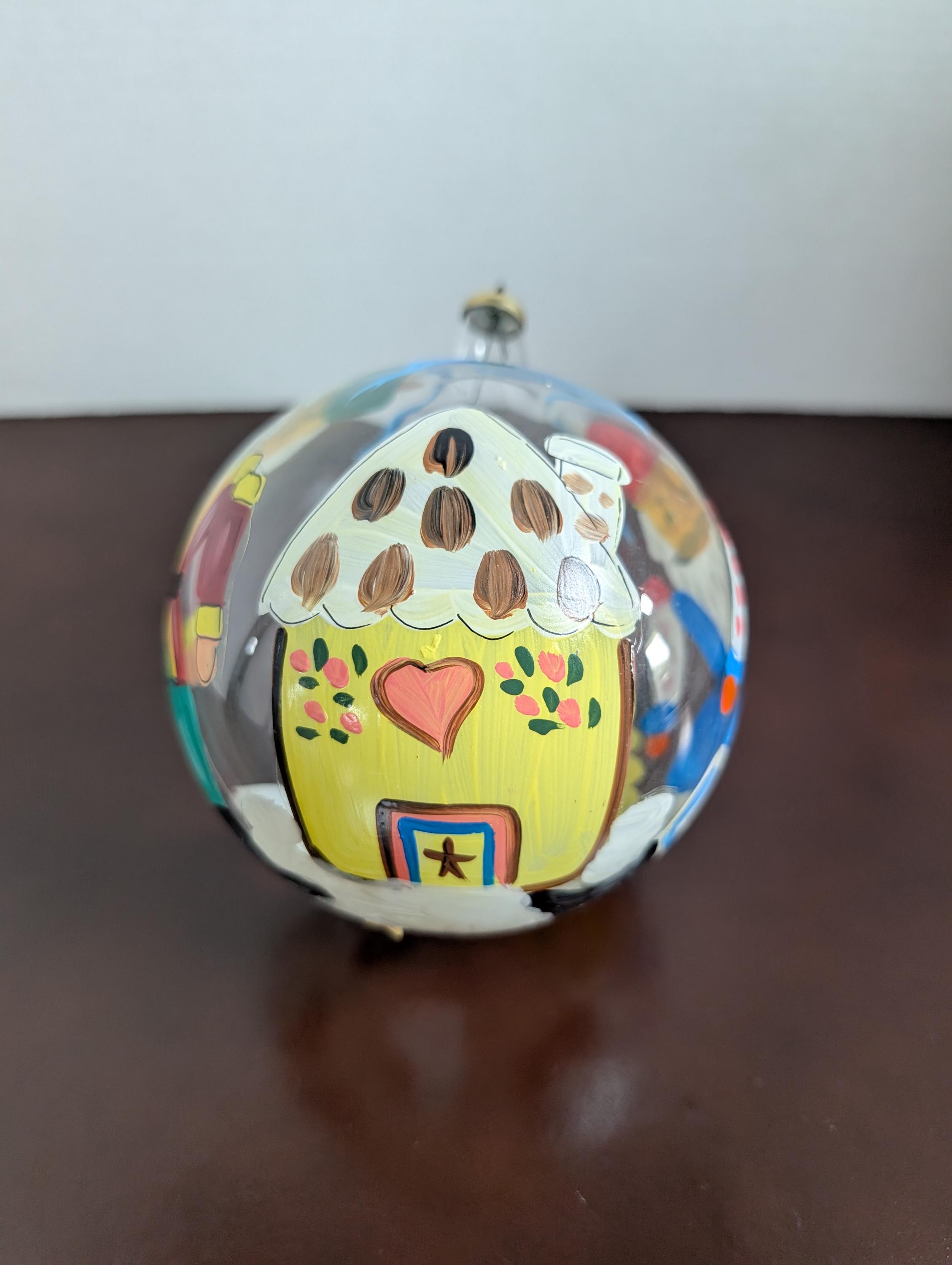 Bring the charm of an Old World Christmas to your tree with this stunning, large-scale blown glass ornament. Exquisitely hand-painted in Italy, this piece features a vibrant, wrap-around scene including a classic Nutcracker, a traditional village cottage, and festive characters. The clear glass allows your tree lights to shine through, beautifully illuminating the bold reds, blues, and golds of the artisan's brushstrokes.