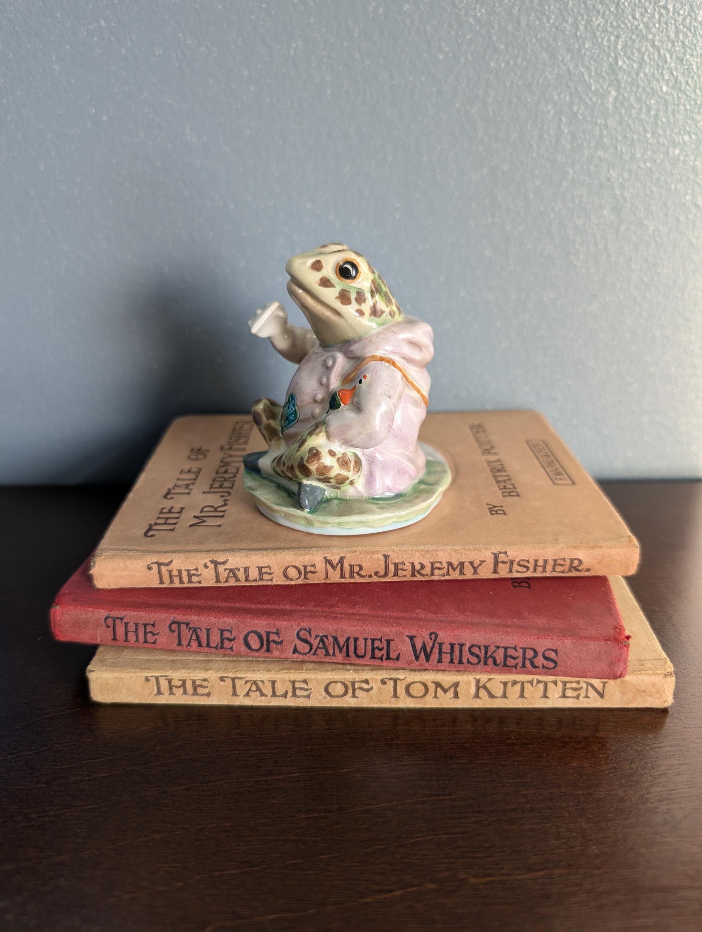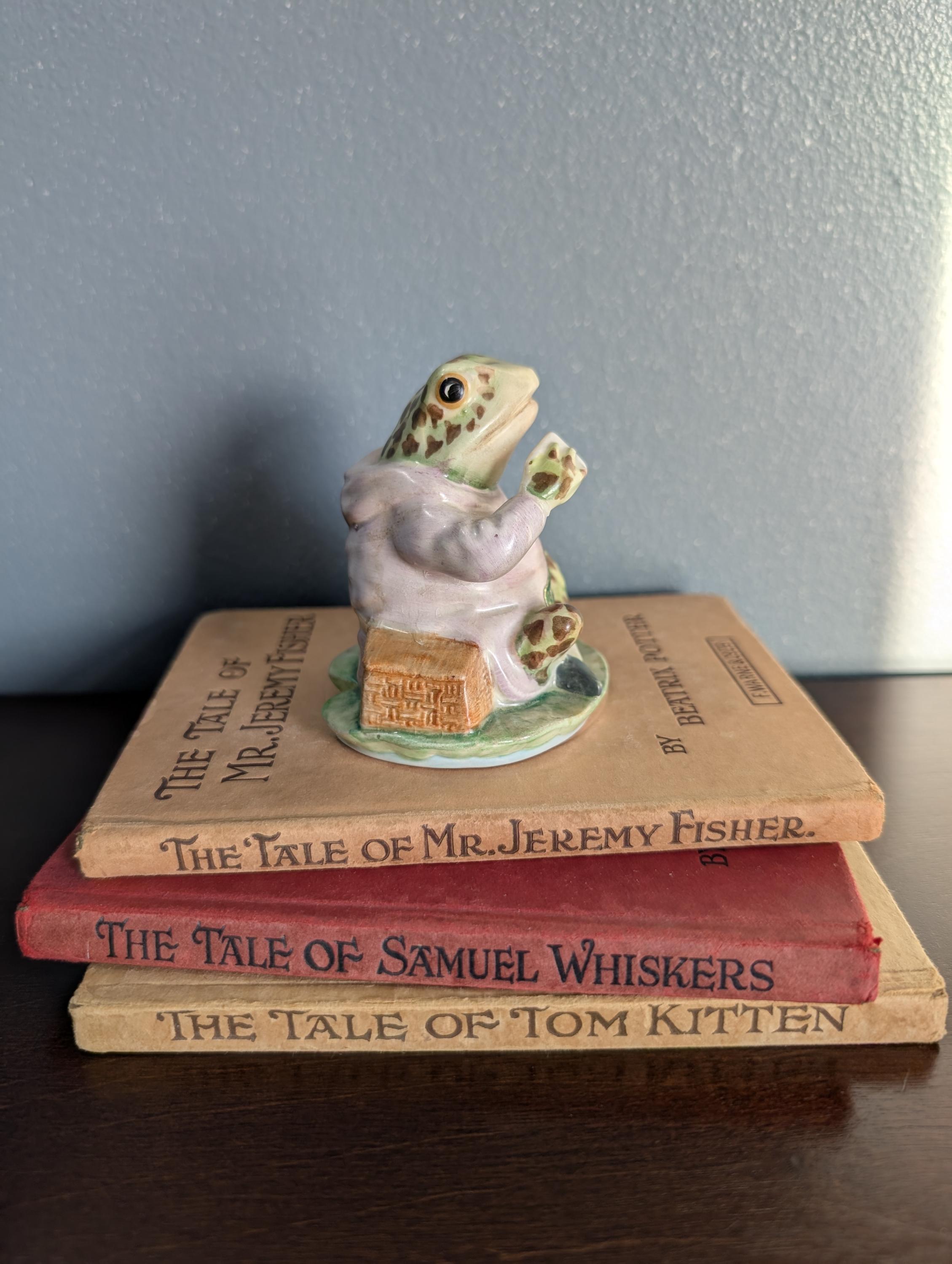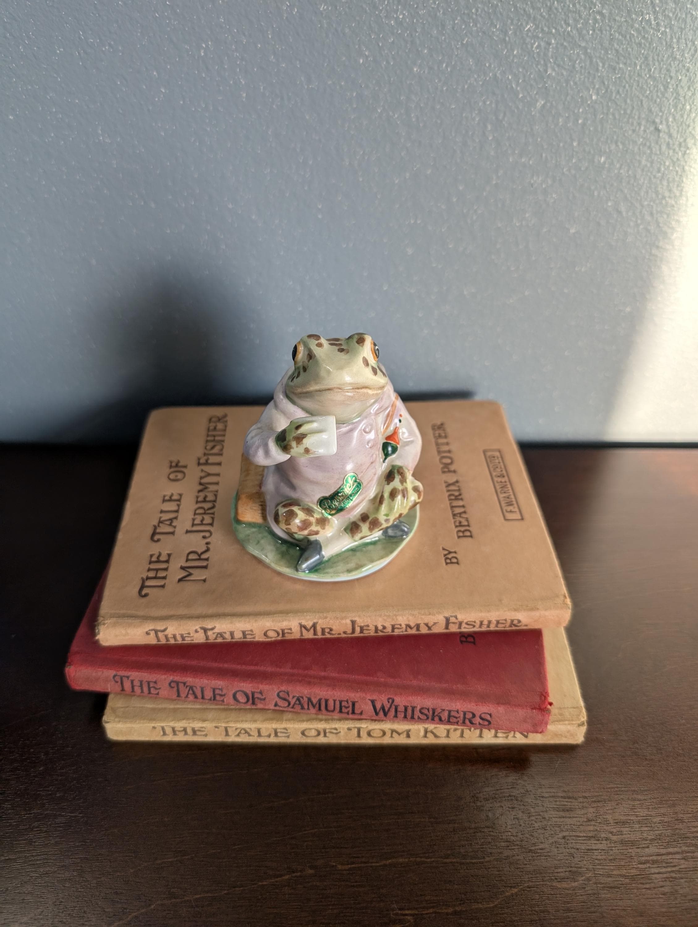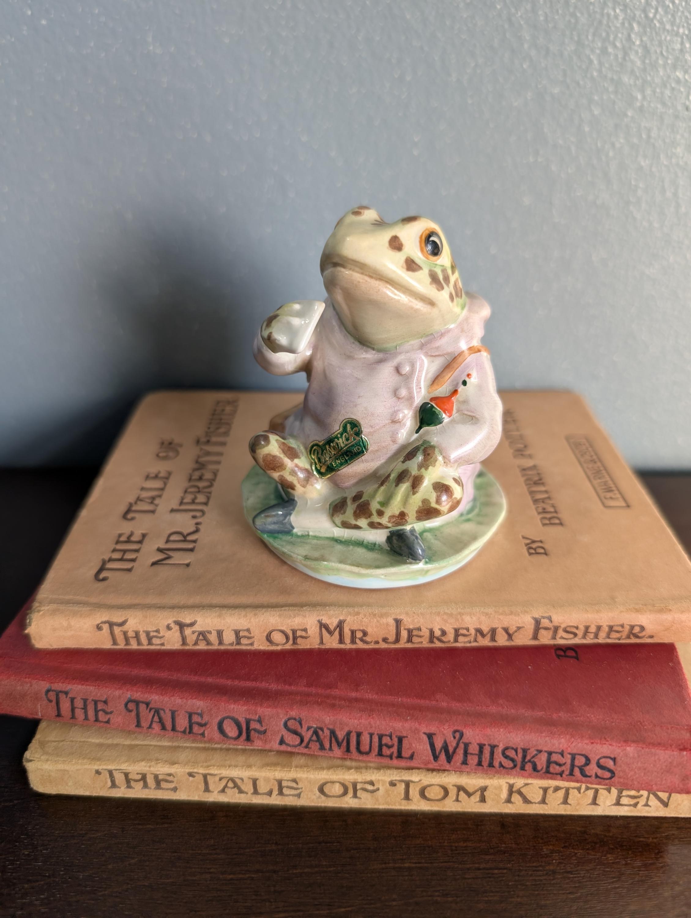 Step back into the world of Beatrix Potter with this exquisite Jeremy Fisher figurine. Dressed in his purple top with a lure tossed over his shoulder he is pure mid-century English craftsmanship.