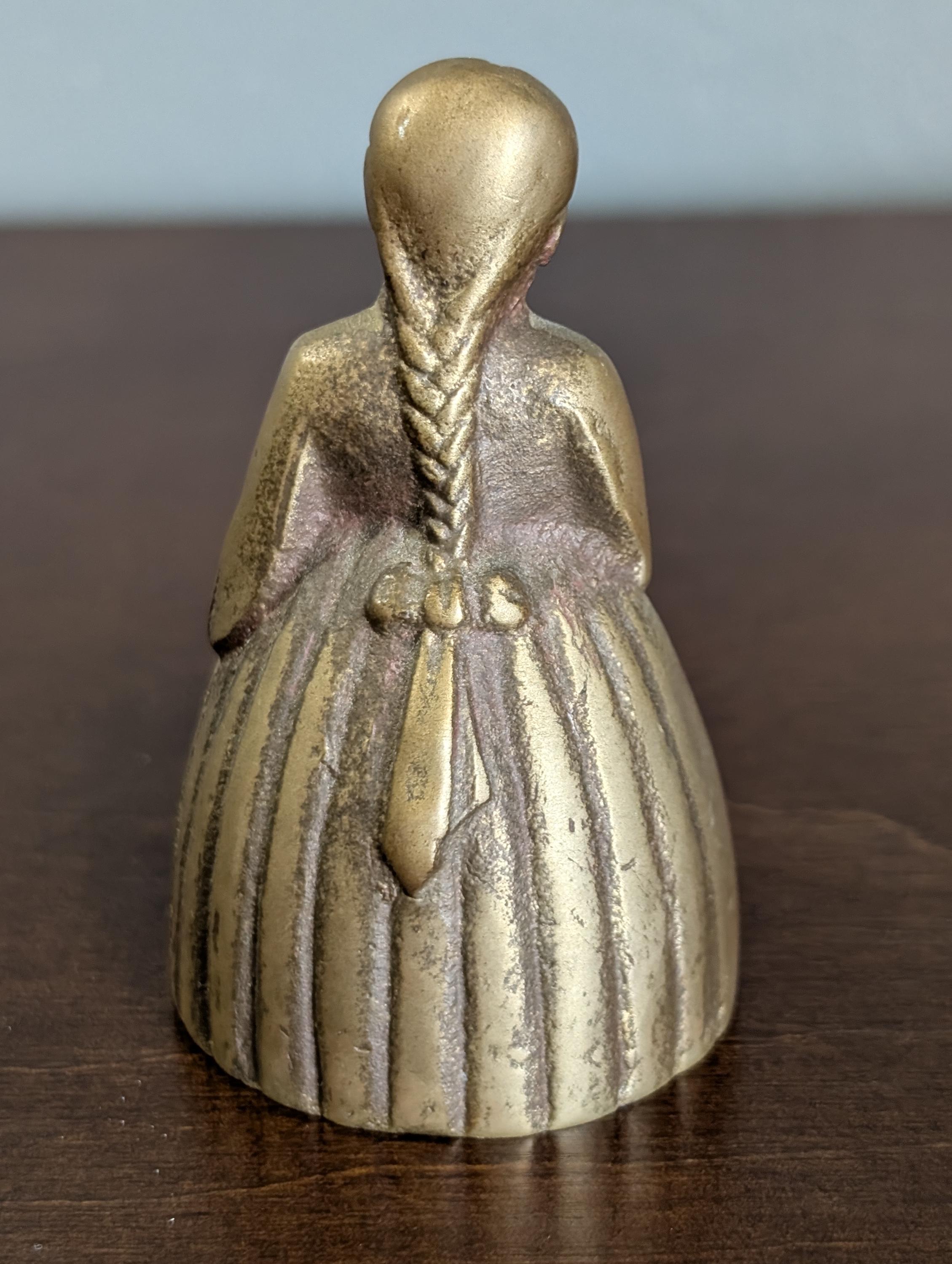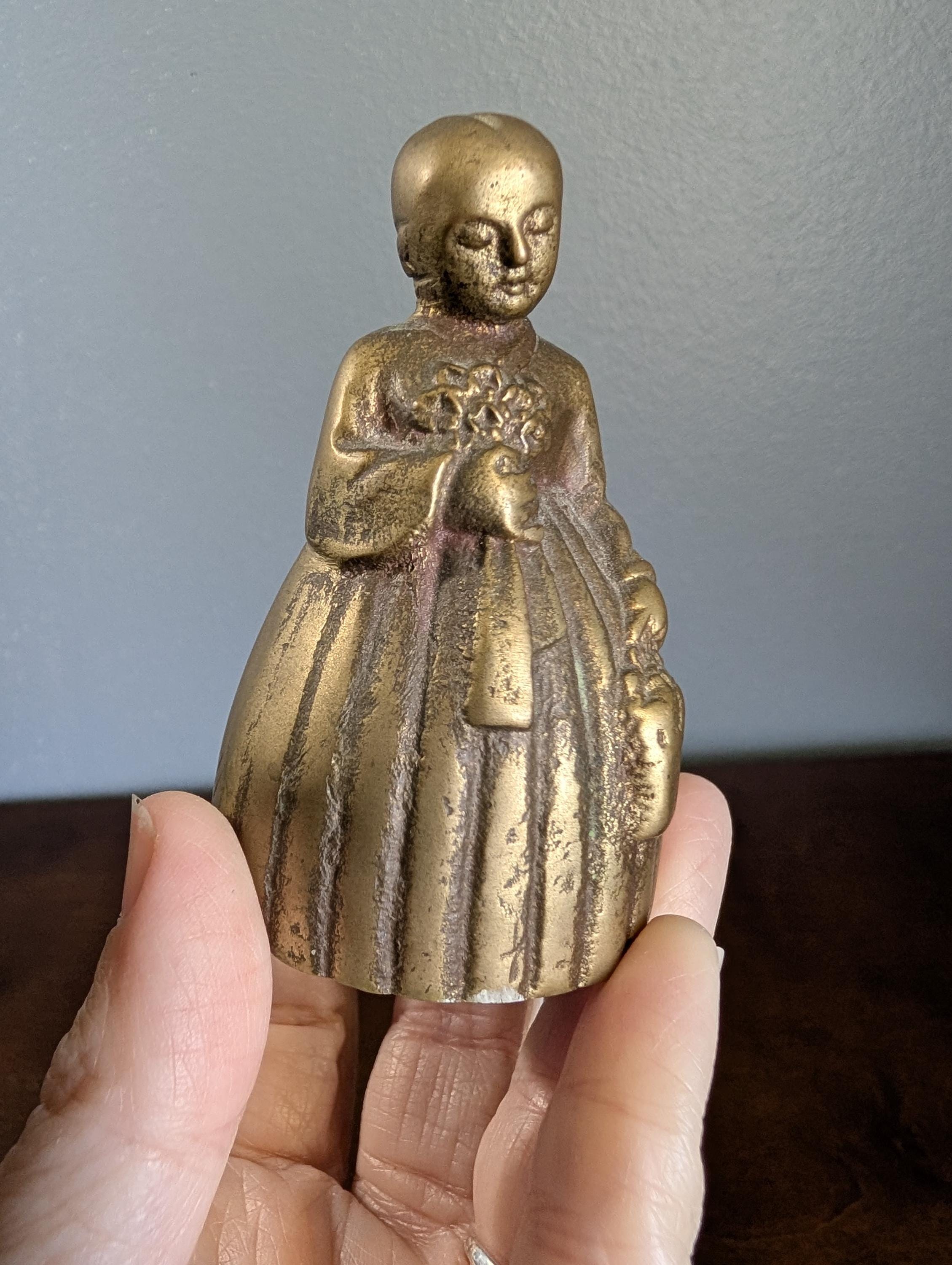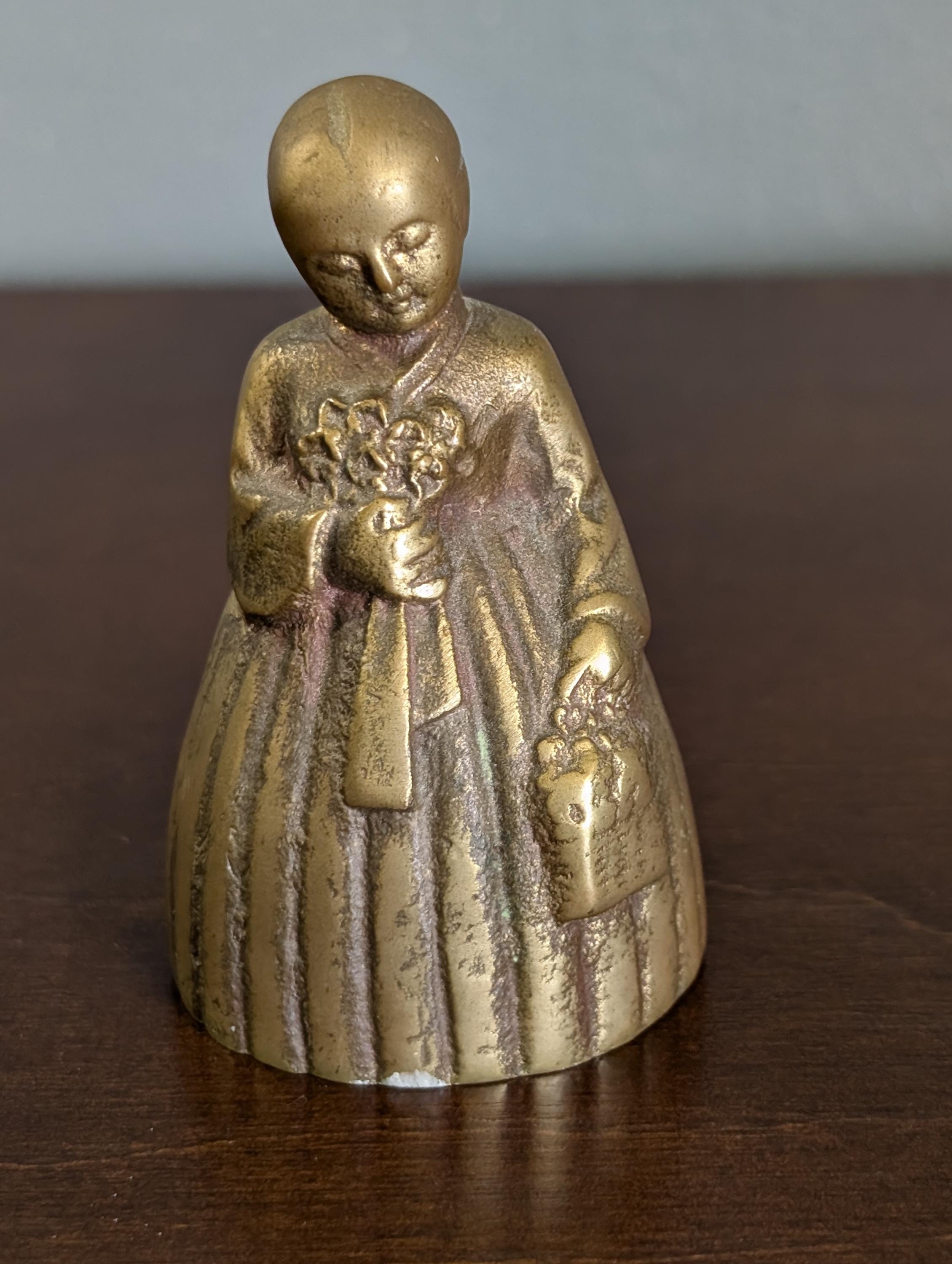 This charming solid brass bell features a sweet girl holding a bouquet of flowers and a small basket. It has a beautiful aged patina and a clear, pleasant ring that adds a touch of vintage character to any shelf.