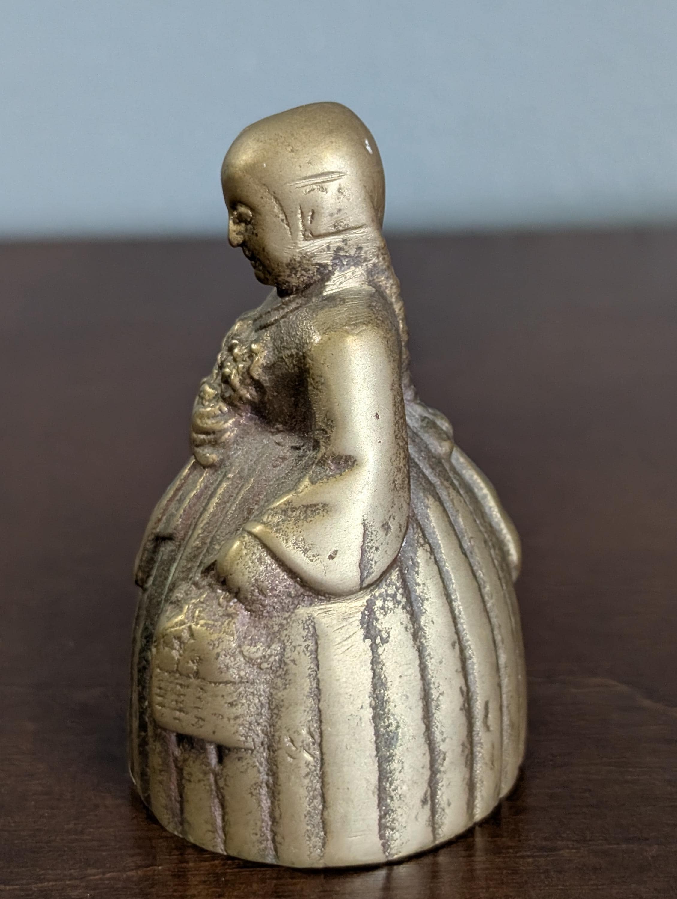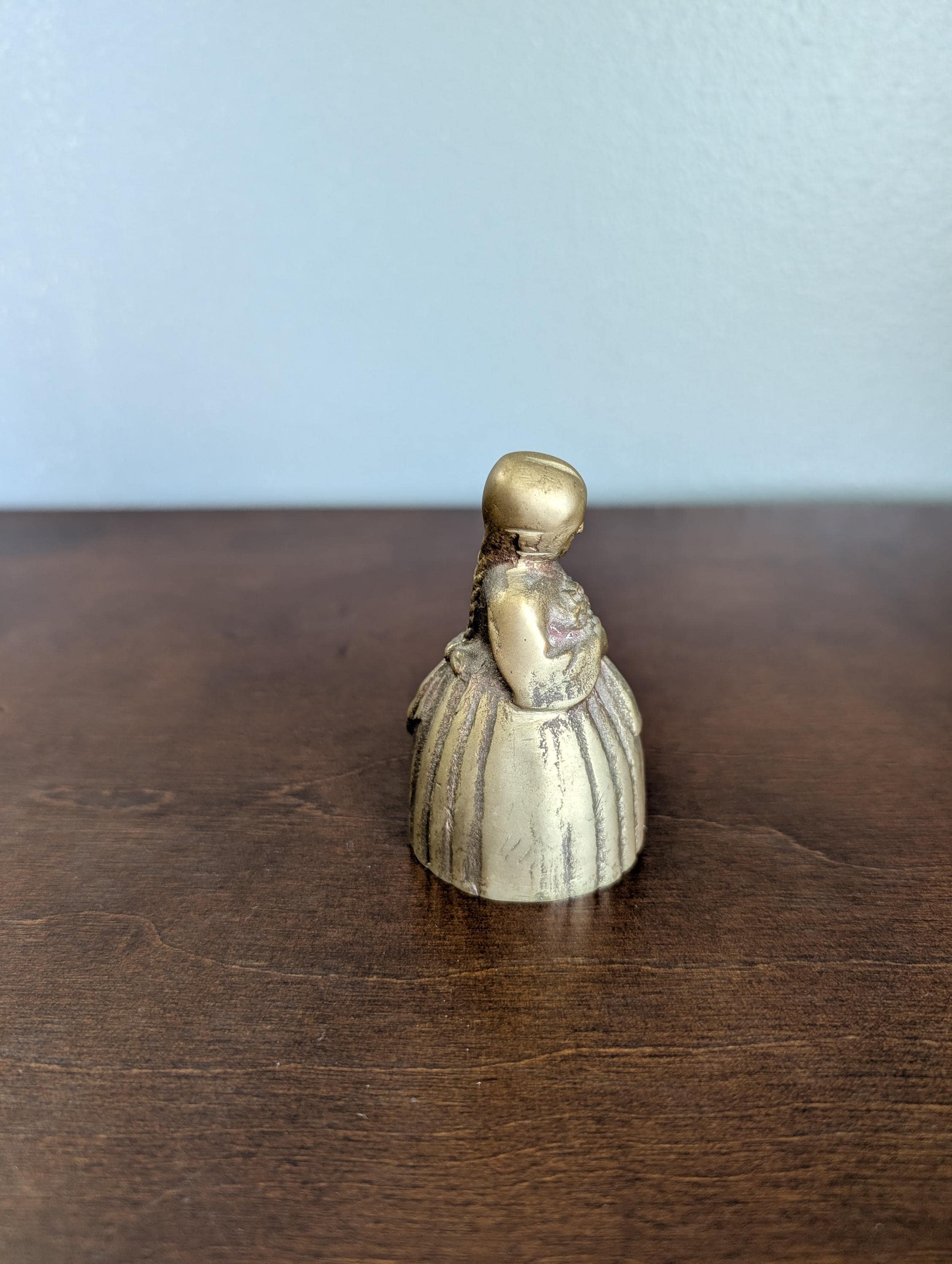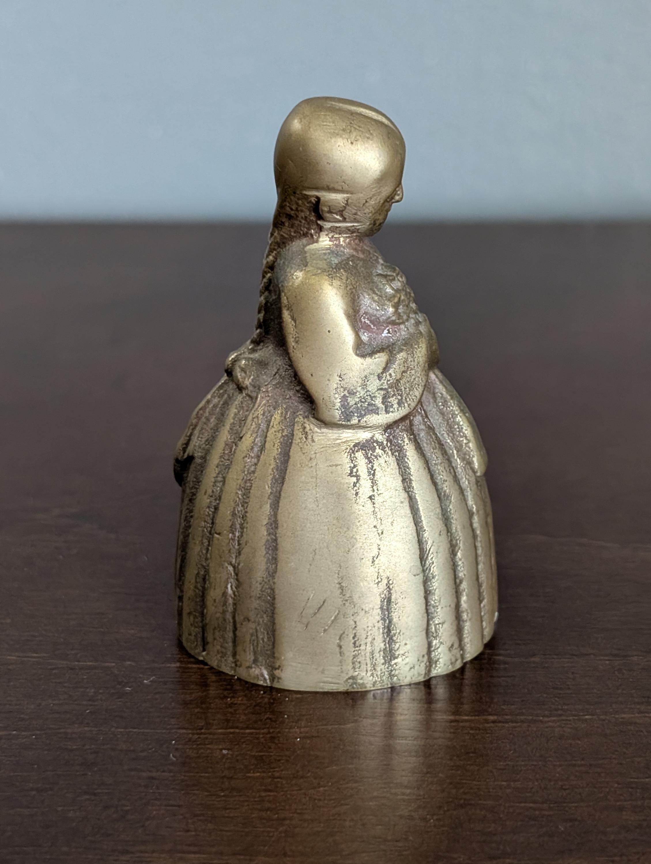 This charming solid brass bell features a sweet girl holding a bouquet of flowers and a small basket. It has a beautiful aged patina and a clear, pleasant ring that adds a touch of vintage character to any shelf.