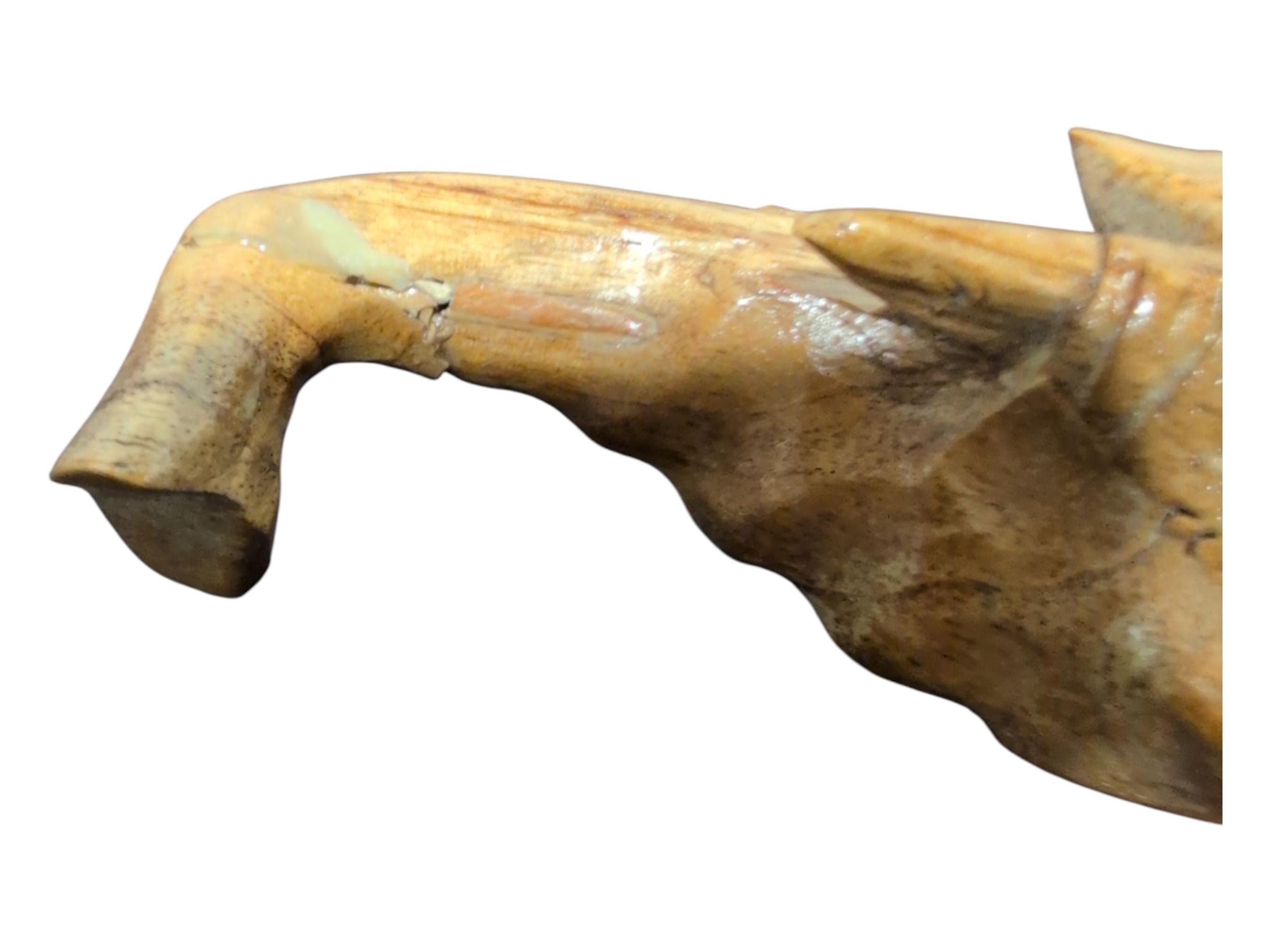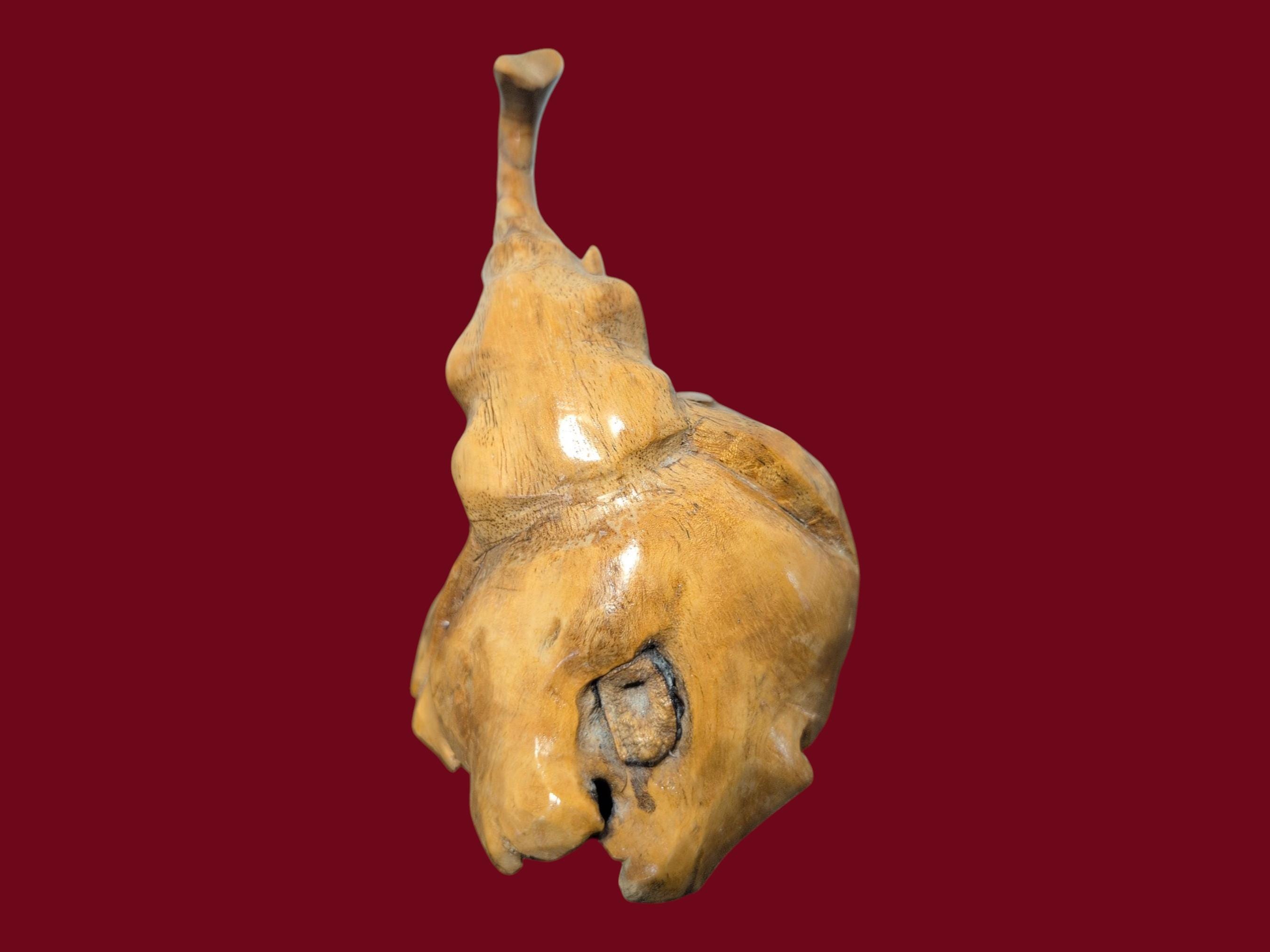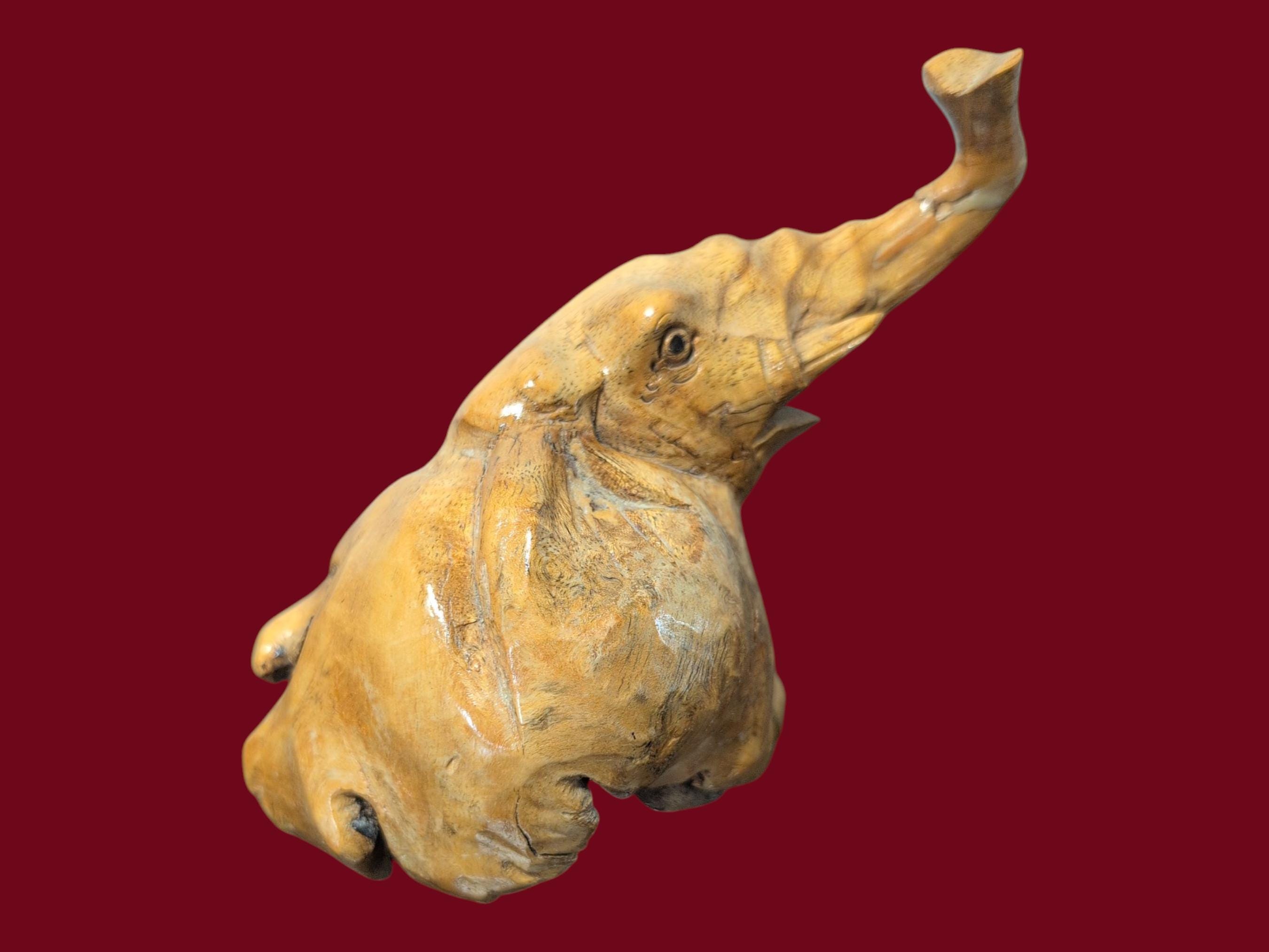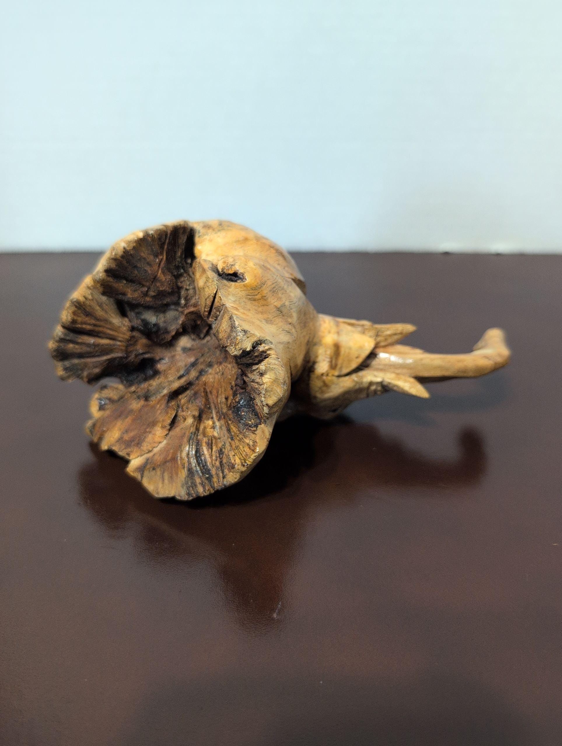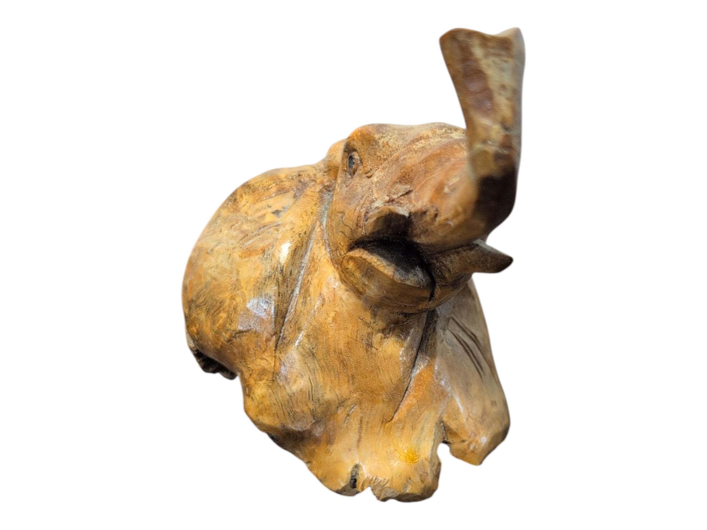 Discover this truly unique and captivating hand-carved elephant, meticulously crafted from natural parasitic tree wood. Its organic form and intricate details make it a one-of-a-kind statement piece for any home or office. In good vintage condition but it looks as if the carver did a repair on the trunk as it's a repaired crack around the end of the trunk.See photos for the repair. The repair is an old one and very sturdy. 4 1/2" inches tall . 6 inches long. X52