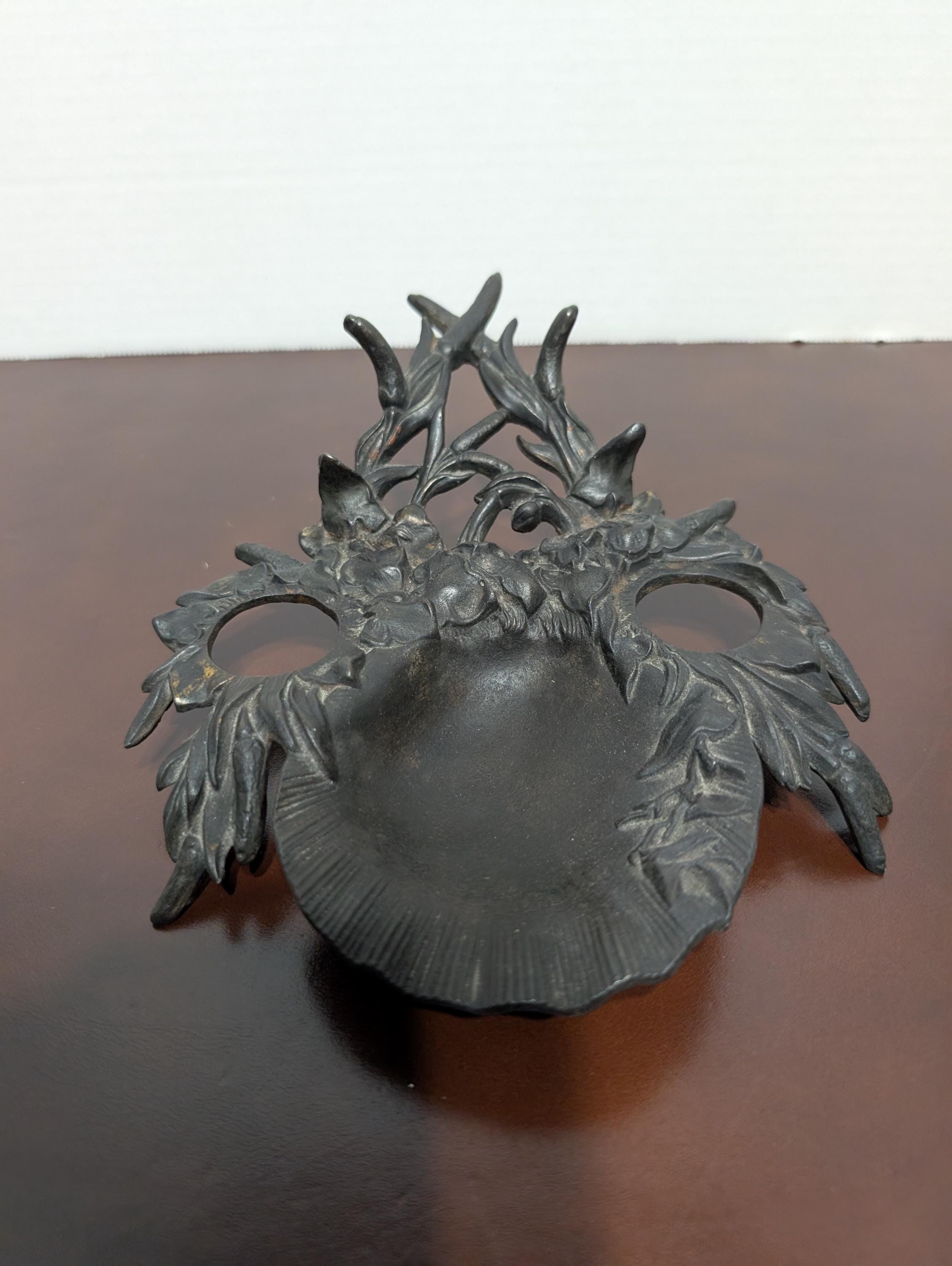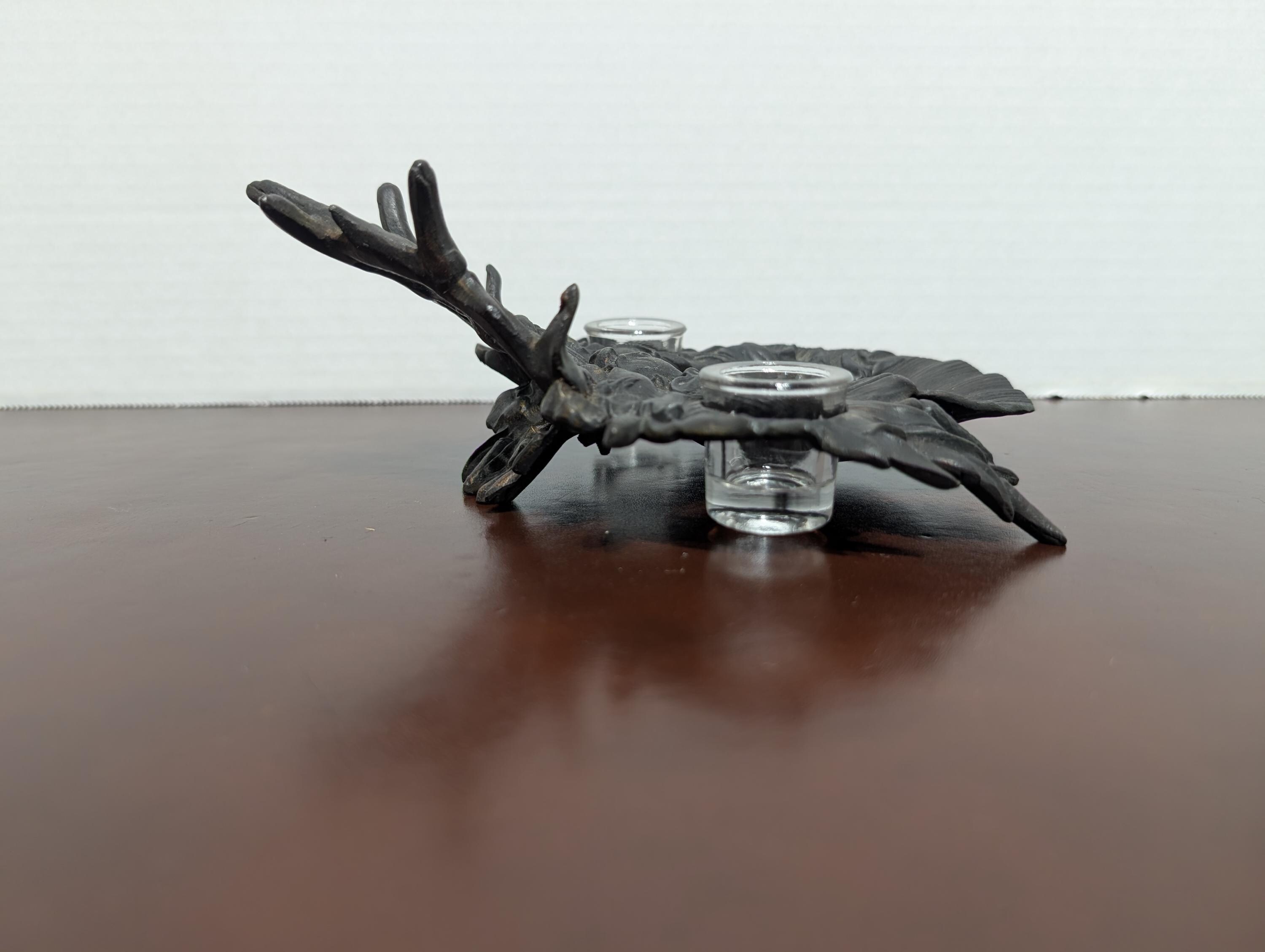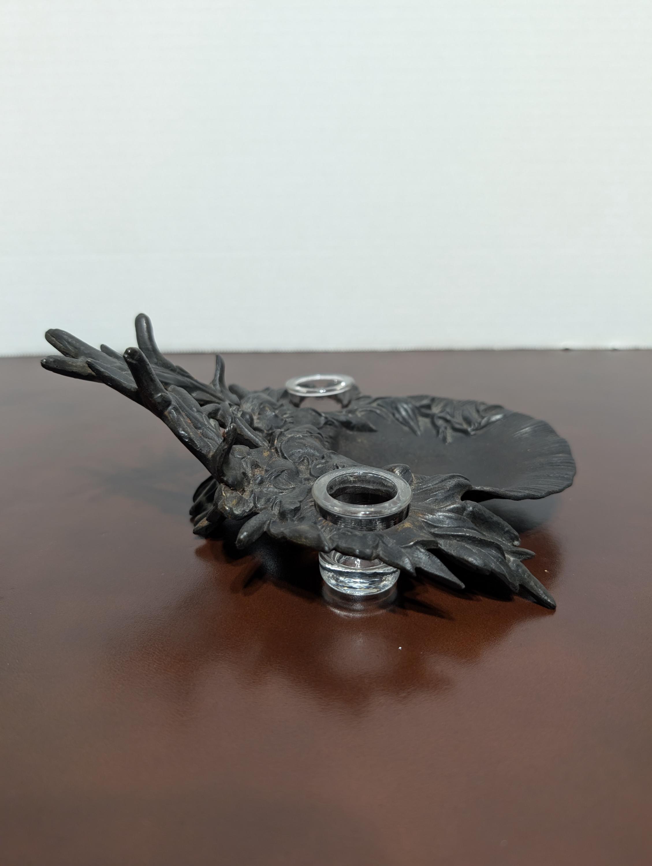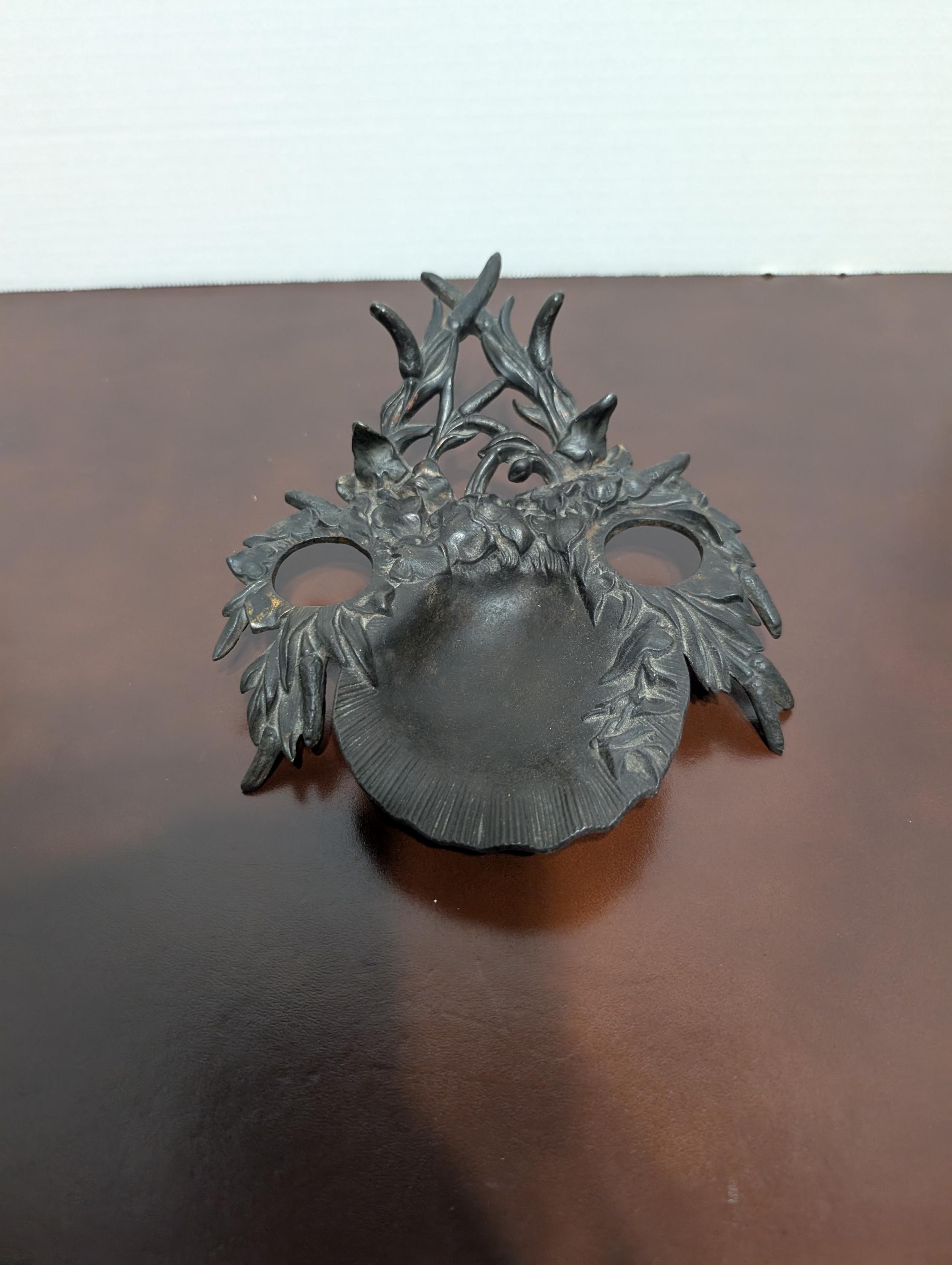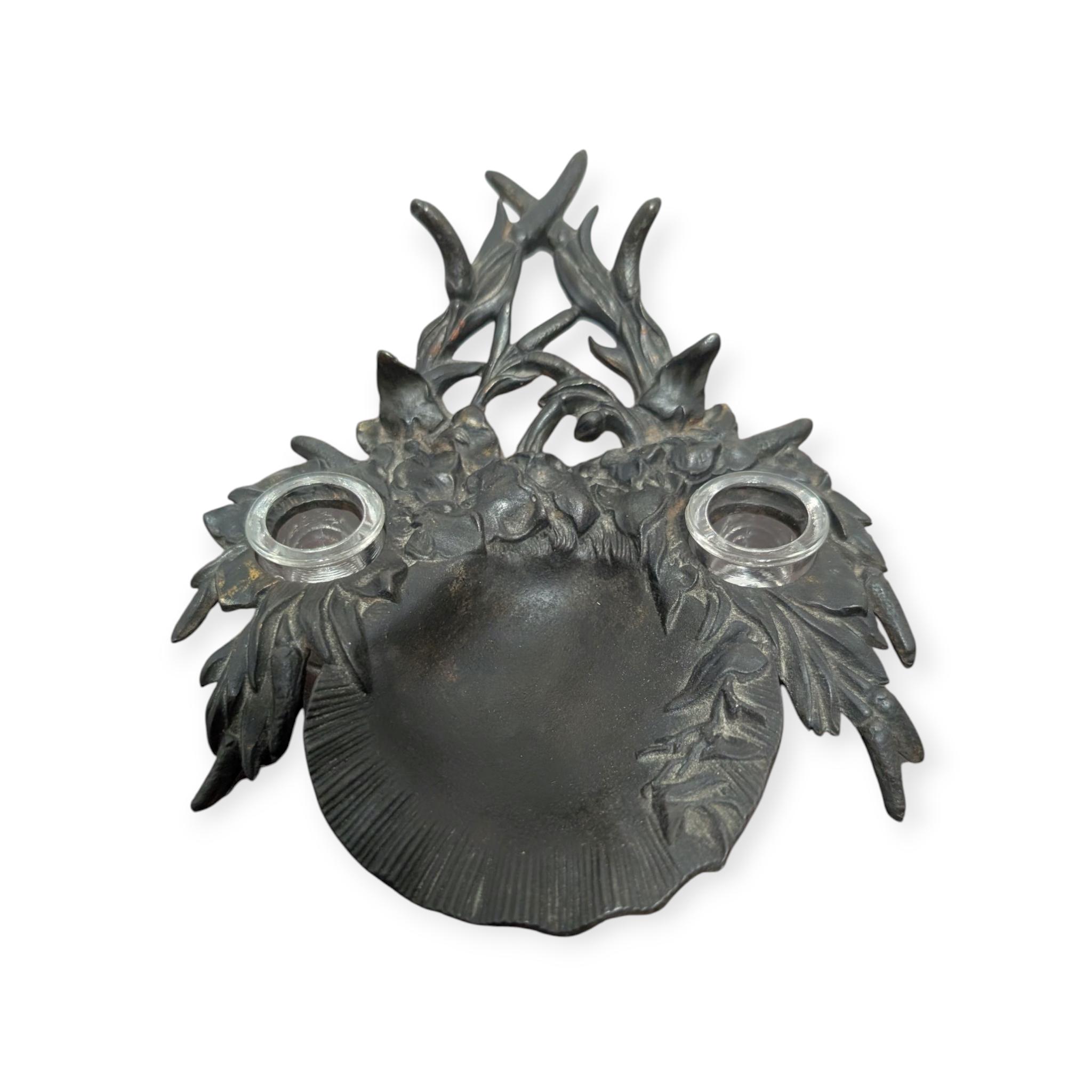 Step back in time to the elegant turn-of-the-century with this exquisite antique double inkwell by the renowned German foundry, E.G. Zimmermann. This piece is more than a functional desk accessory; it's a testament to the masterful craftsmanship that made Zimmermann a leading name in cast metal decorative arts from their Hanau workshop. This stunning inkstand features a beautifully detailed, cast metal design with a flowing Art Nouveau aesthetic. The base is an ornate landscape of foliage and flowers, forming a natural, graceful frame for the two original glass inkwells. The central area serves as a pen rest, completing the stately and sophisticated look. The dark patina and heavy weight of the cast metal are hallmarks of an authentic Zimmermann piece and speak to its age and quality.This inkwell is in excellent antique condition for its age. It displays a lovely aged patina that highlights the intricate details of the design. The glass inkwell inserts are intact with some wear and scratches on the glass . Please see photos. This piece is approximately 7" inches wide and 3" inches tall . 7 1/2" inches long. X53