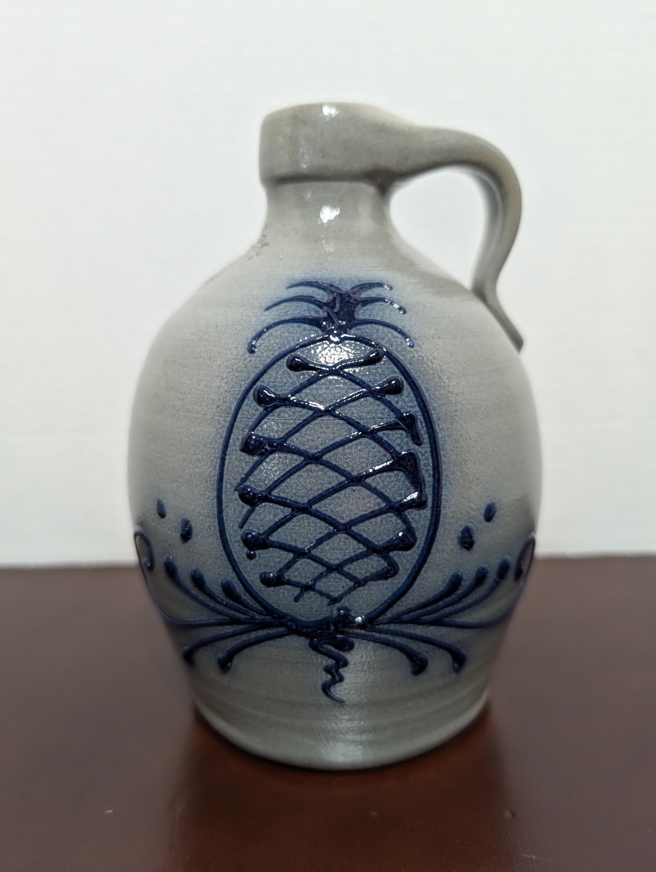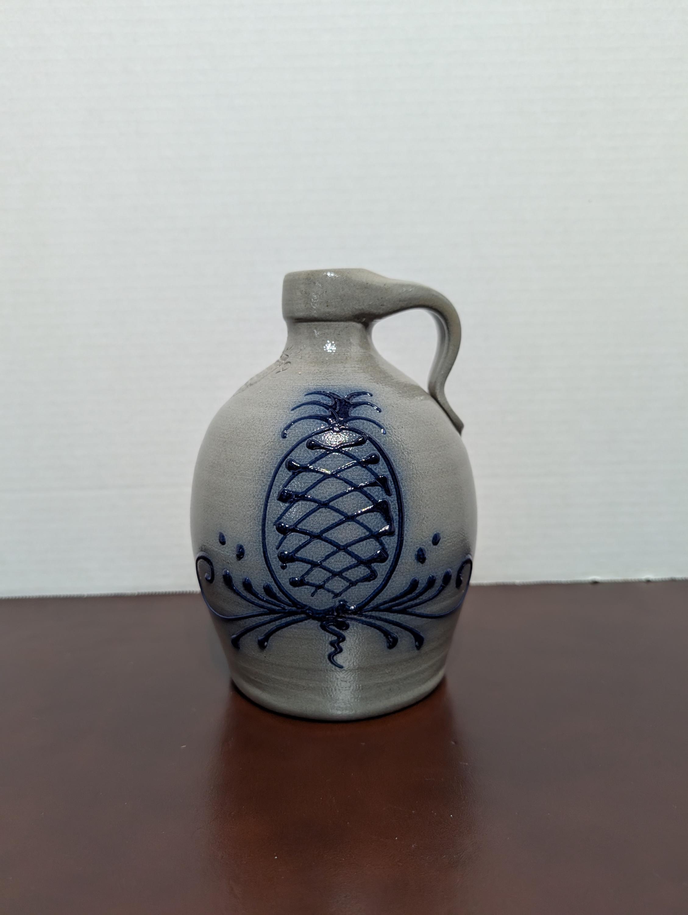 Handcrafted in 1989 in Monmouth, Illinois, this piece features the traditional grey salt-glaze finish synonymous with high-quality American stoneware. The front is adorned with a hand-painted cobalt blue pineapple—a traditional symbol of hospitality—making it the perfect accent piece for an entryway, kitchen, or dining room.