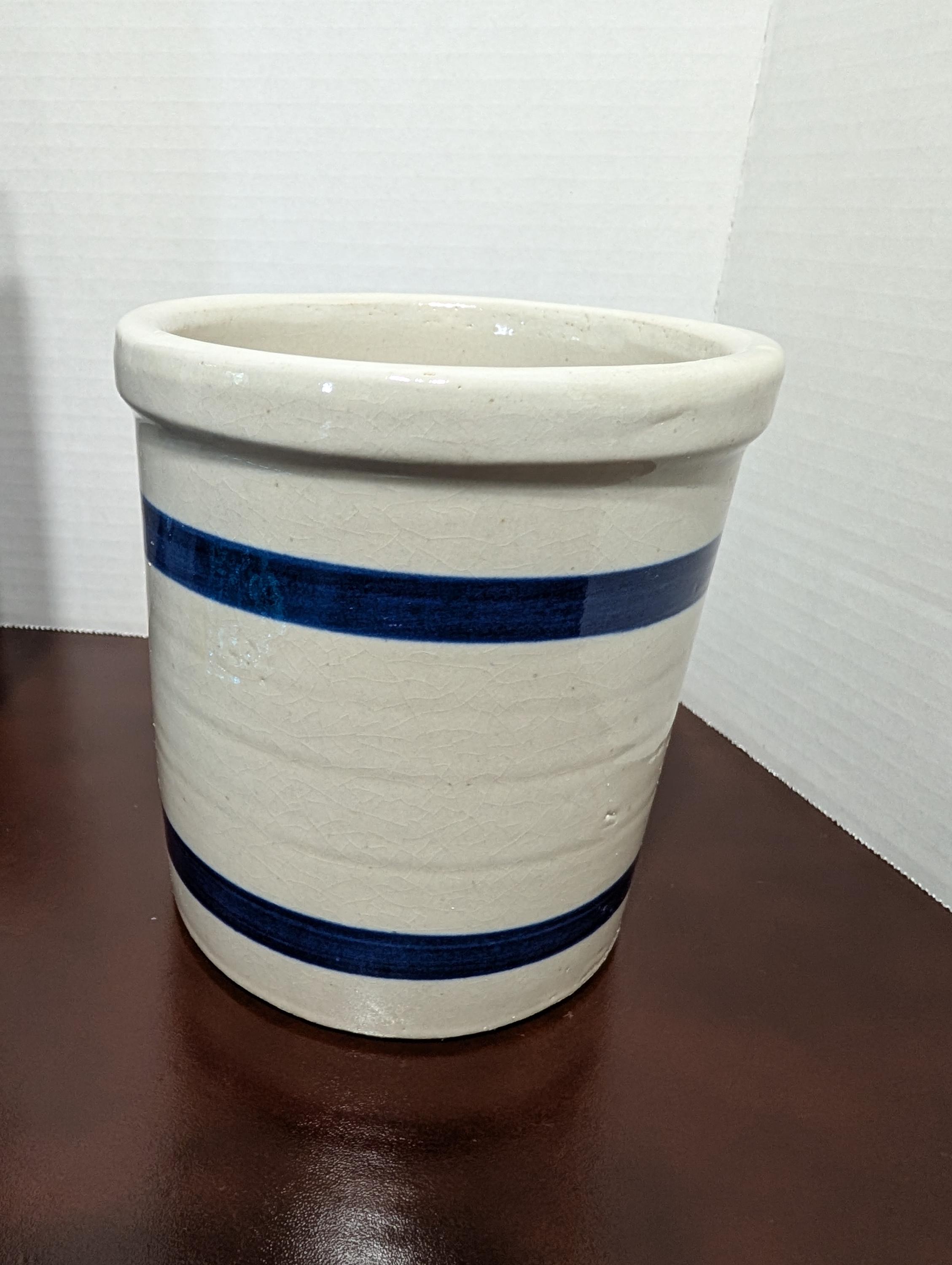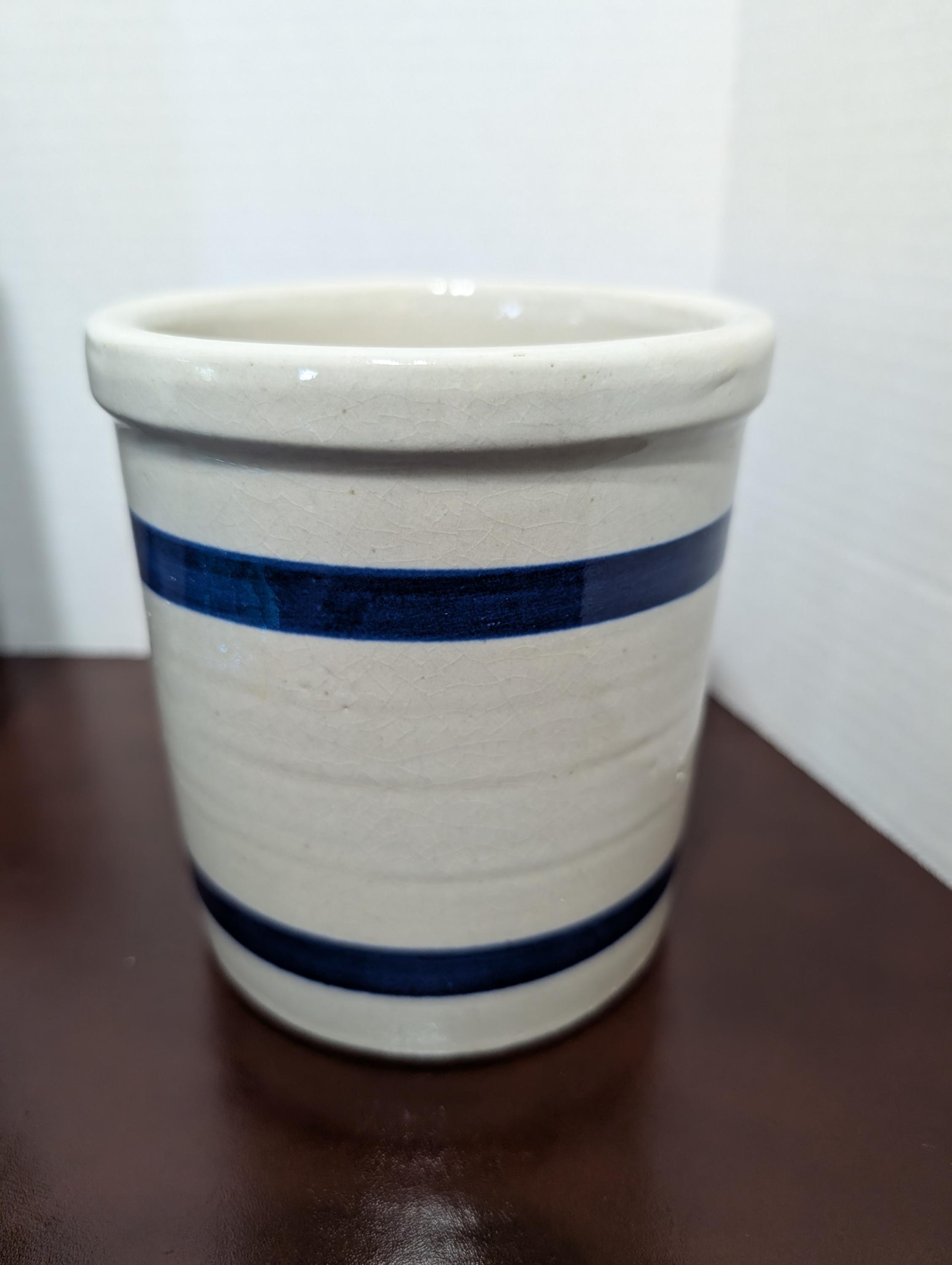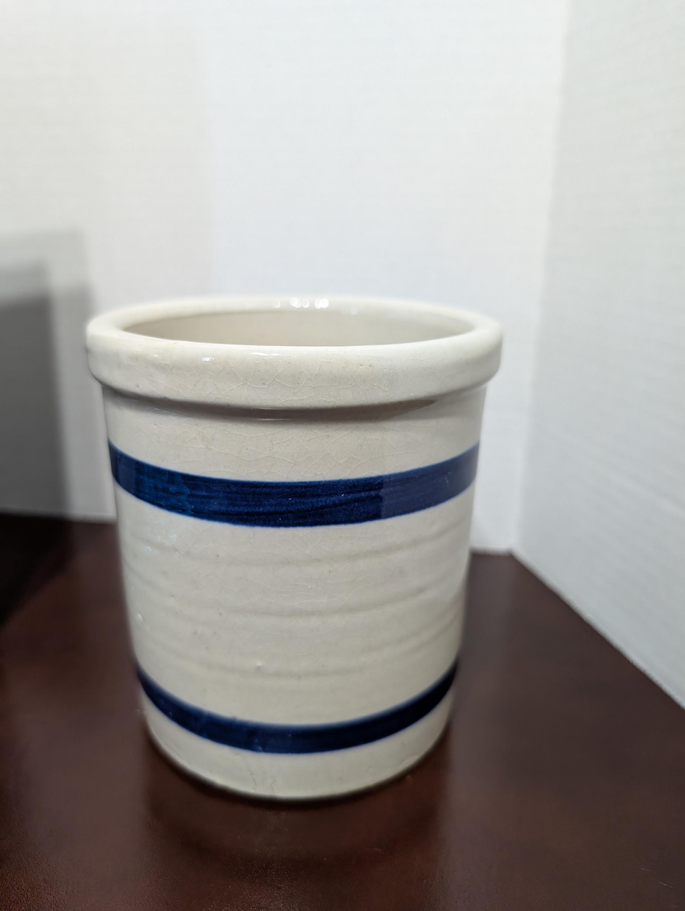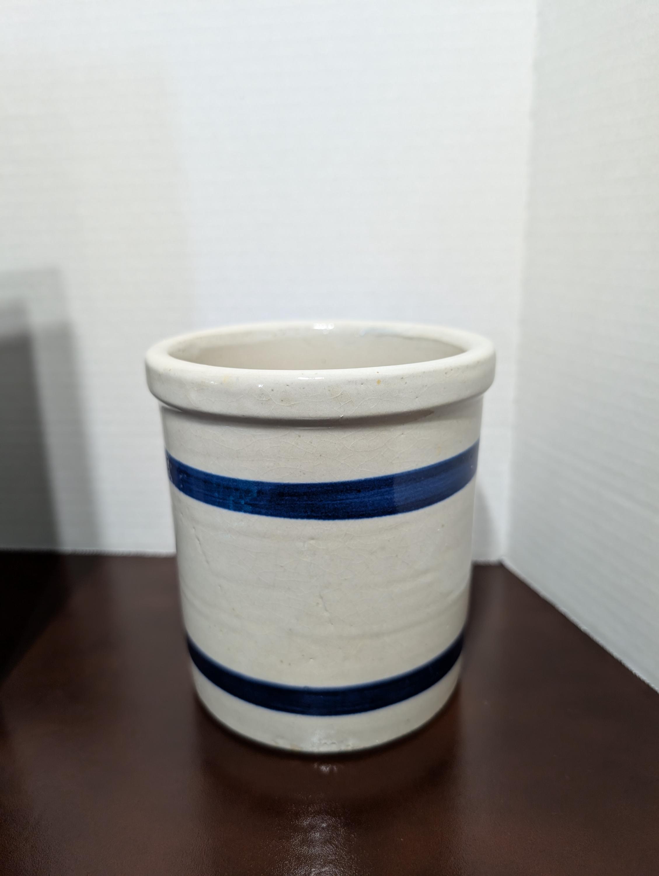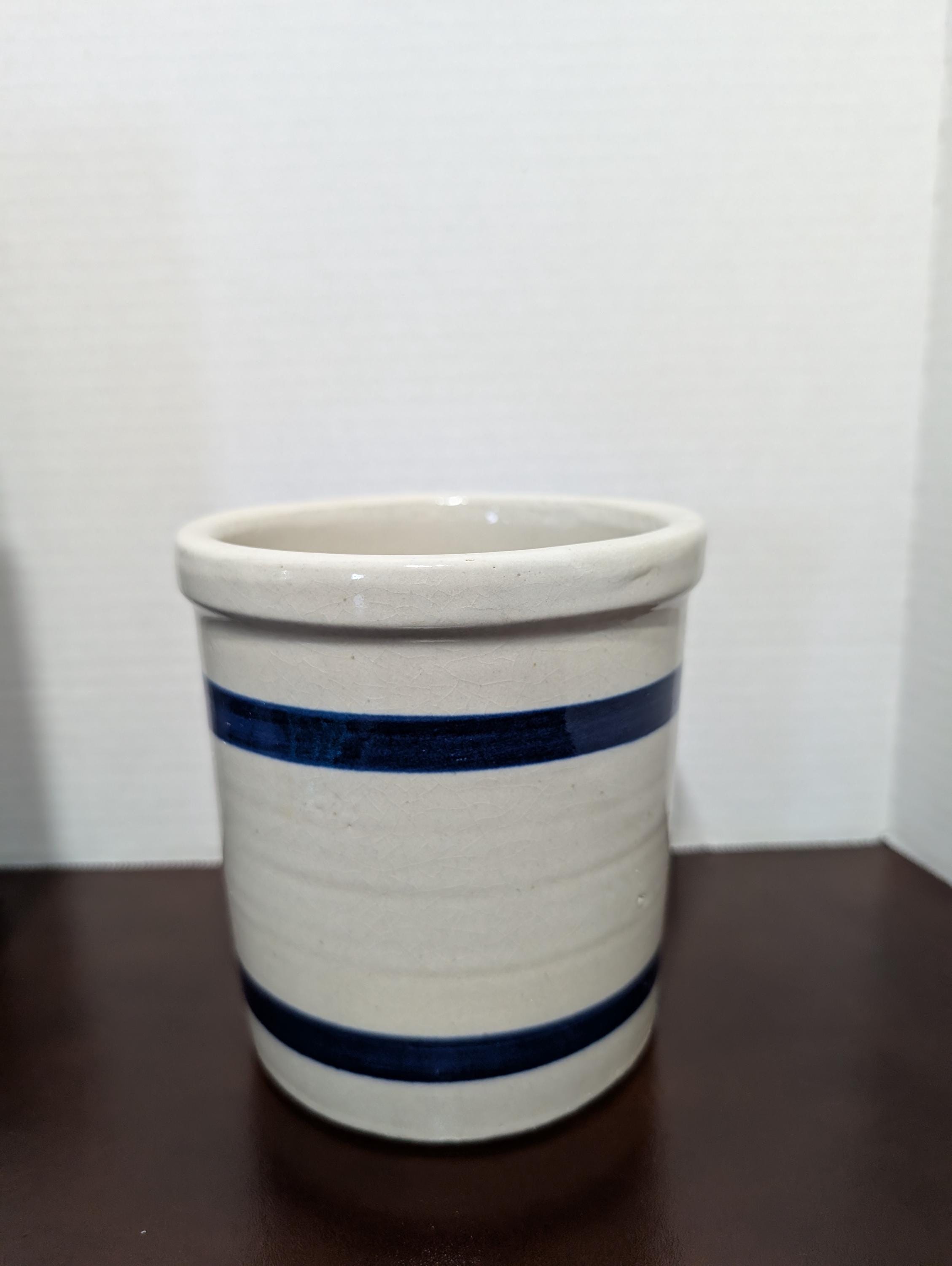 Add a touch of vintage charm to your kitchen with this lovely stoneware beater jar or crock. Featuring classic blue stripes on a creamy beige background, this piece exudes rustic appeal. Perfect for use as a utensil holder, small batch mixing crock, or simply as a decorative element in your farmhouse-style kitchen. This is a wonderful piece of handmade pottery, ready to become a treasured part of your collection or a unique home decor accent. In great used condition with typical wear of a vintage item. Approximately 5 1/2" inches tall and 5" inches wide.