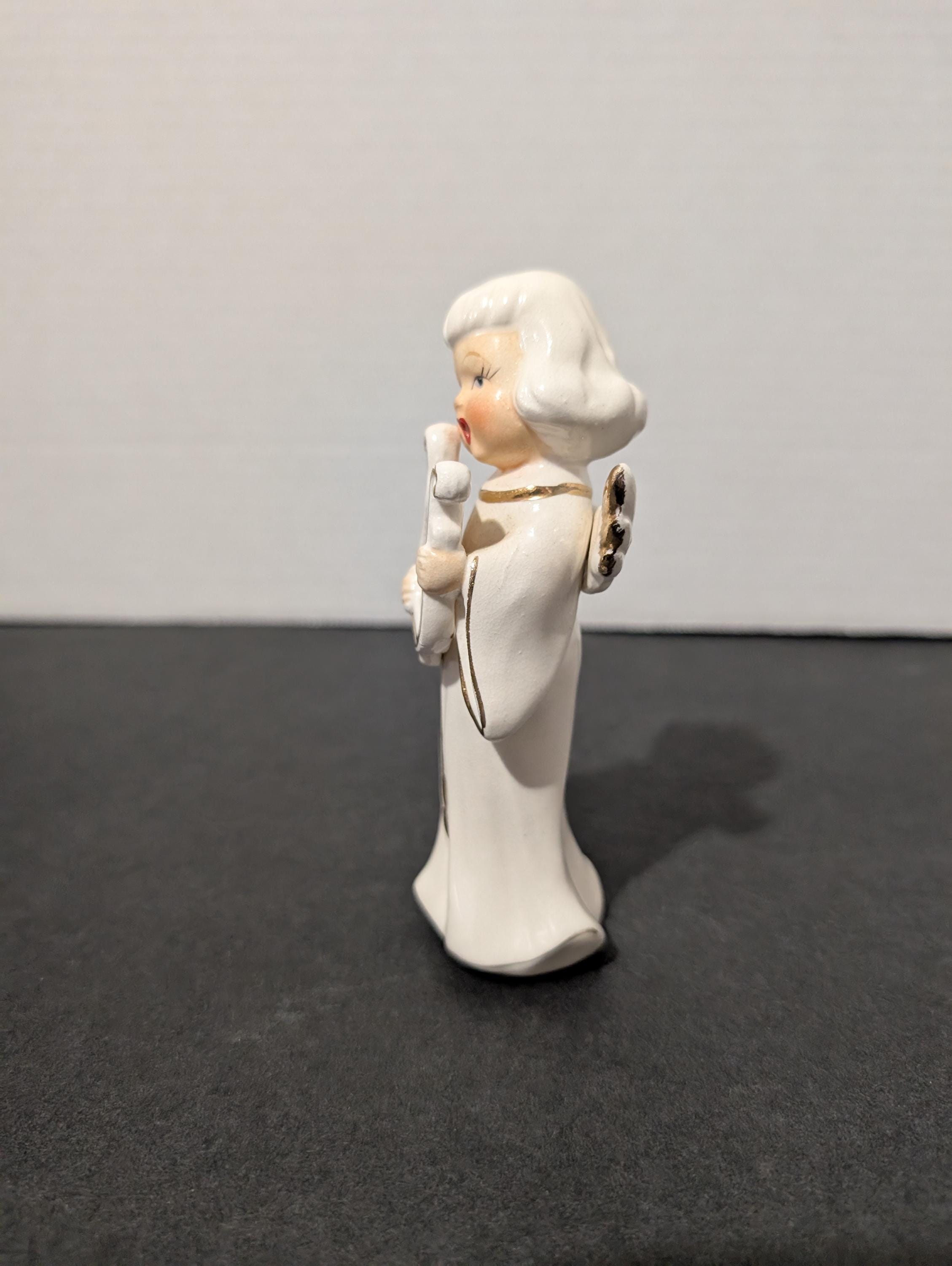 1950s Angel Figurine Playing Harp | Mid Century Modern Singing Angel White & Gold Ceramic