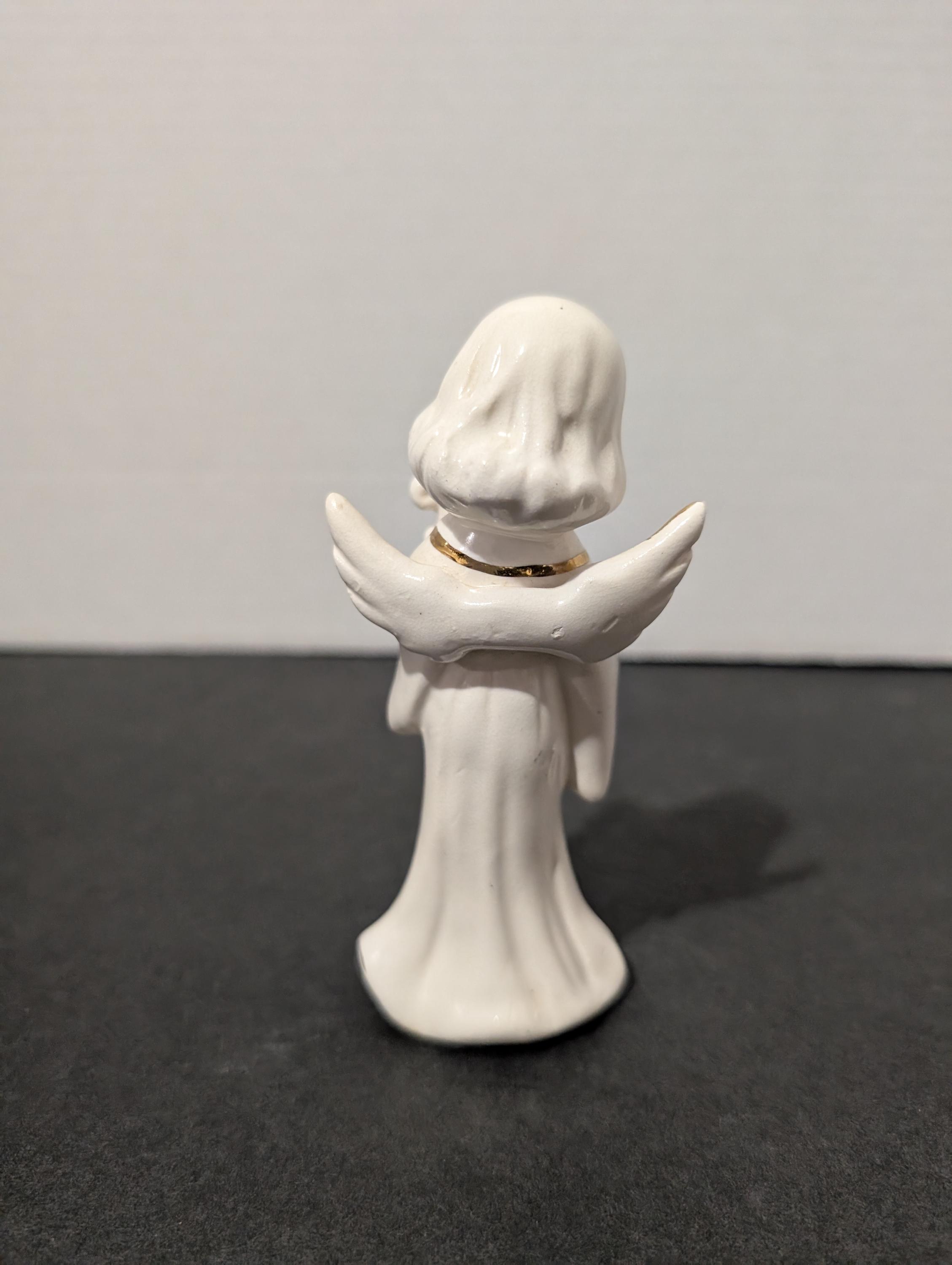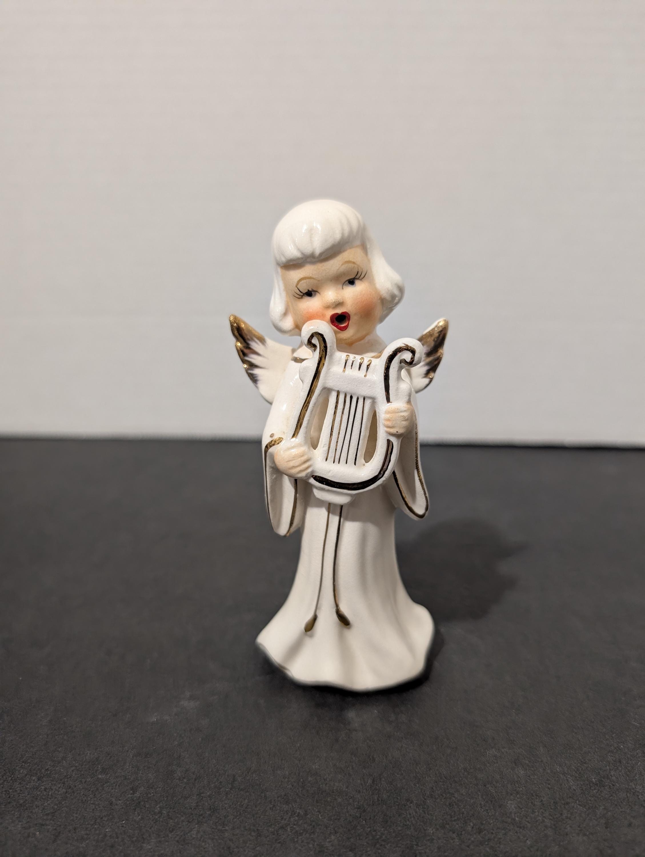 Add a touch of heavenly mid-century charm to your collection with this vintage porcelain angel figurine. Featuring a sweet, hand-painted face with a "singing" open mouth, this angel is captured playing a gold-accented harp (lyre).