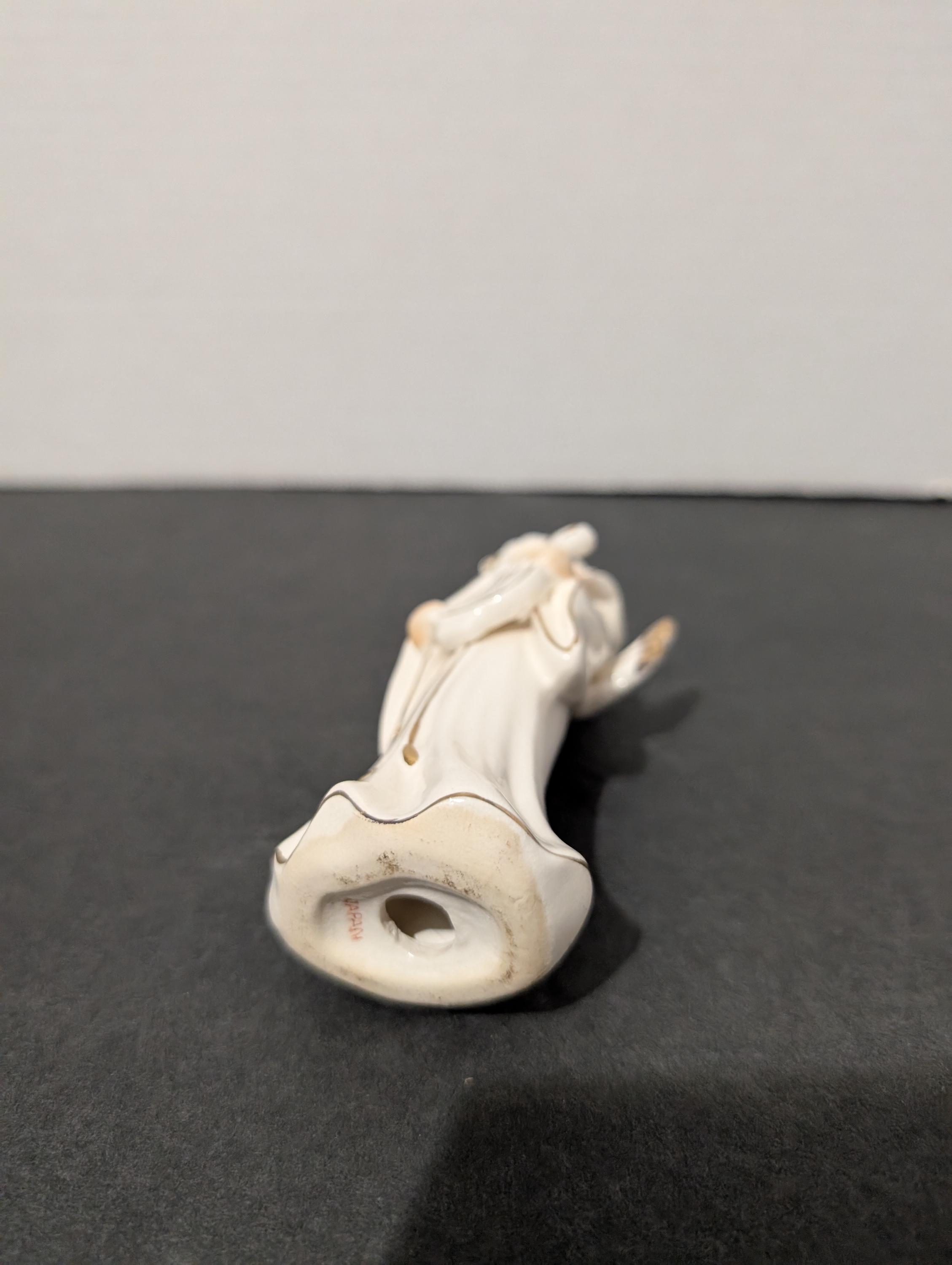 The figurine is finished in a glossy white glaze with elegant gold-leaf trim on the wings, gown, and musical instrument. This piece carries the classic red "JAPAN" stamp on the bottom, identifying it as a quality export from the mid-century era.Perfect for a Christmas mantel display, a music room accent, or as a thoughtful gift for an angel collector. In great condition. No chips or cracks .5 inches tall and 2 " inches wide . M2