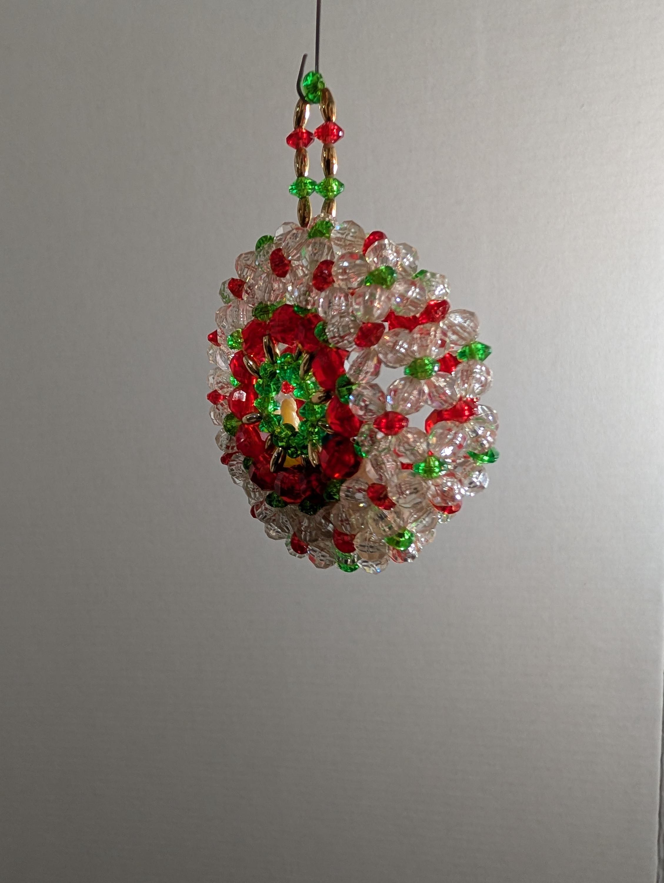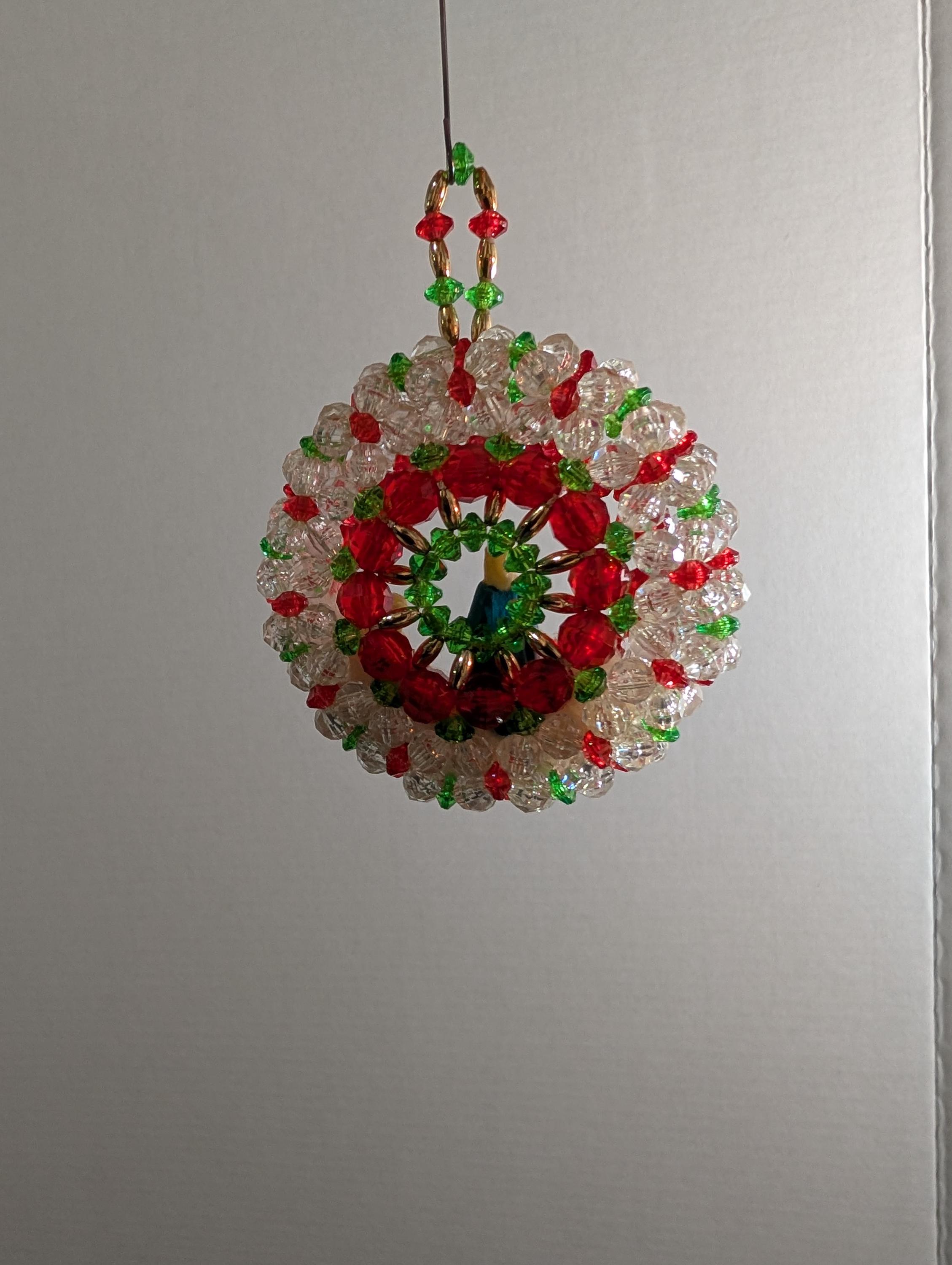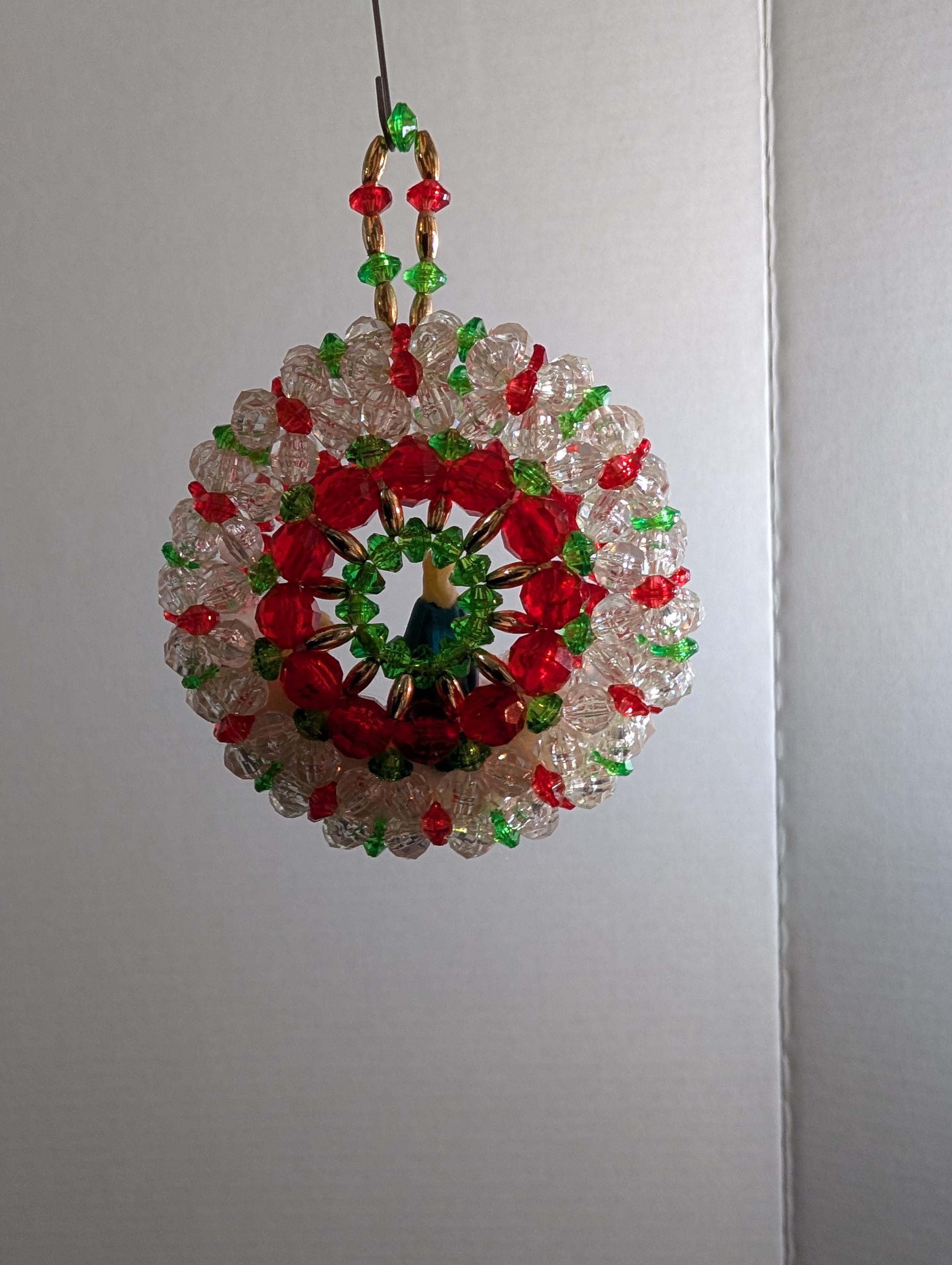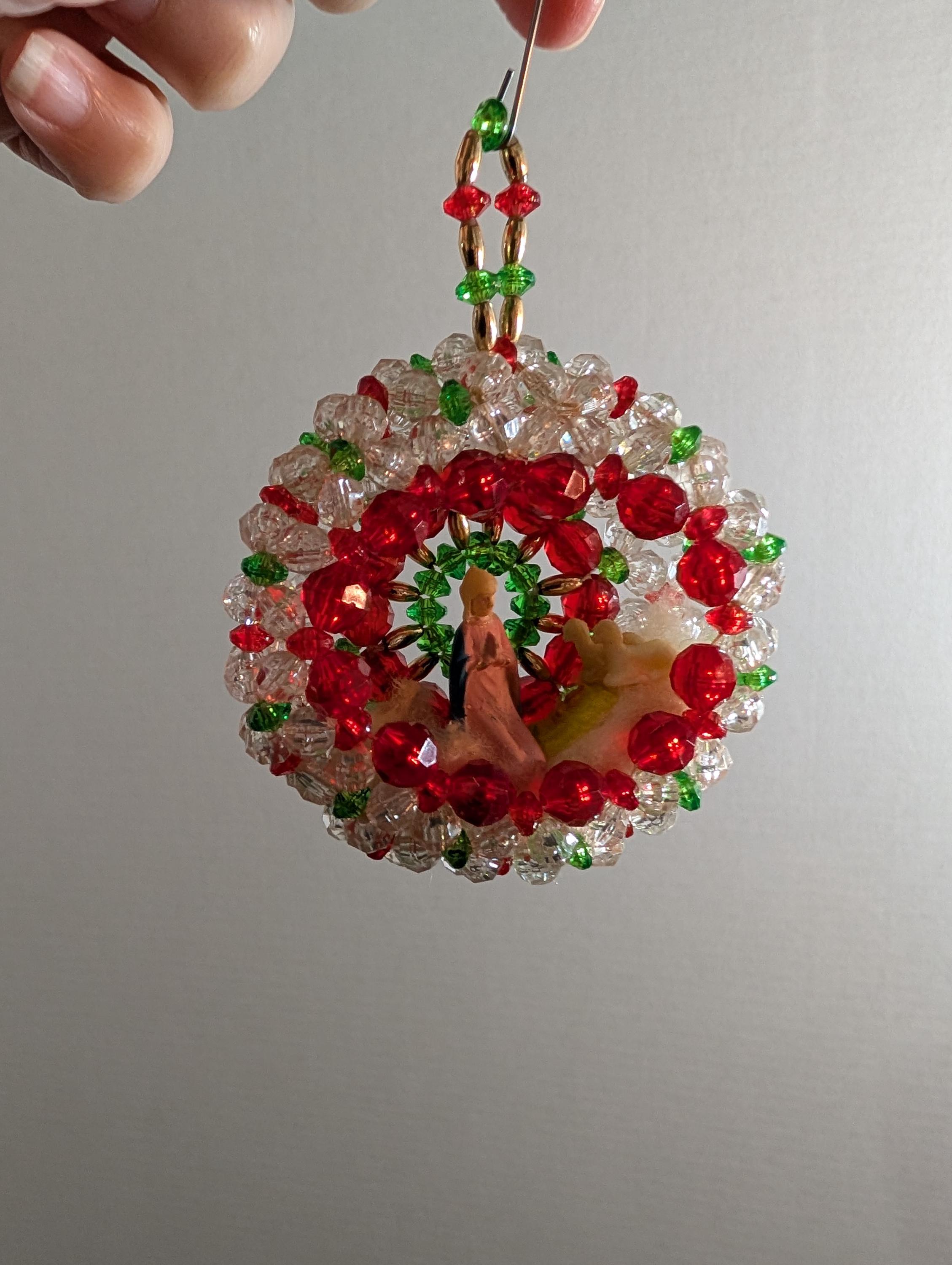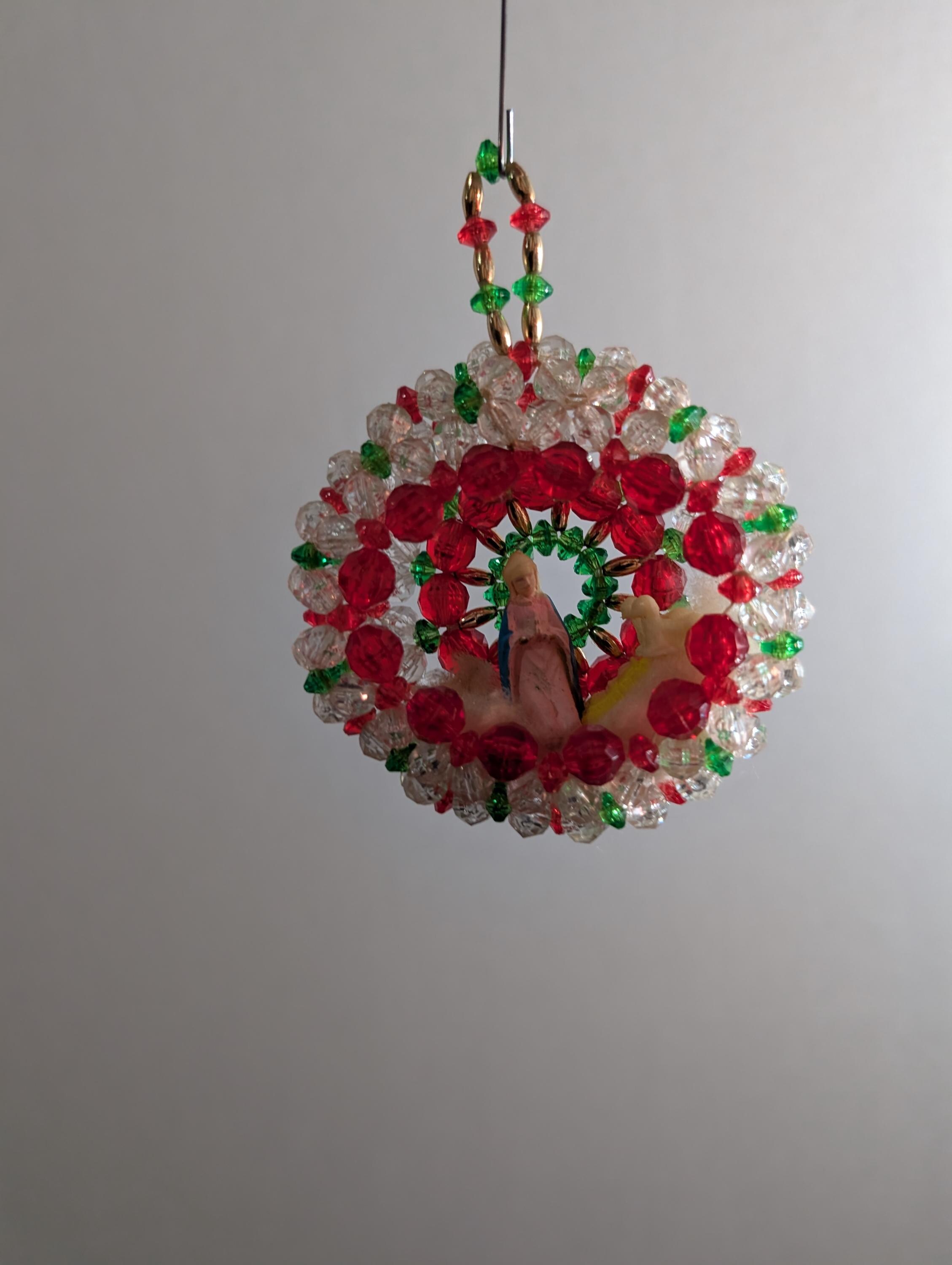 "Add a touch of nostalgic charm to your holiday decor with this enchanting vintage handmade ornament! Featuring Mary and Baby Jesus nestled within a sparkling red , green and clear beaded diorama.It's a truly unique piece for your tree or window. Great vintage condition with minor signs of age consistent with its history. Ornament is approximately 4" inches long and 3" inches wide.