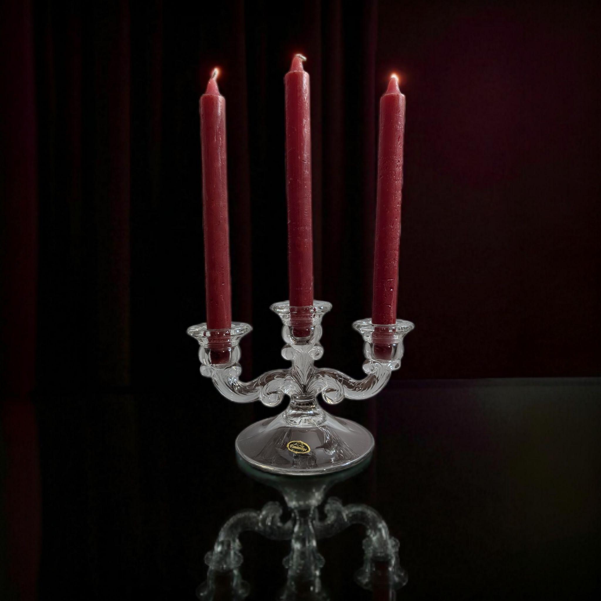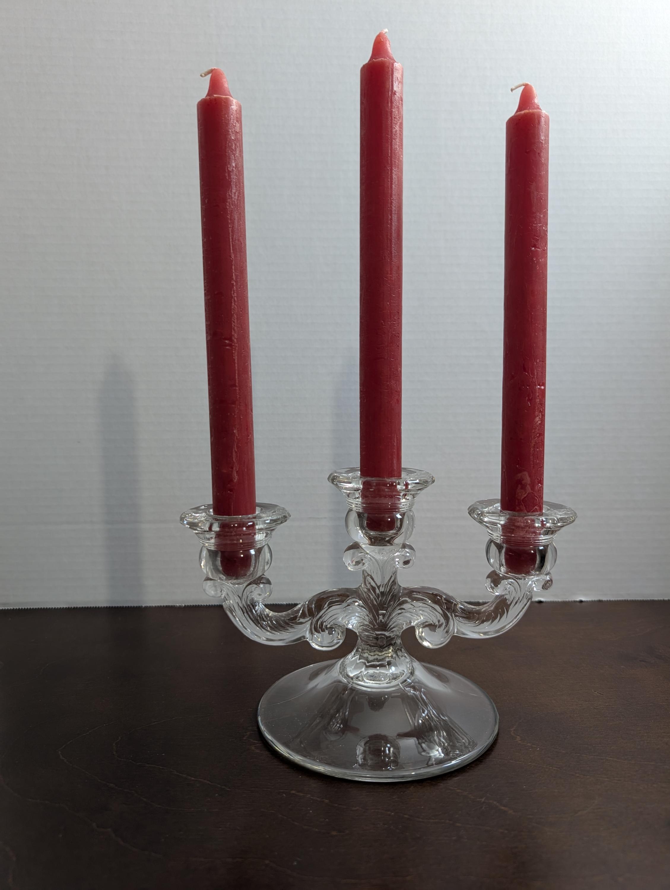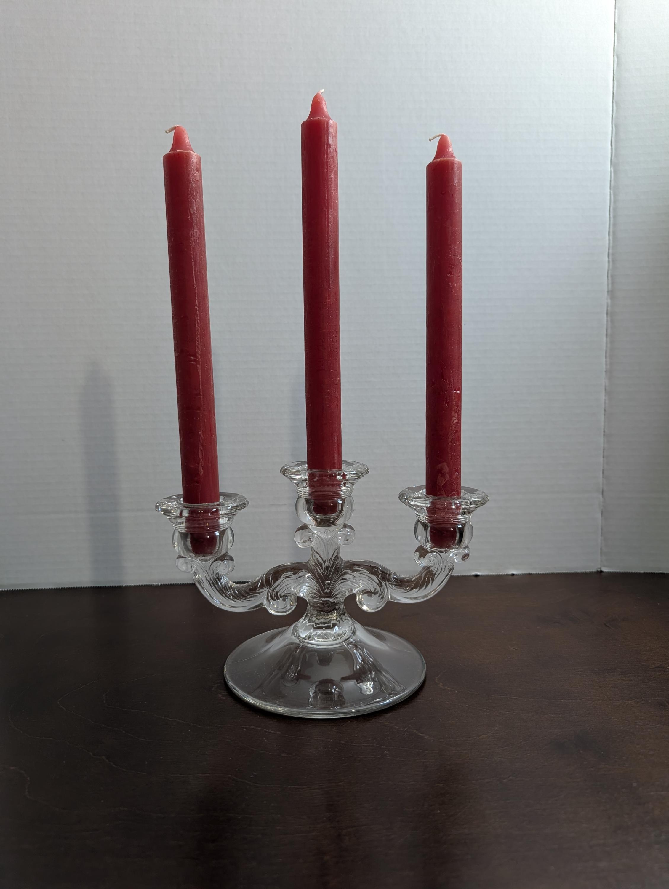 Whether used as a romantic centerpiece for a wedding, a sophisticated accent for a holiday feast, or simply to add a warm glow to your living space, this versatile candelabra is sure to impress. It holds three standard taper candles (red candles in photos are for display and not included).Excellent vintage condition with no visible chips, cracks, or cloudiness. Please review all photos carefully.