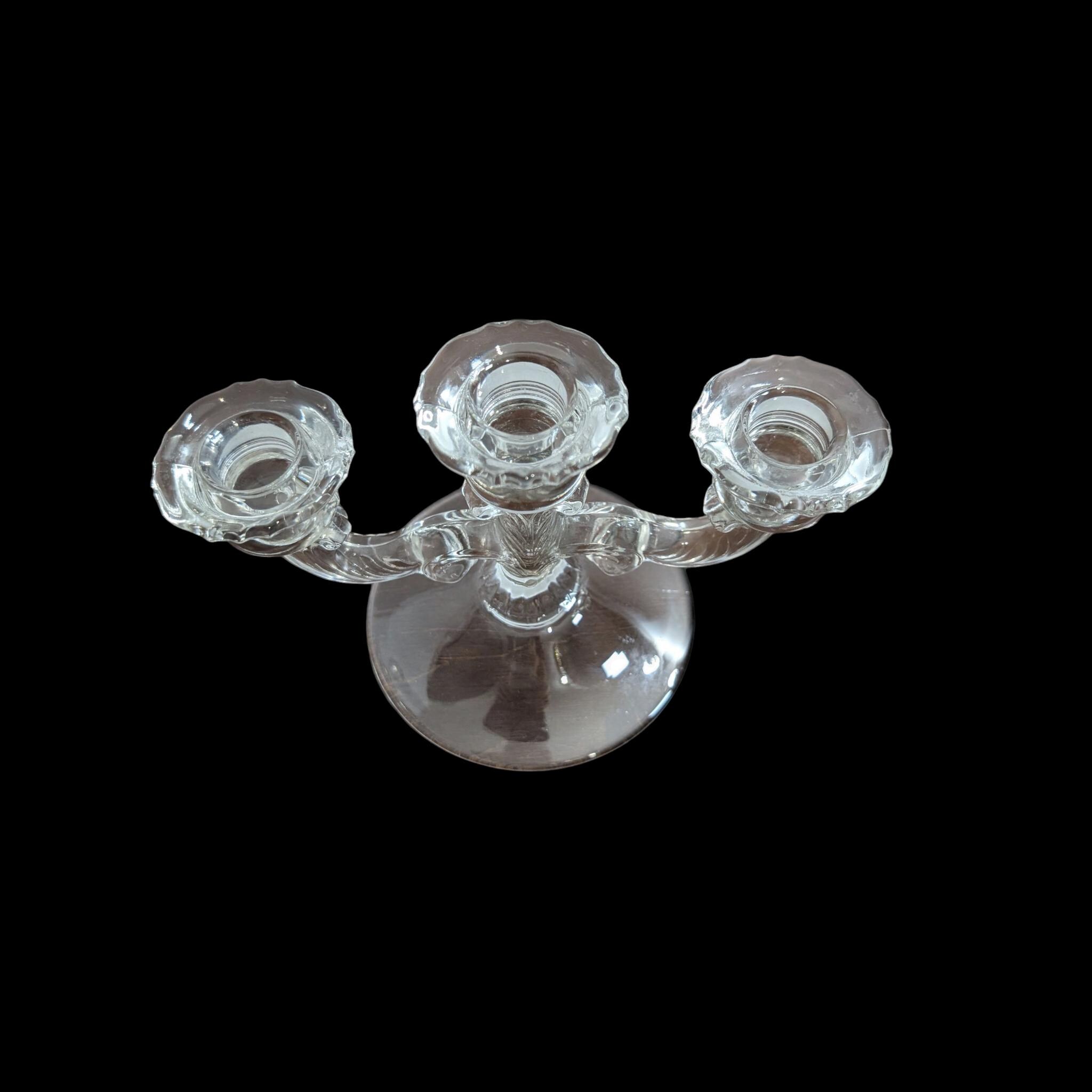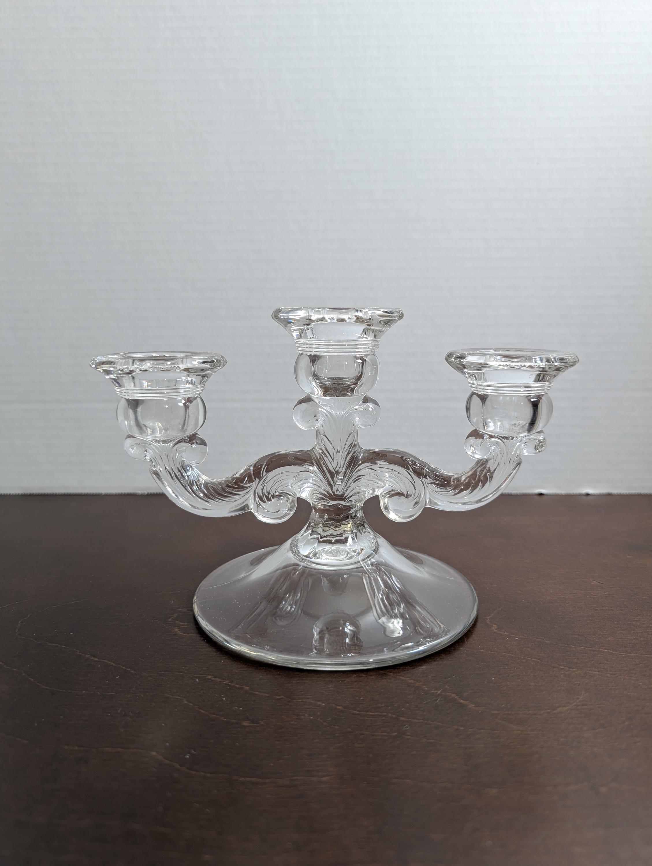 Add a touch of timeless elegance to your dining table or mantel with this stunning vintage three-light candelabra by the celebrated Cambridge Glass Company. This piece, known as the #636 candelabra, features graceful, scrolling arms and a sturdy, classic design that beautifully catches the light.
