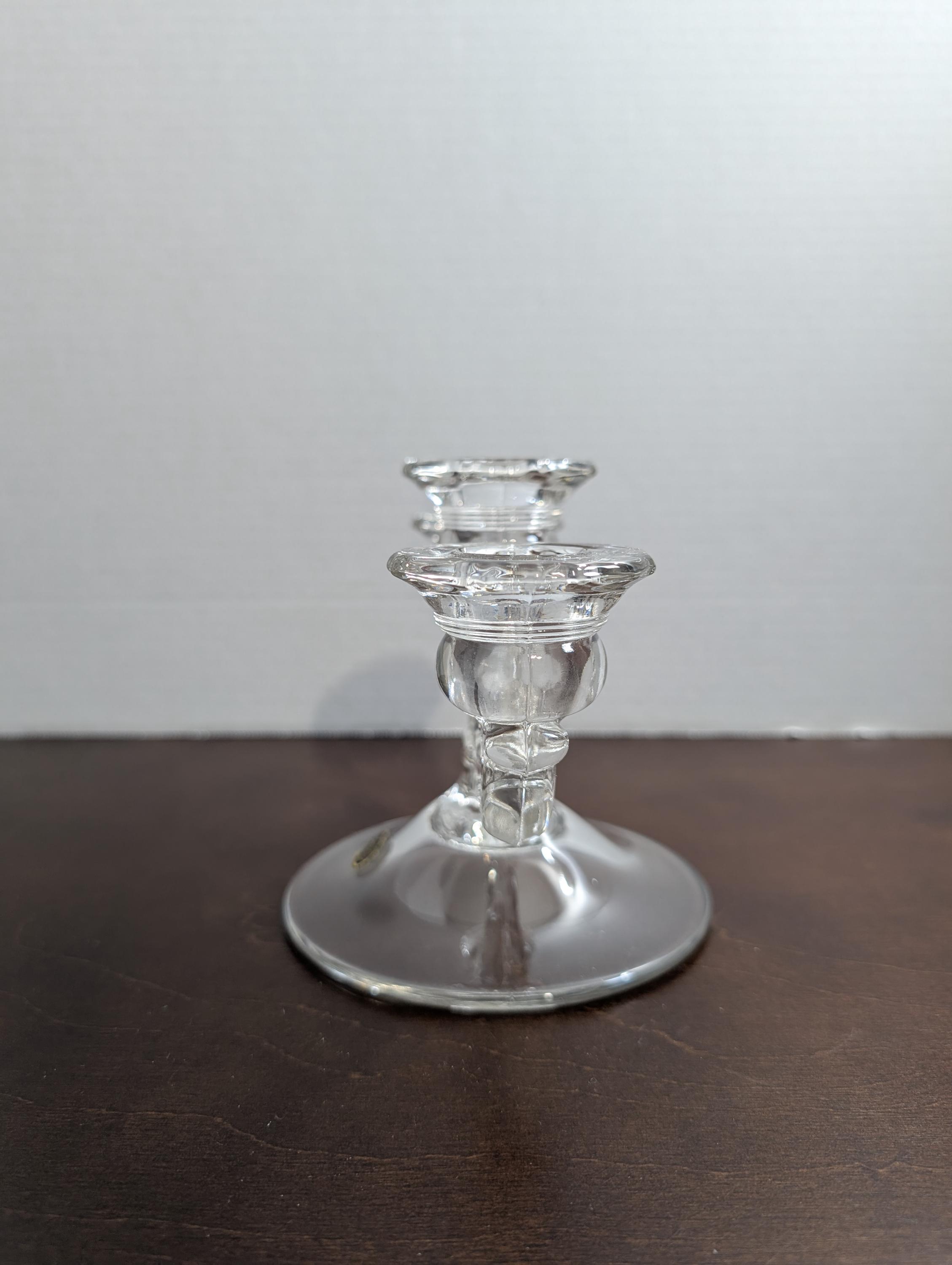 Crafted from high-quality, crystal-clear glass, this candle holder is a perfect example of mid-century American artistry. It's in remarkable vintage condition, and still retains its original gold foil "Cambridge" sticker, a highly sought after by collectors.