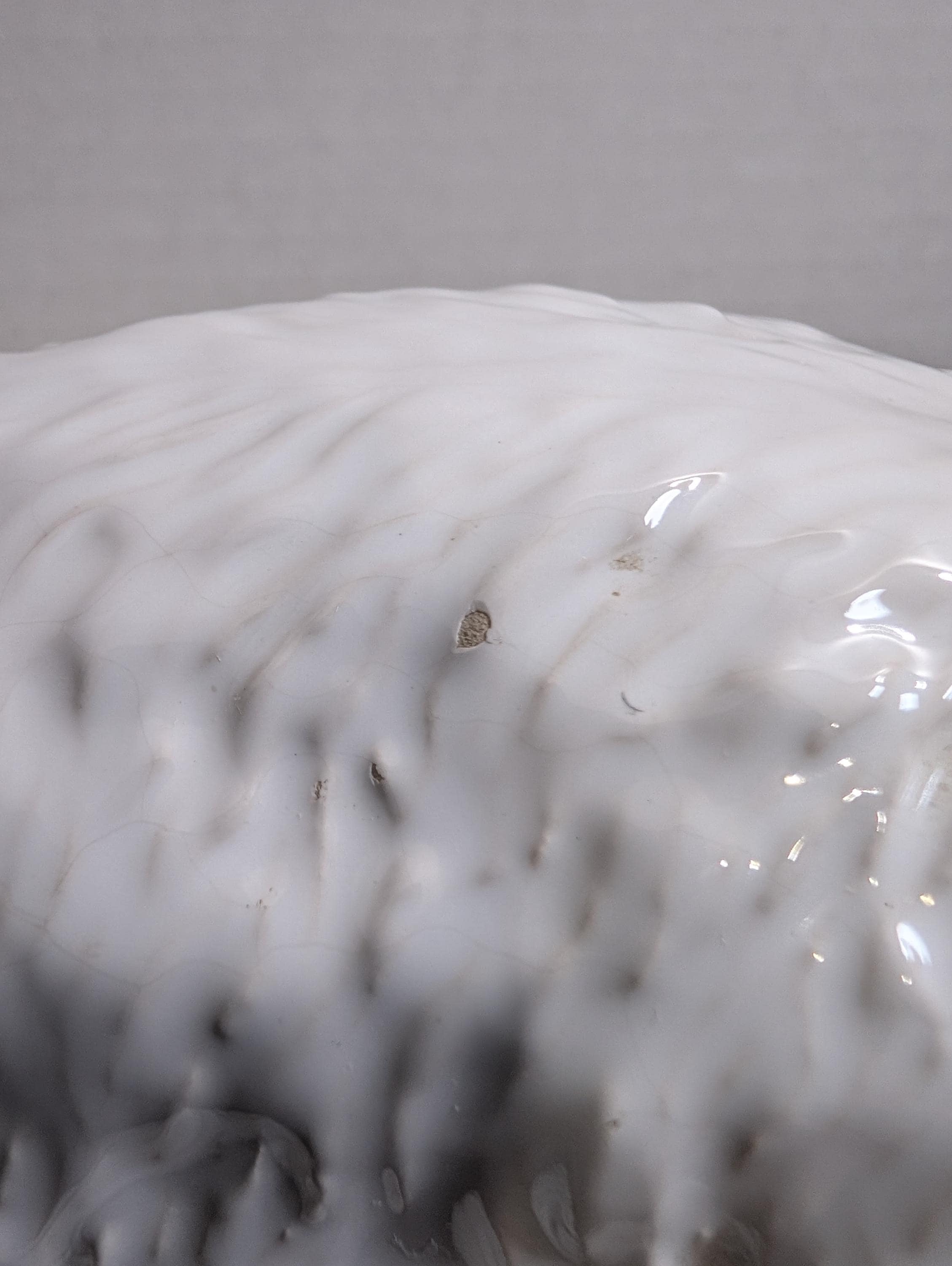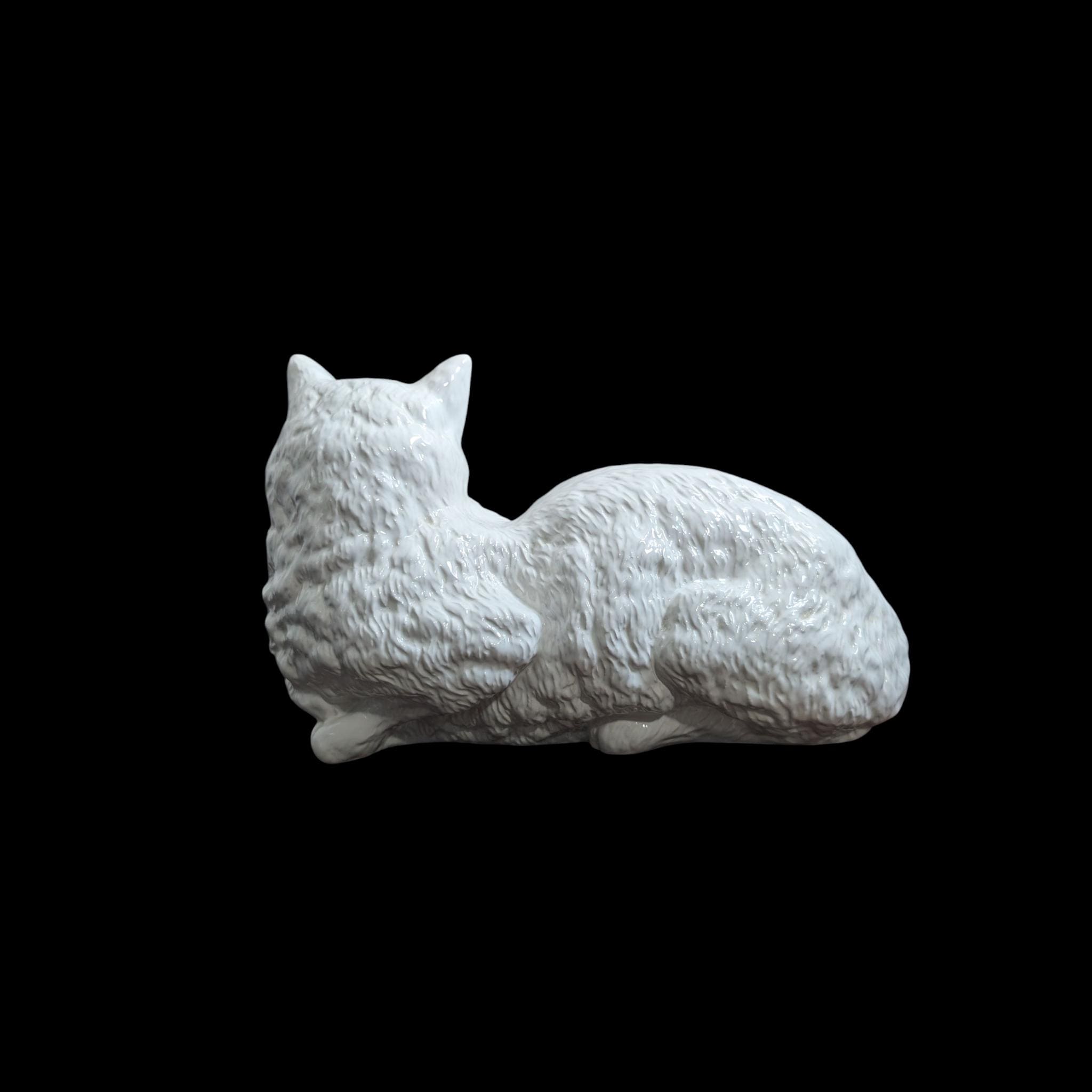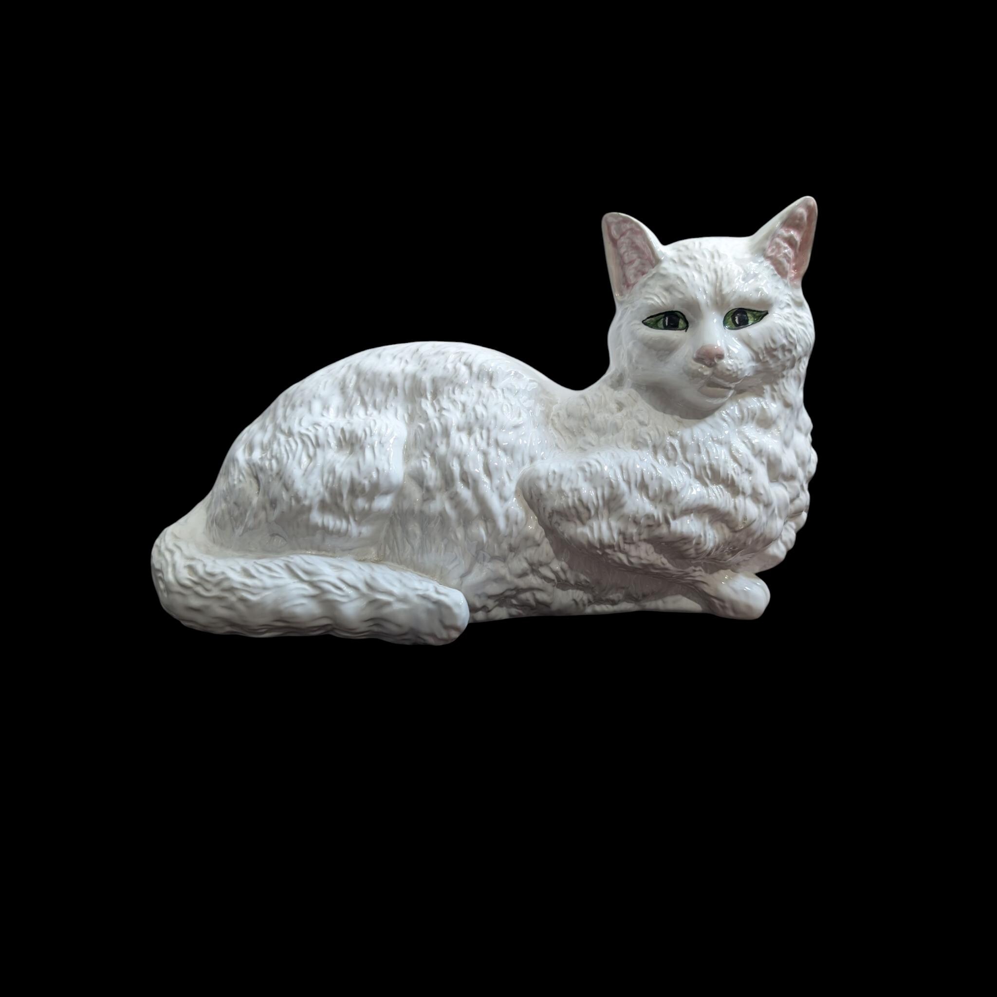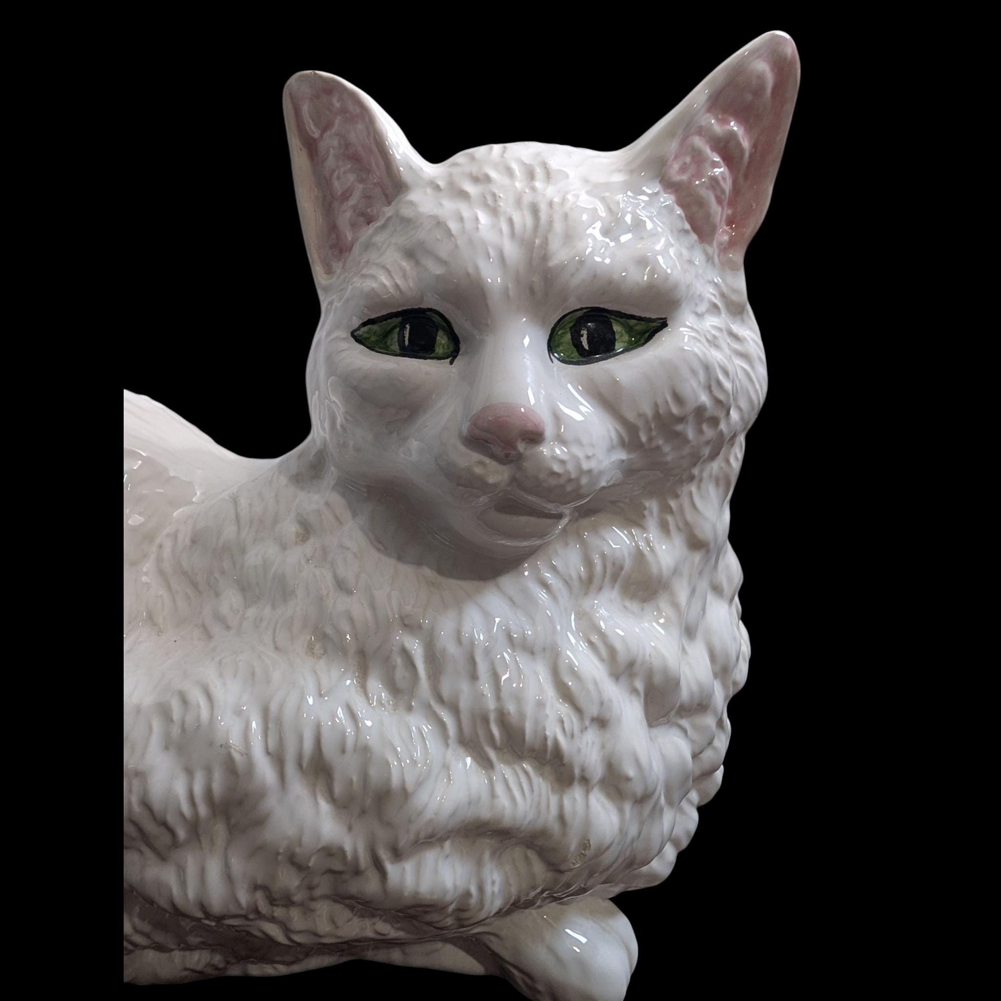 A truly captivating piece of vintage Portuguese art pottery, this large white cat figurine was crafted by the renowned Bordallo Pinheiro factory. Its elegant, resting pose, beautifully textured fur, and striking green eyes make it a standout piece for any collector or cat lover.