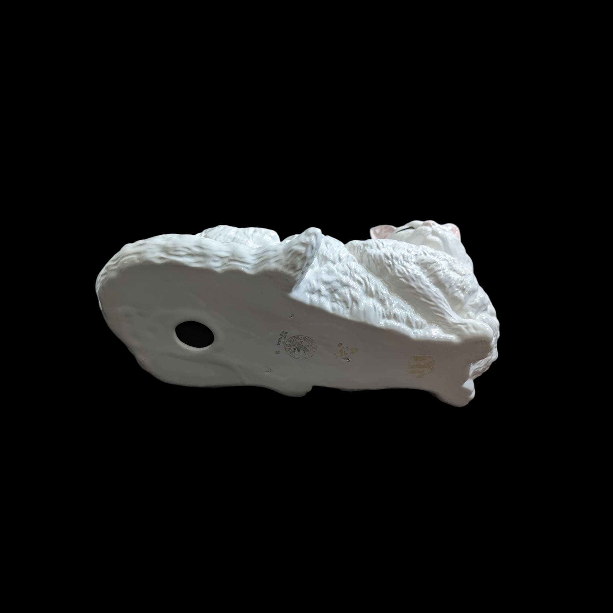This substantial sculpture measures approximately 13.5 inches long by 8 inches tall, making it a perfect statement piece for a mantel, bookshelf, or entryway table. This figurine is authenticated by the iconic Bordallo Pinheiro backstamp on the bottom, featuring the company's signature frog emblem. The frog mark is a symbol of the quality and artistic heritage of Bordallo Pinheiro ceramics, assuring you of its genuine origin from the Caldas da Rainha factory in Portugal. This piece is in great vintage condition. It has two very small "flea bites"—one on an ear and one on its back—which are minor imperfections consistent with its age. These do not detract from the overall beauty and integrity of the figurine. Please review all photos carefully, as they are an important part of the description.