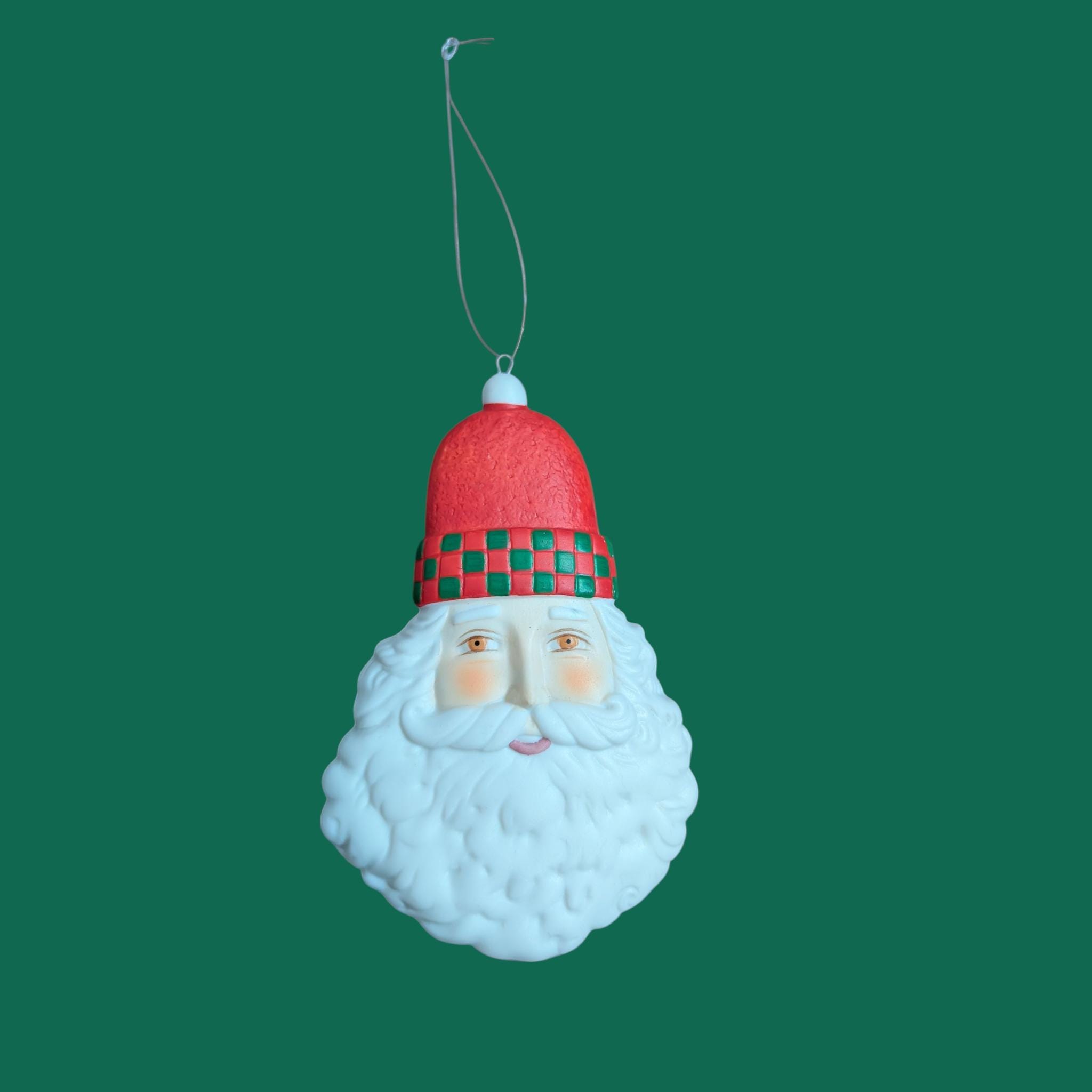 Bring a touch of nostalgic charm to your holiday decor with this delightful vintage Department 56 Santa head ornament! Crafted from exquisite porcelain, this festive piece captures the classic spirit of Christmas with Santa's kindly face, white beard, and a cheerful red and green checkered hat. In excellent used condition. 5" inches long and 3" inches wide. x61