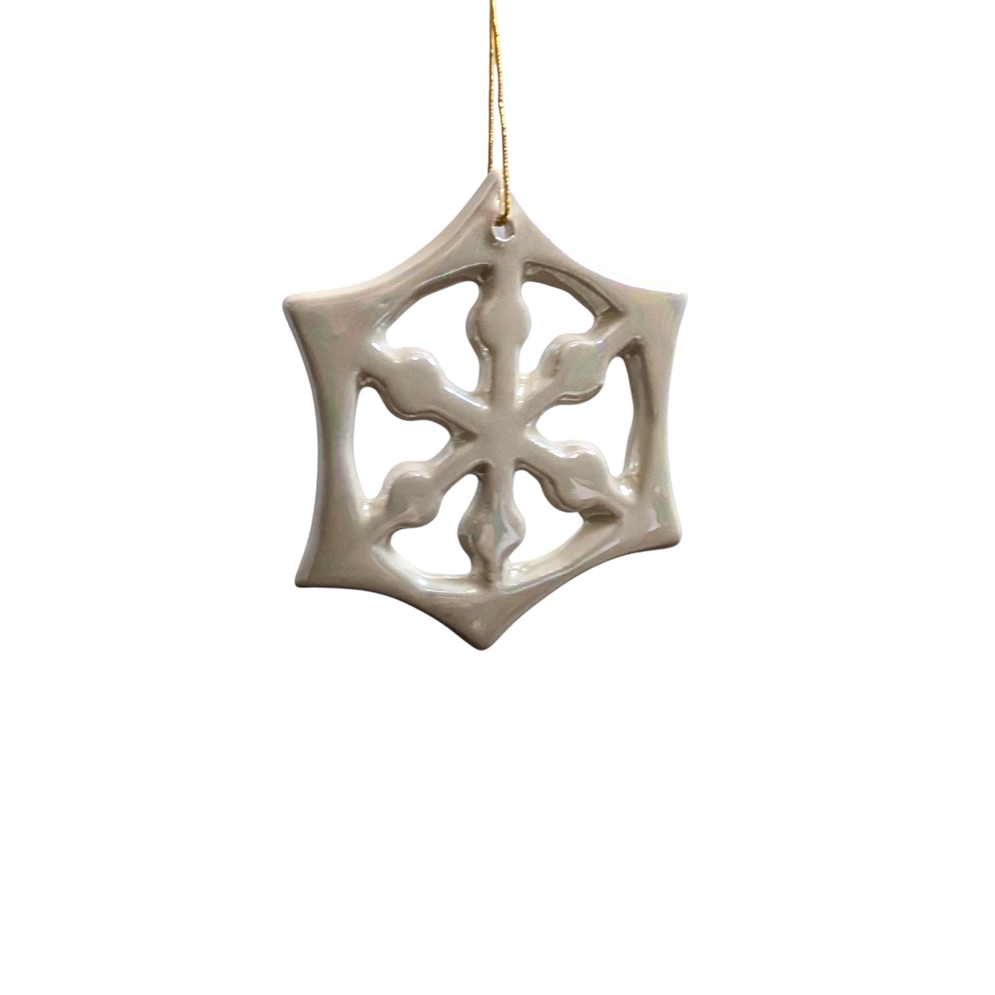 Vintage Pearlescent Snowflake Ornament | 3" Ceramic Iridescent Christmas Decor | Retro Mid-Century Modern Holiday Star