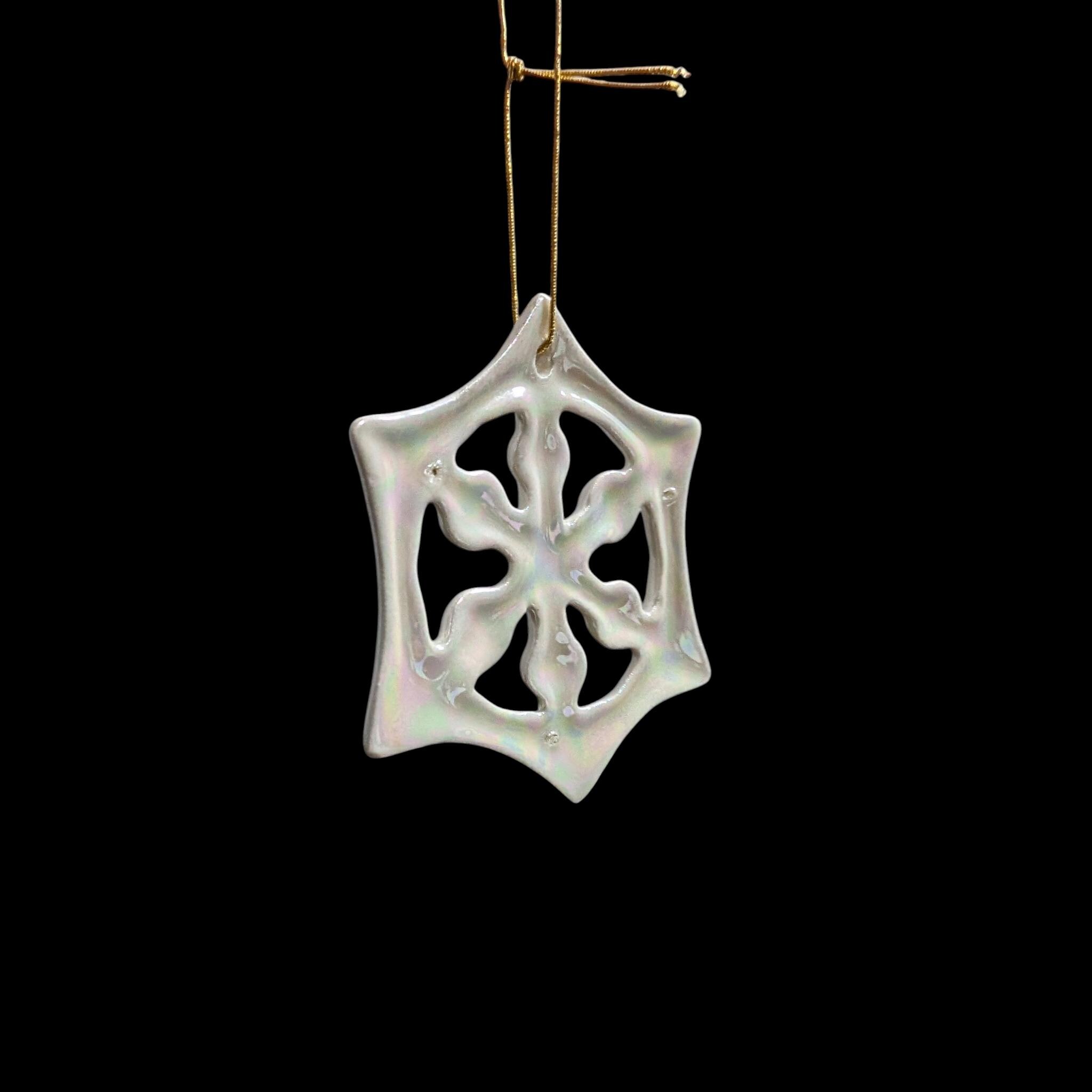 Add a touch of timeless shimmer to your holiday tree with this exquisite vintage ceramic snowflake ornament!The entire ornament is coated in a stunning pearlescent glaze that catches the light beautifully, revealing subtle iridescent shimmers of pink, green, and blue. Its elegant and minimalist design feels reminiscent of Mid-Century Modern aesthetics, making it a perfect fit for a retro, traditional, or even contemporary holiday theme.