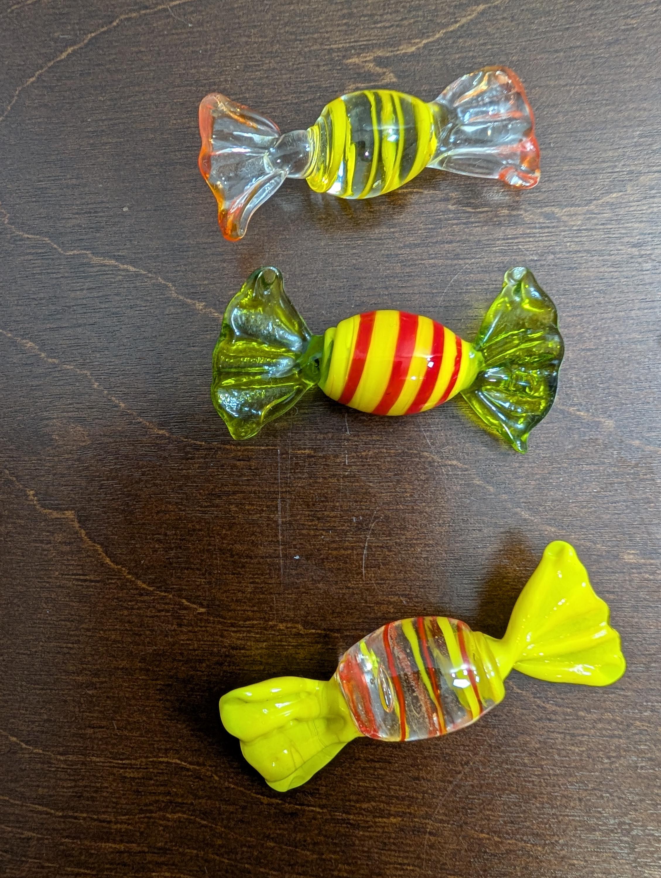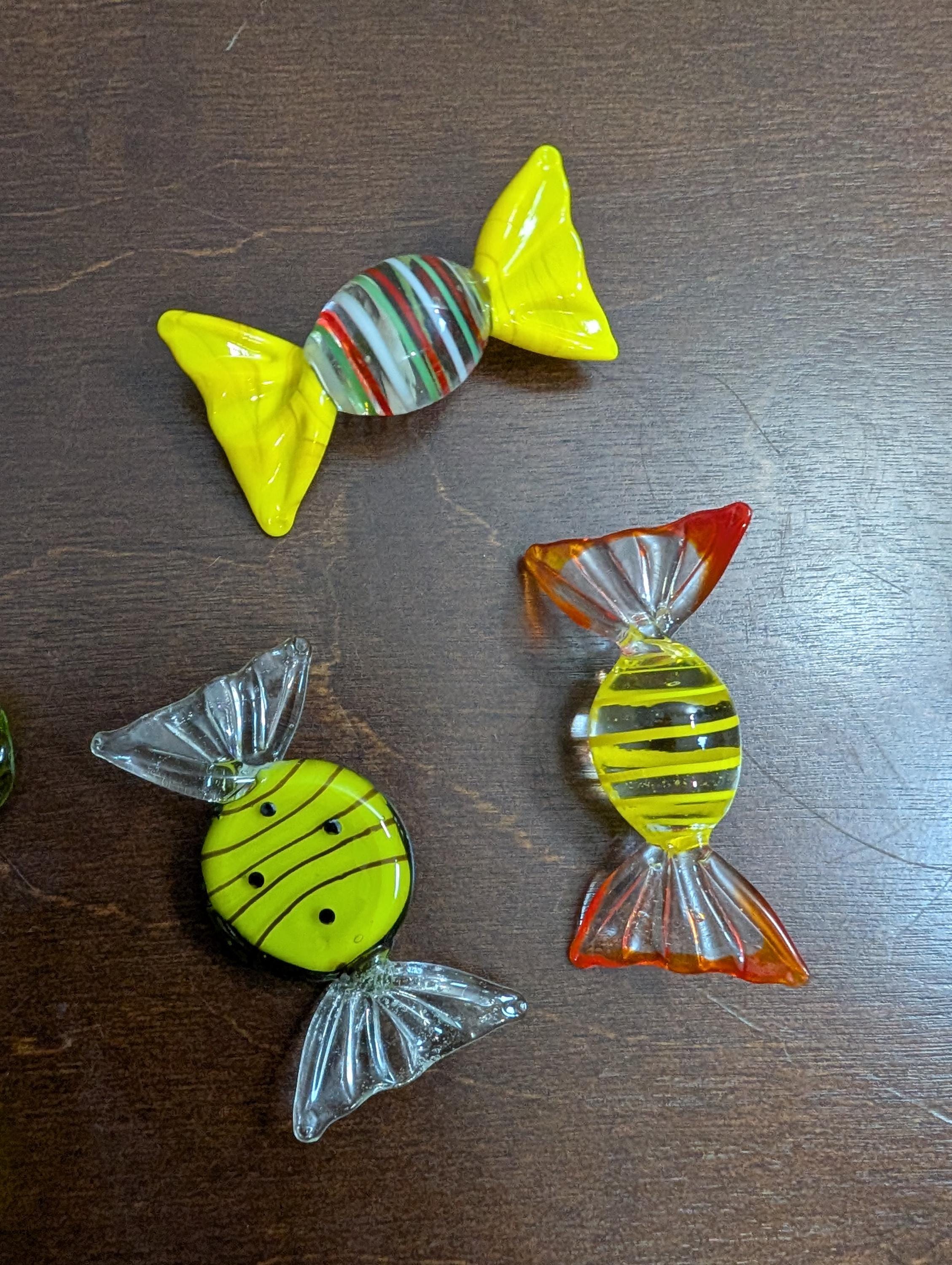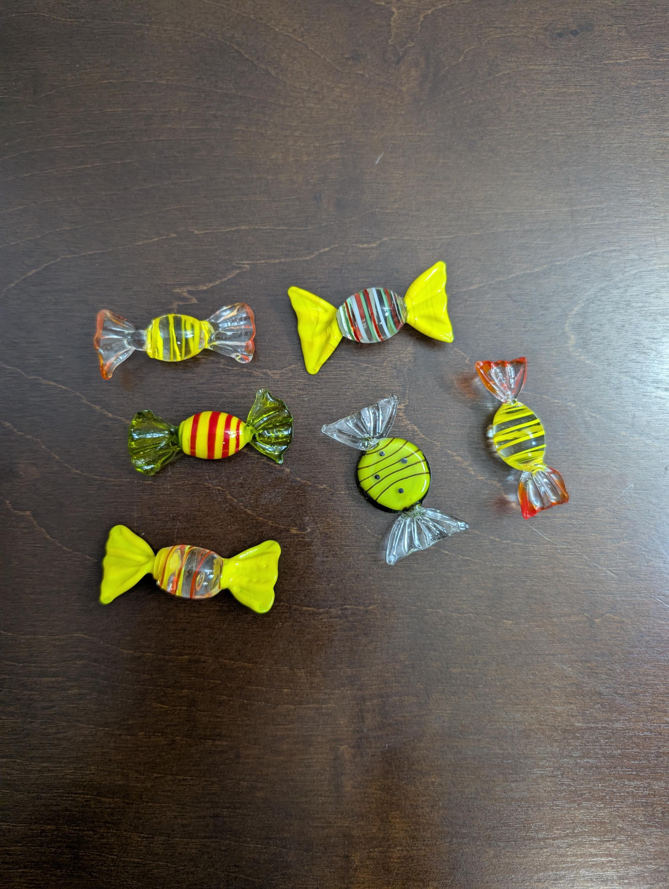Bring a touch of sweet history into your home or delight a loved one with these captivating glass candies! Set of 6 assorted glass candies. Shades of yellow. Would look great on a shelf of desk. In great vintage condition. Each piece is approximately 2" inches long.x62