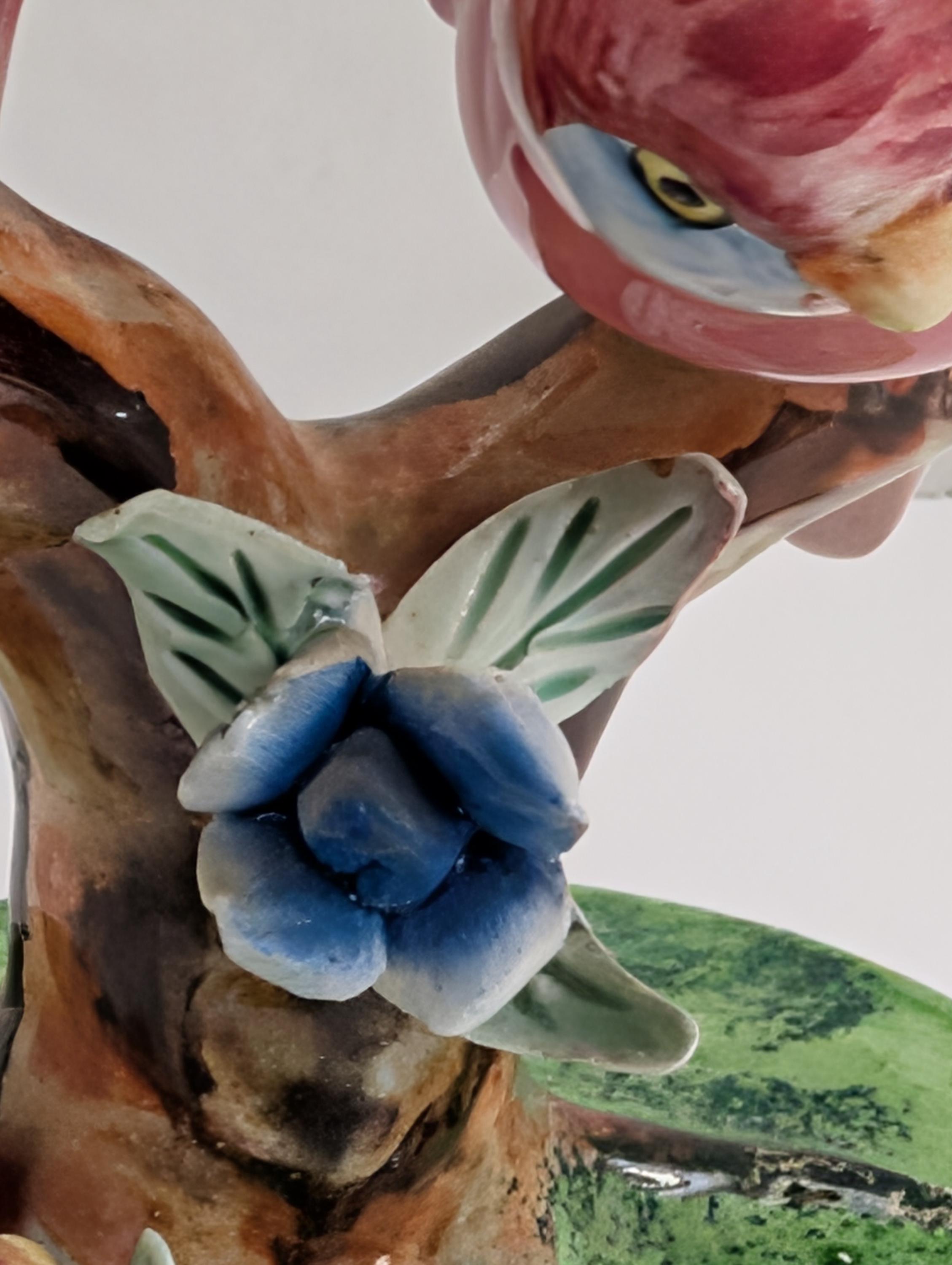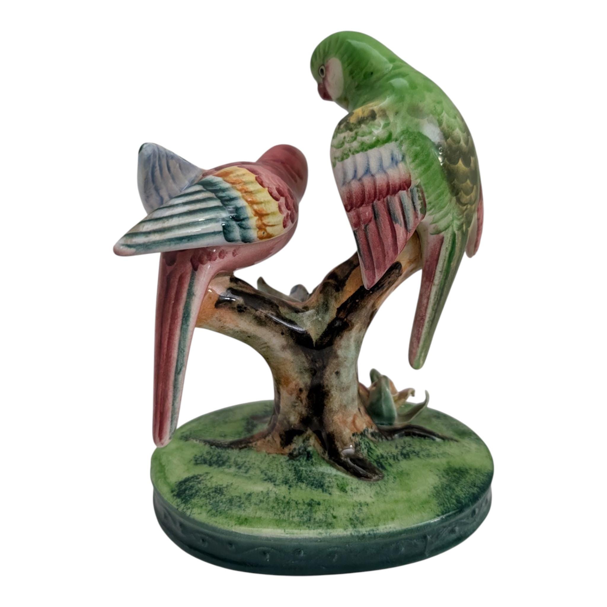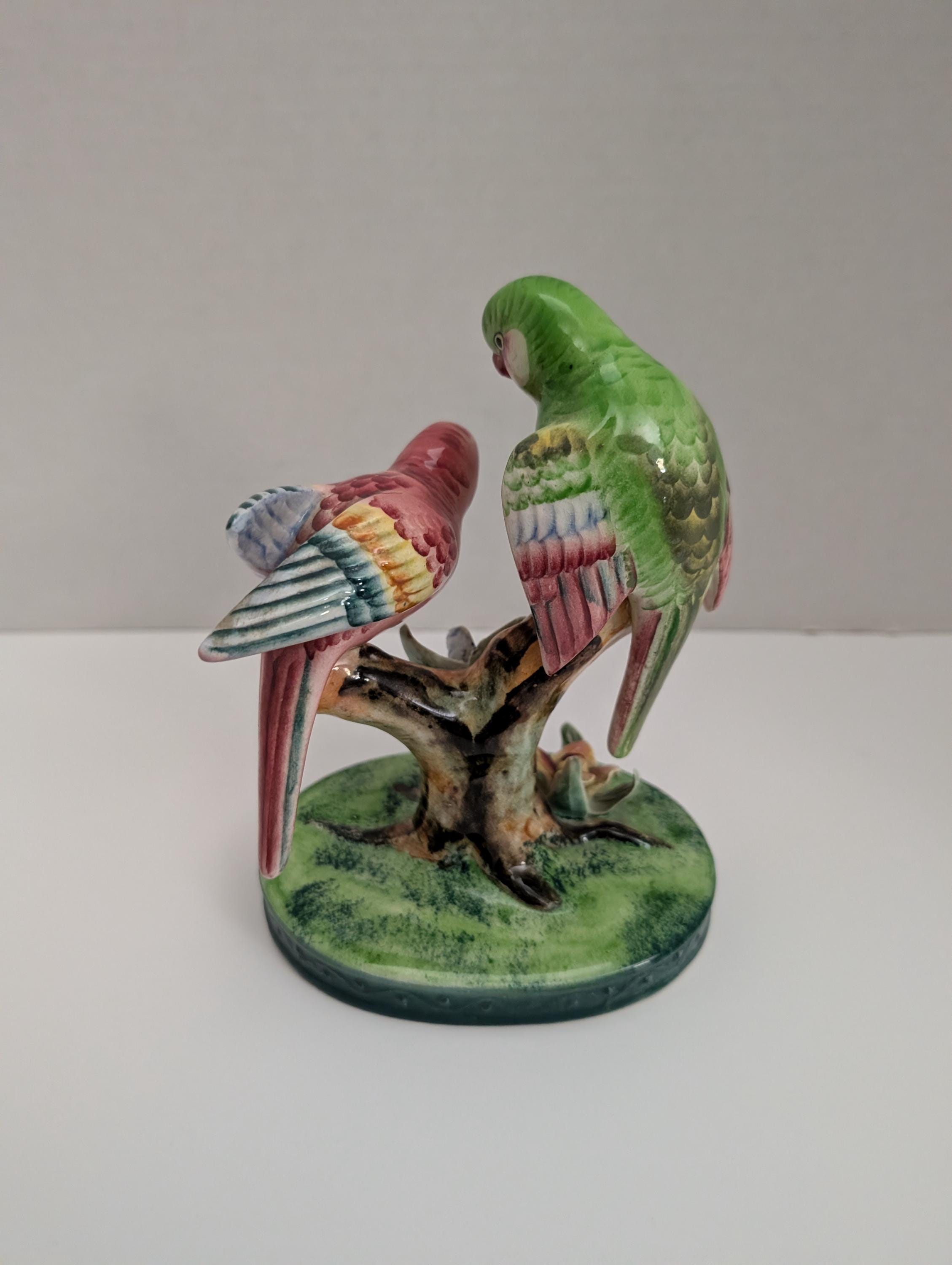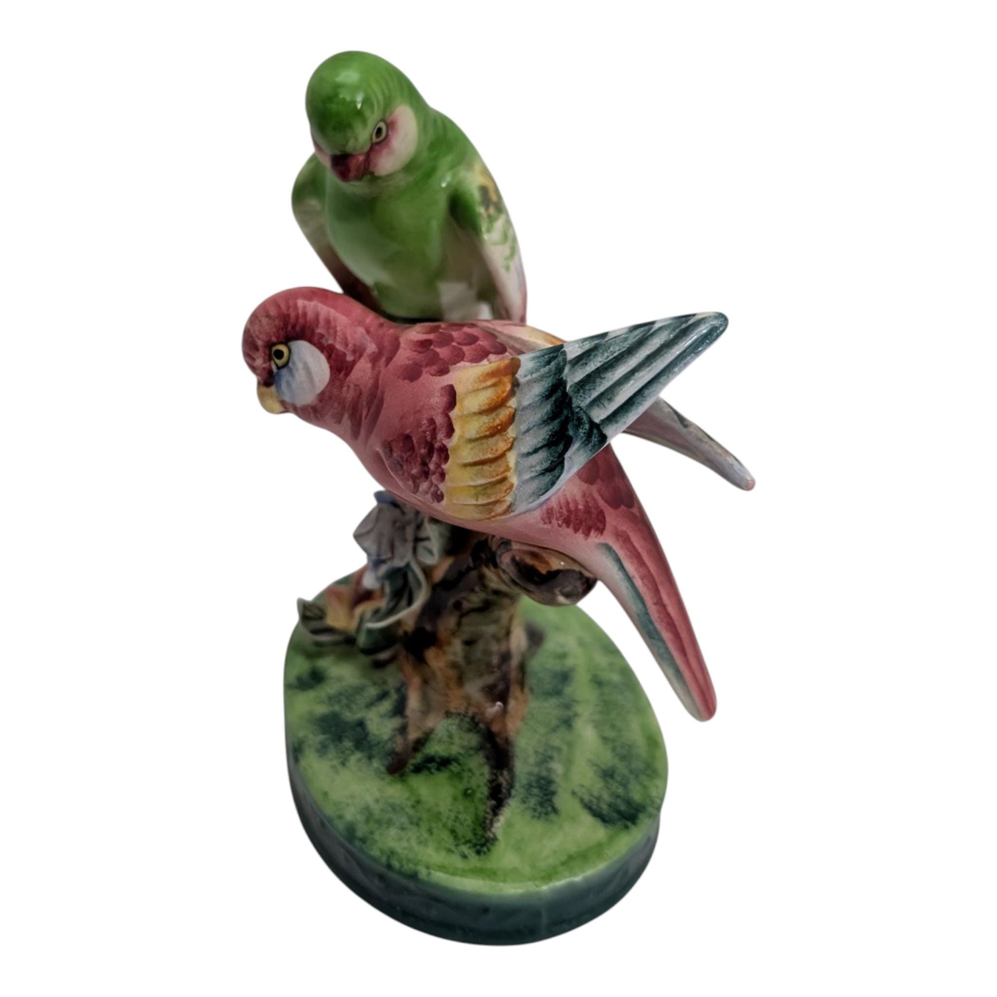 Add a touch of vintage Italian charm to your home with this beautiful hand-painted ceramic figurine. This piece features a pair of sweet birds, one green and one pink, resembling lovebirds or parakeets. They are perched on a detailed tree stump base adorned with delicate, hand-applied "bocage" flowers in pink and blue.