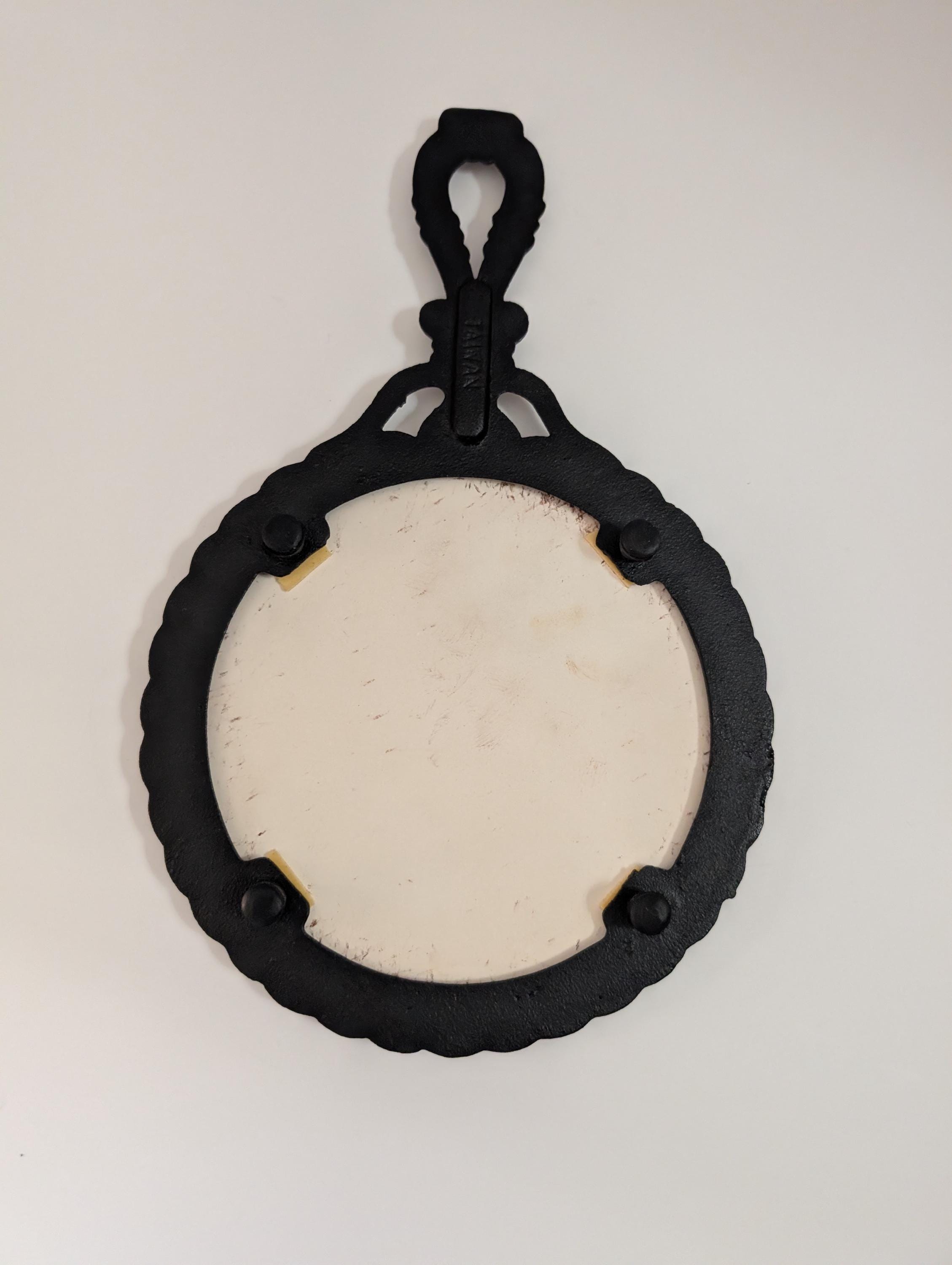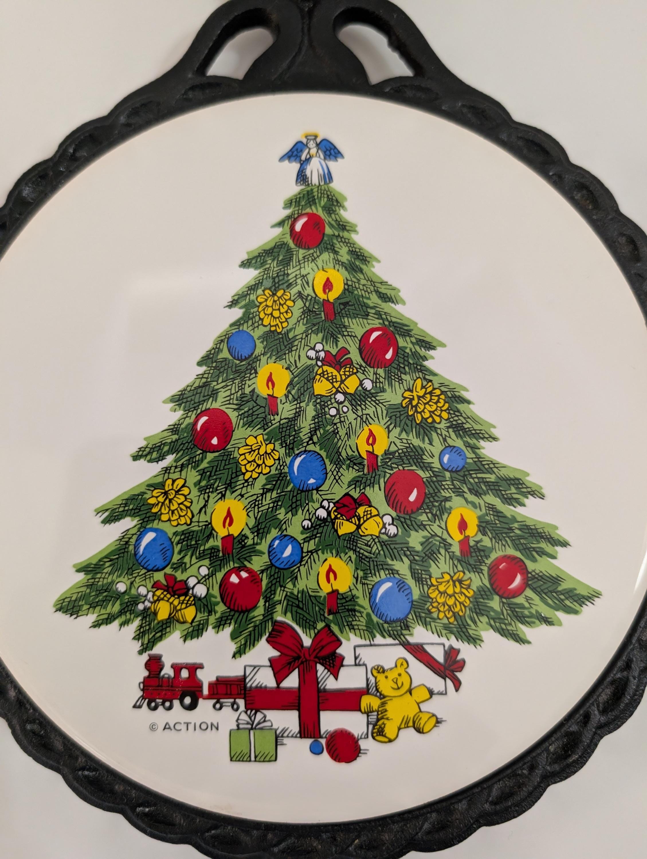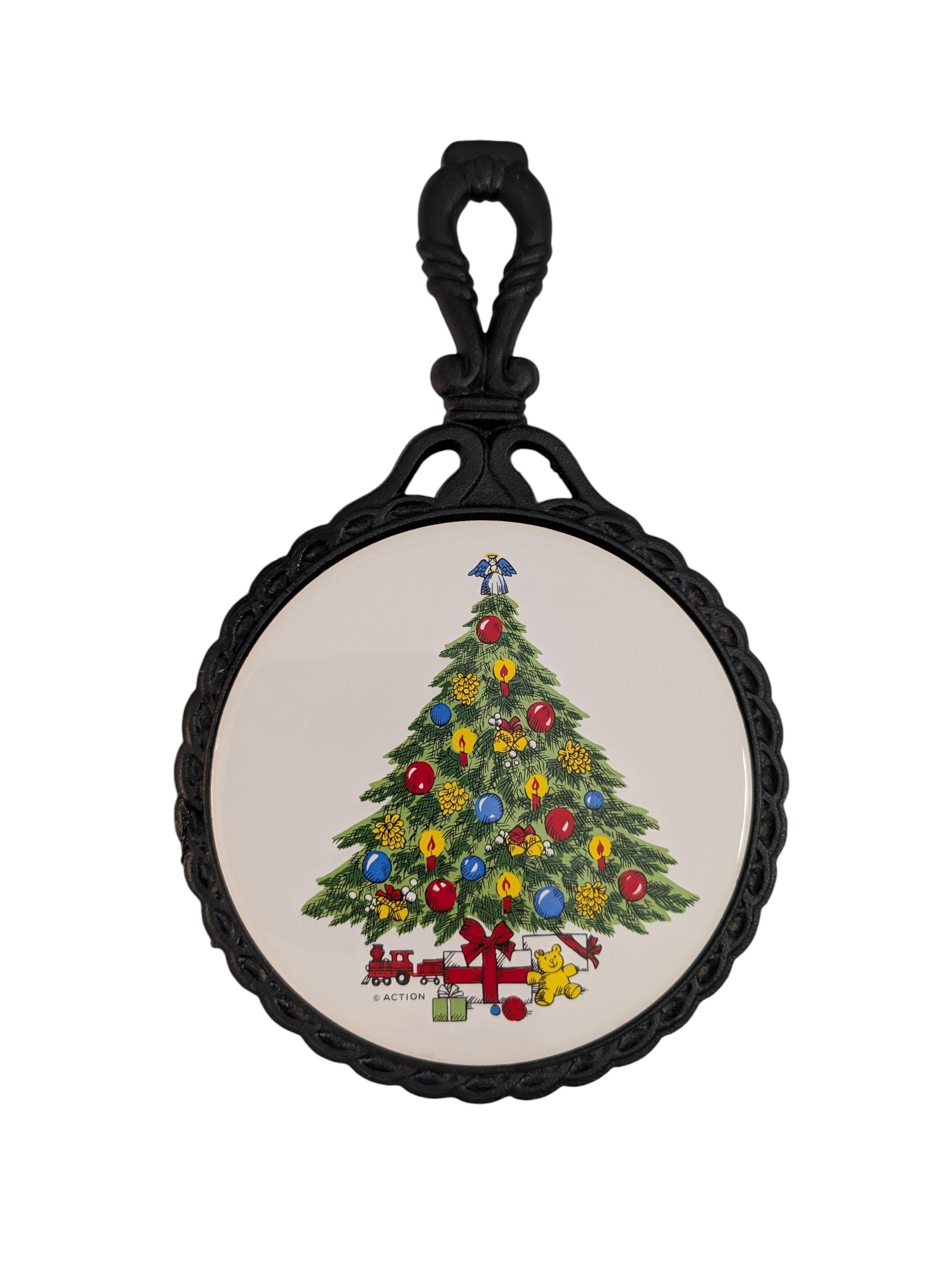 Add a perfect touch of retro charm to your holiday kitchen with this vintage Christmas trivet by Action! This classic piece features a festive ceramic tile set into a sturdy cast iron frame. It's perfect for protecting your counters and table from hot dishes during a holiday feast or for hanging on the wall as nostalgic Christmas decor.