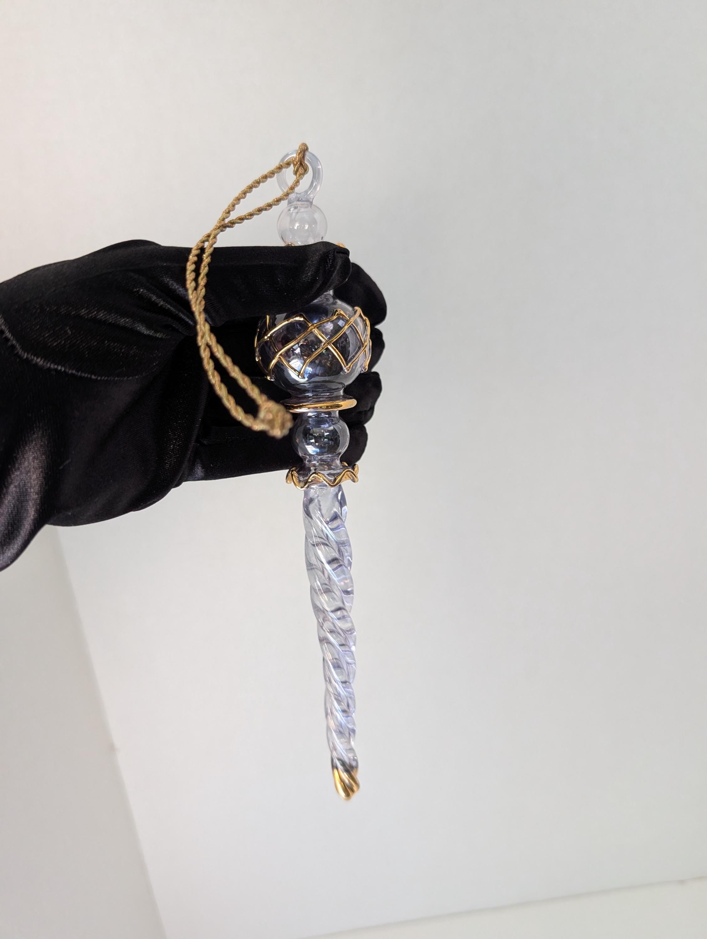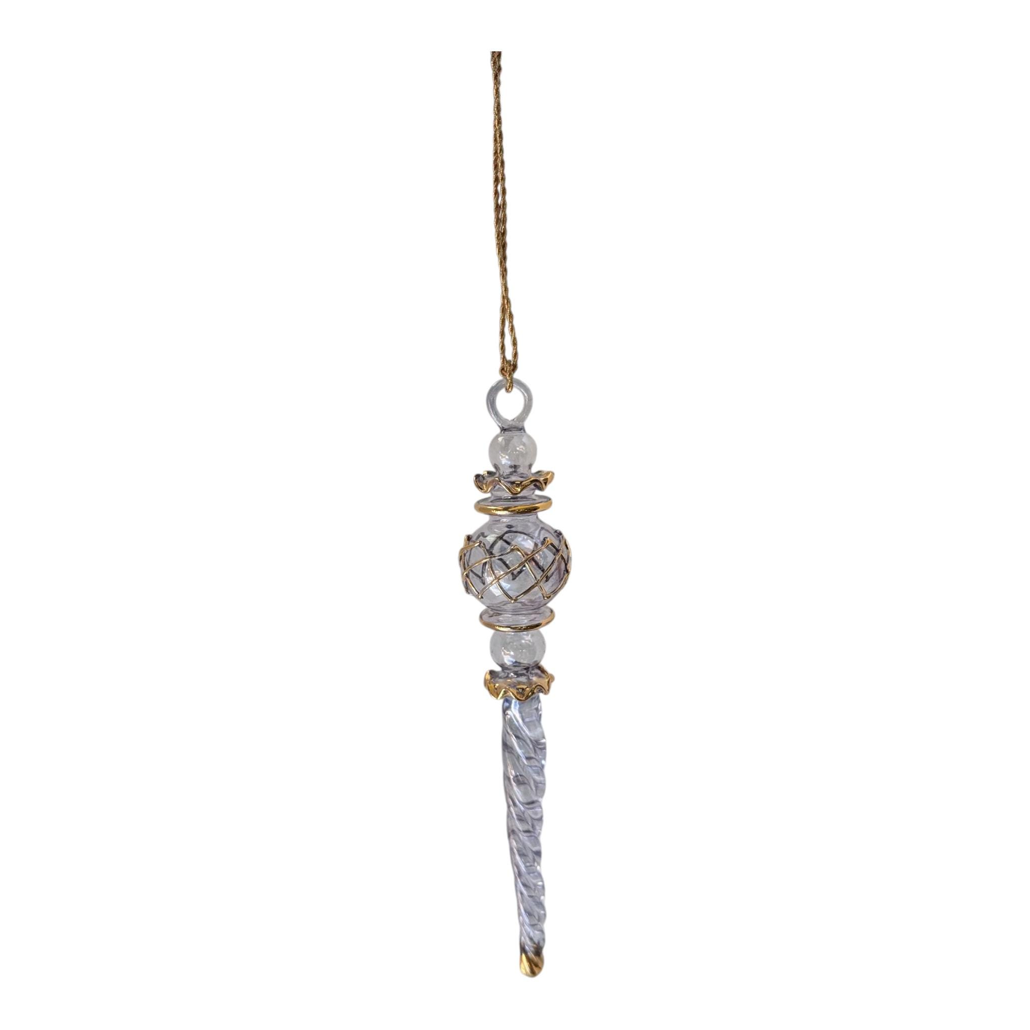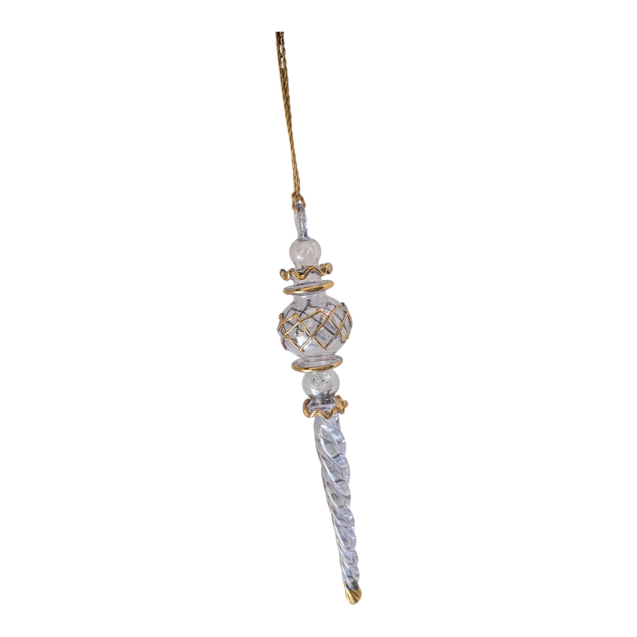 This is a truly captivating piece of art glass. The ornament features a long, clear glass twisted icicle drop at its base. The center is a beautiful clear orb, encased in a delicate, hand-applied gold lattice or "netting." The piece is accented with gold bands and a final gold touch on the very tip.