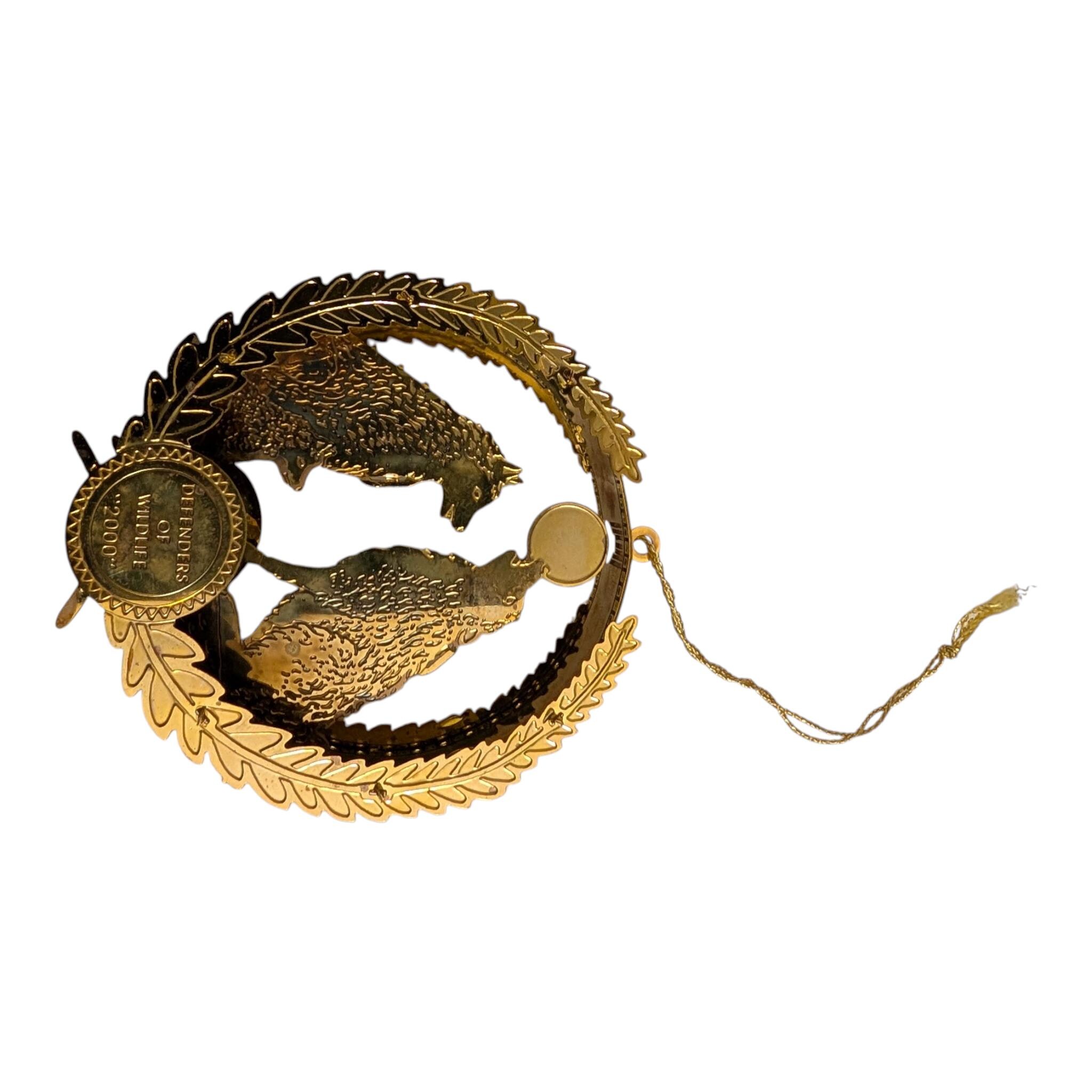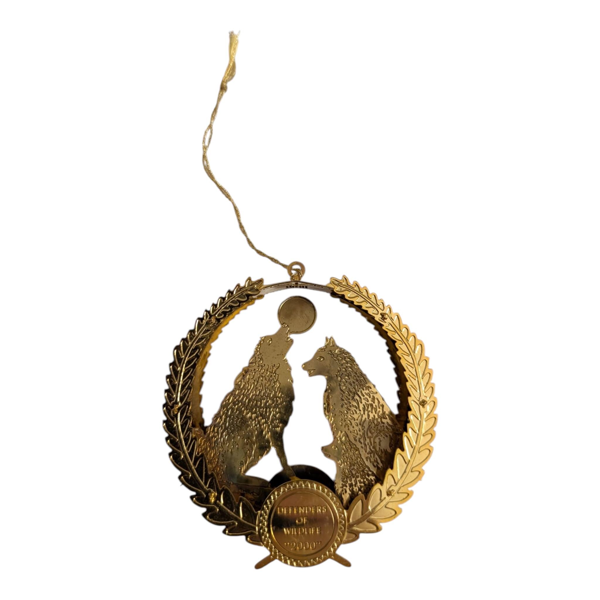 Vintage 2000 Defenders of Wildlife Ornament - Gold Brass Wolf Pack - Howling Wolves & Moon - Y2K Nature Lover Christmas Gift - Animal Decor
