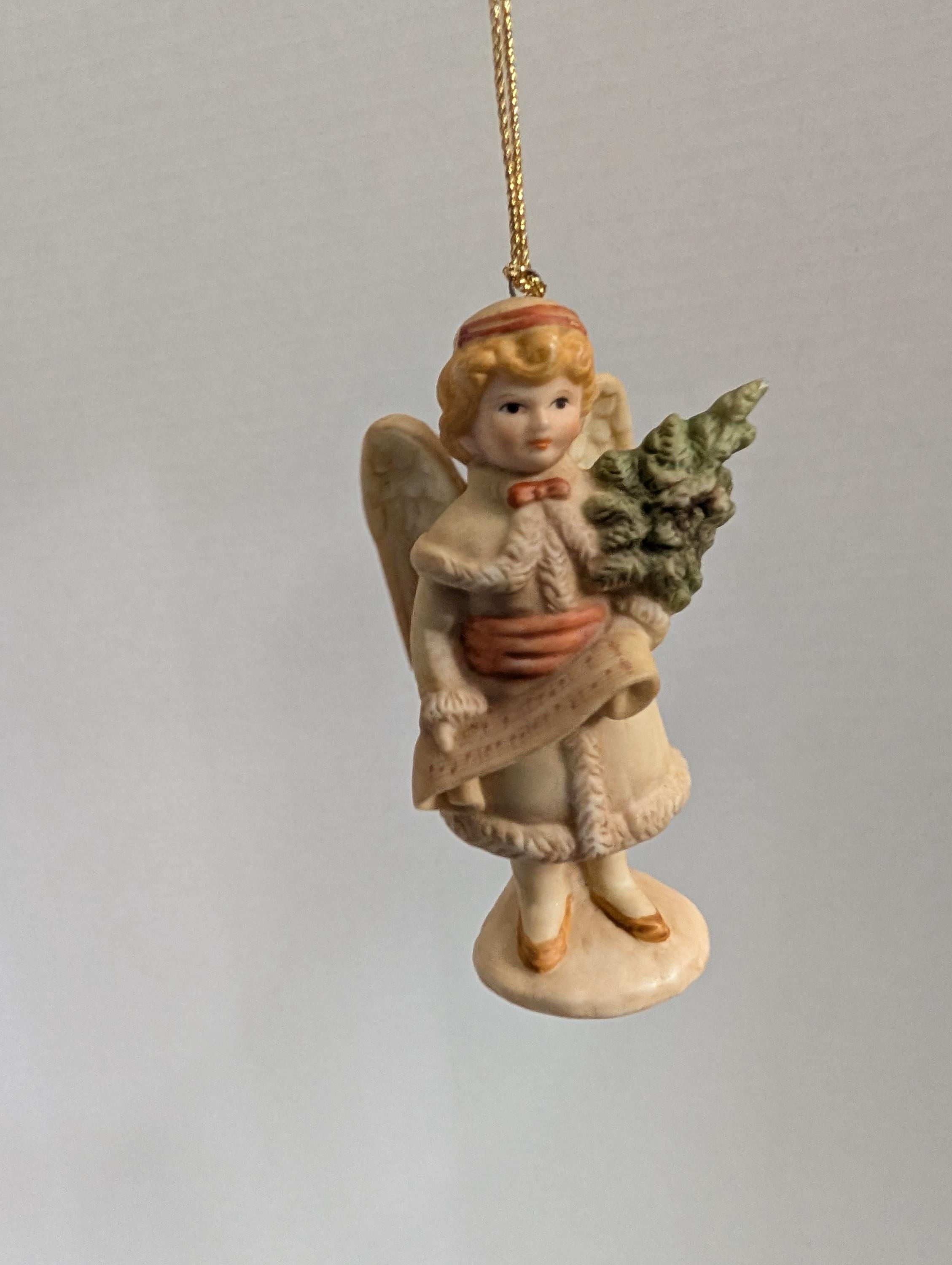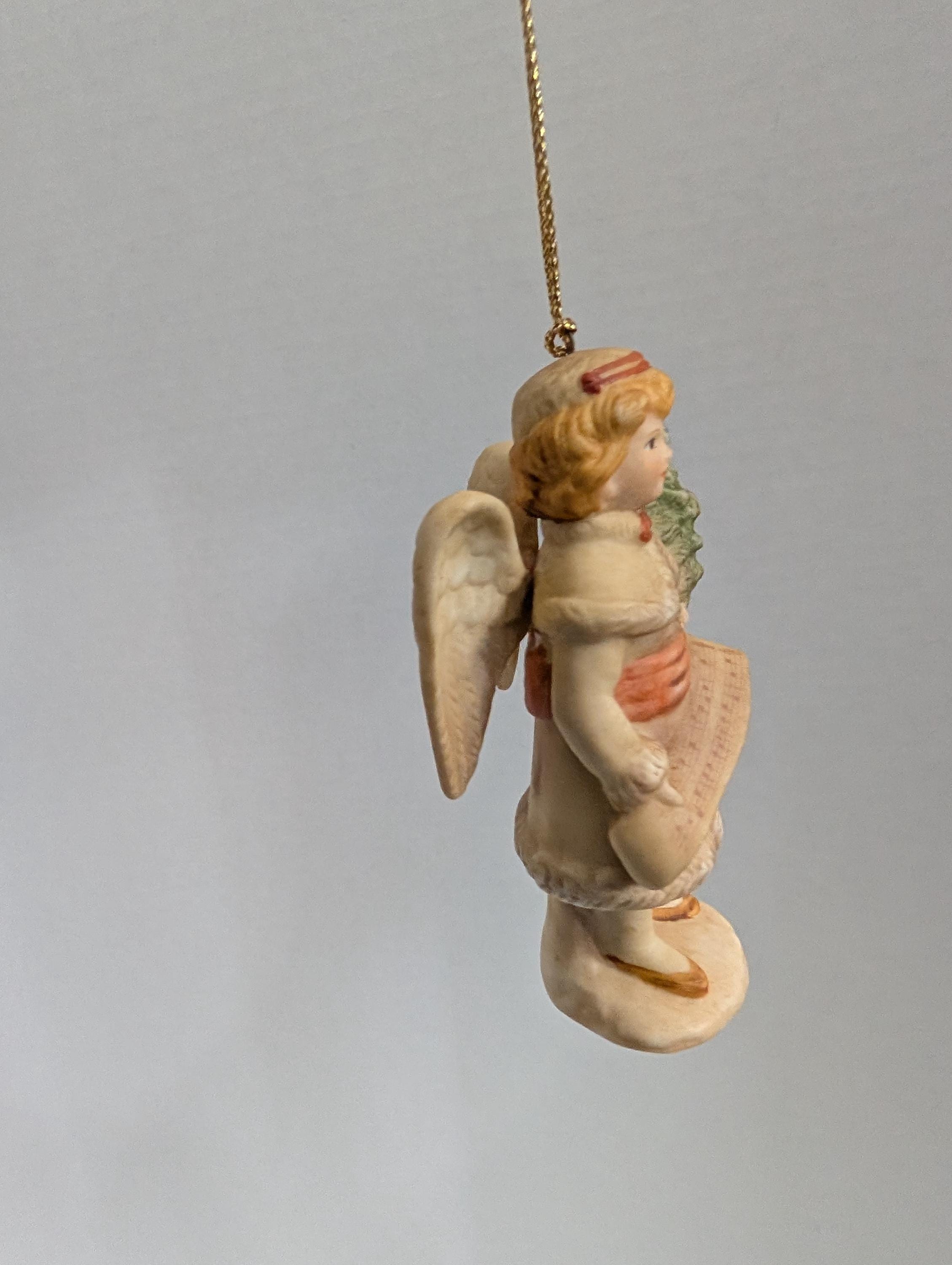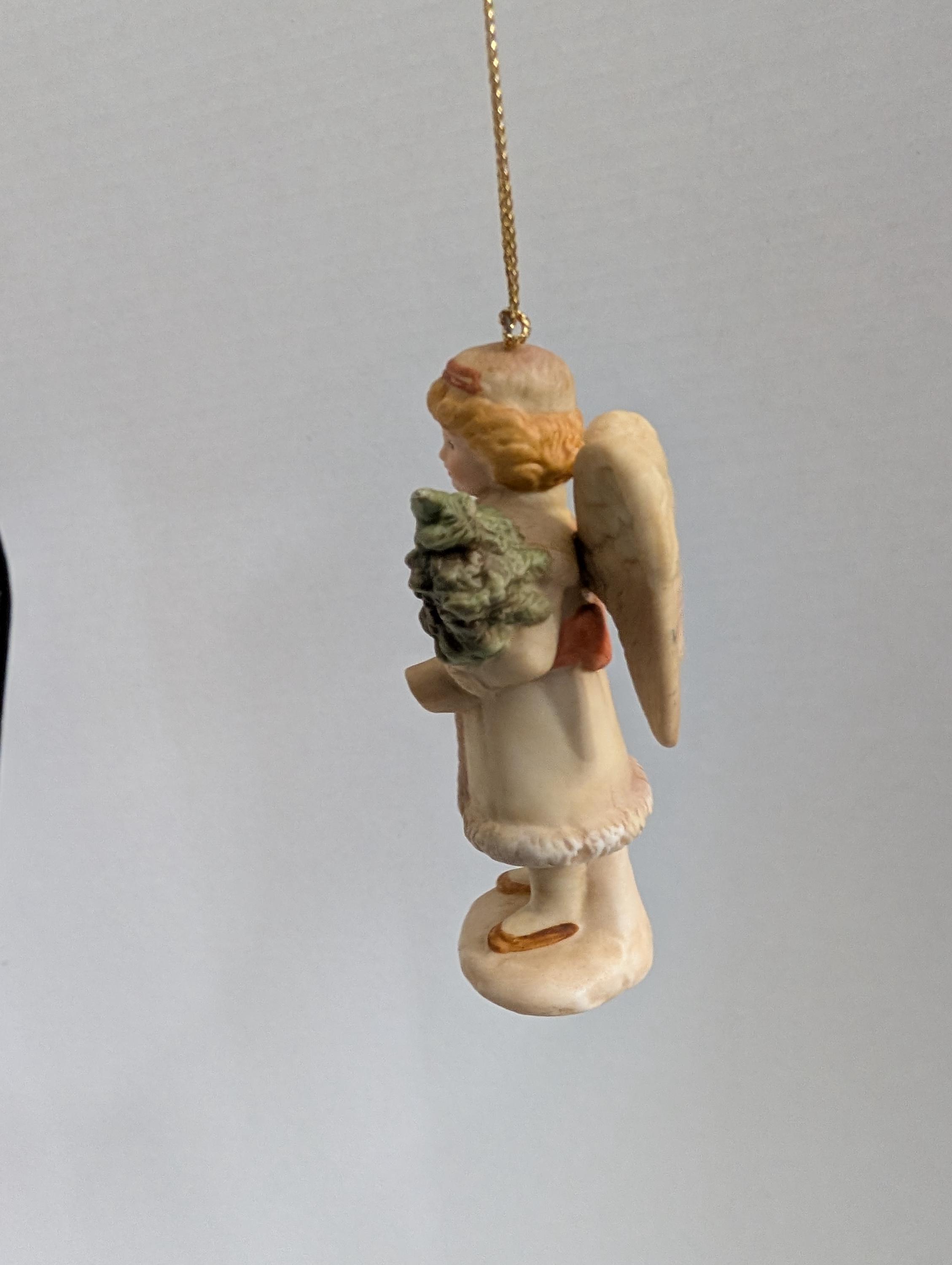 The angel is depicted holding a small evergreen Christmas tree in one arm and a scroll in the other, perhaps checking a list or singing a carol. The hand-painted details are soft and delicate, typical of the high-quality bisque porcelain Schmid is known for. In great used condition. Approximately 3 .25 inches tall. 1.25 inches wide. X67