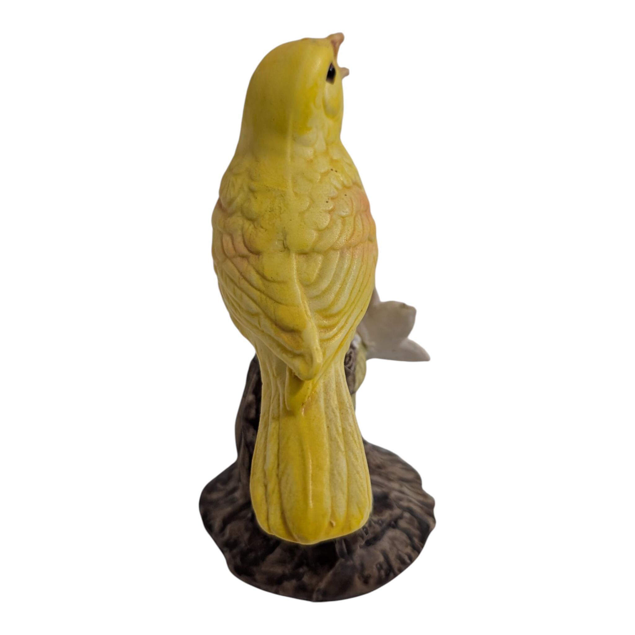 Bring a touch of song and sunshine to your shelf with this delightful vintage ceramic bird figurine.This adorable vintage figurine features a bright yellow bird (resembling a canary or warbler) caught mid-song with its beak open. The bird is perched on a textured brown tree stump adorned with a delicate pink blossom and green foliage.