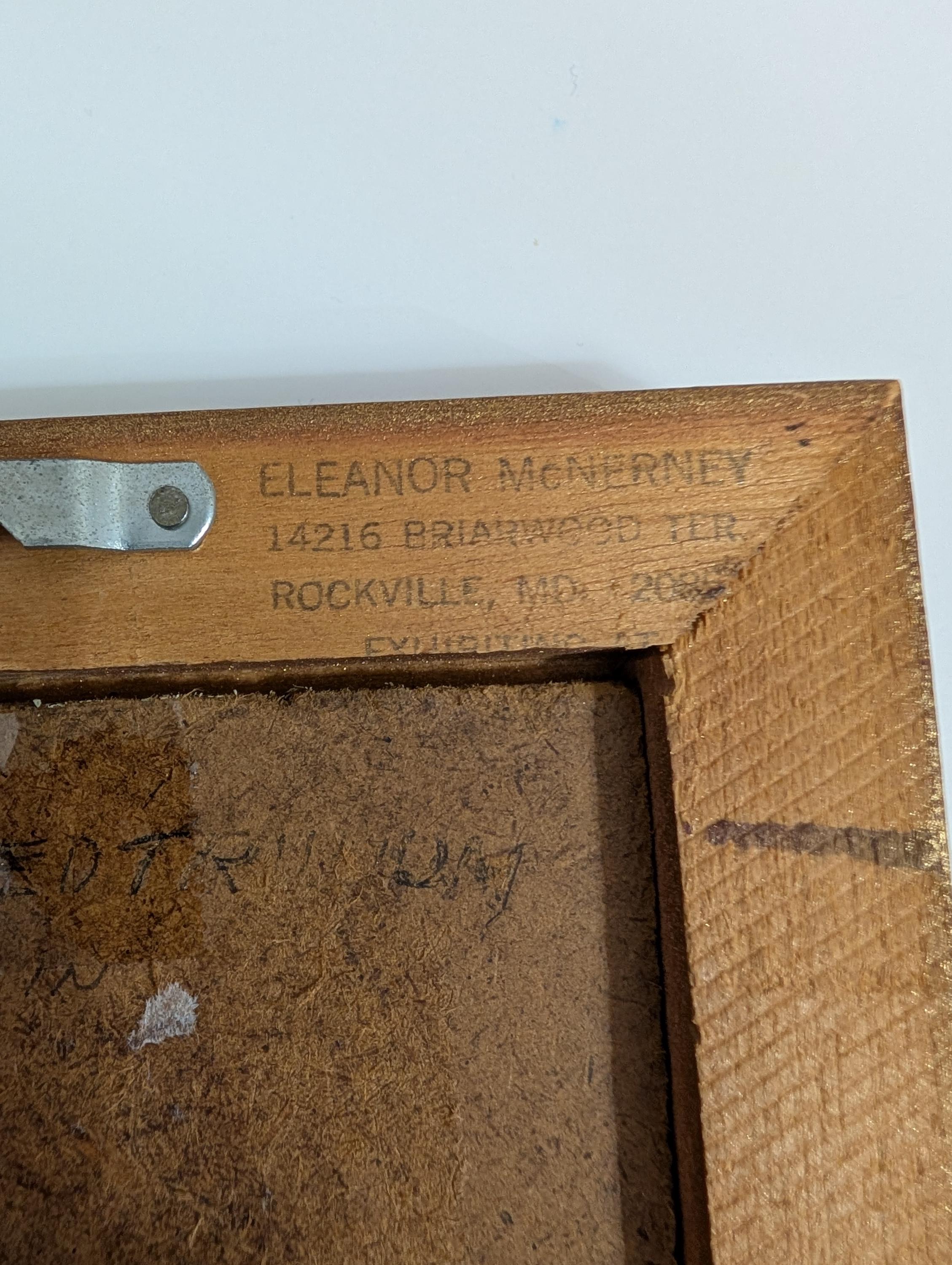 Eleanor McNerney (1910–2003) was a talented American artist based in Rockville, Maryland. A graduate of the prestigious Rhode Island School of Design (RISD), she was an active member of the Arts Club of Washington. McNerney was known regionally for her skilled work in oils and watercolors, frequently capturing landscapes and detailed botanical subjects in the Mid-Atlantic region.