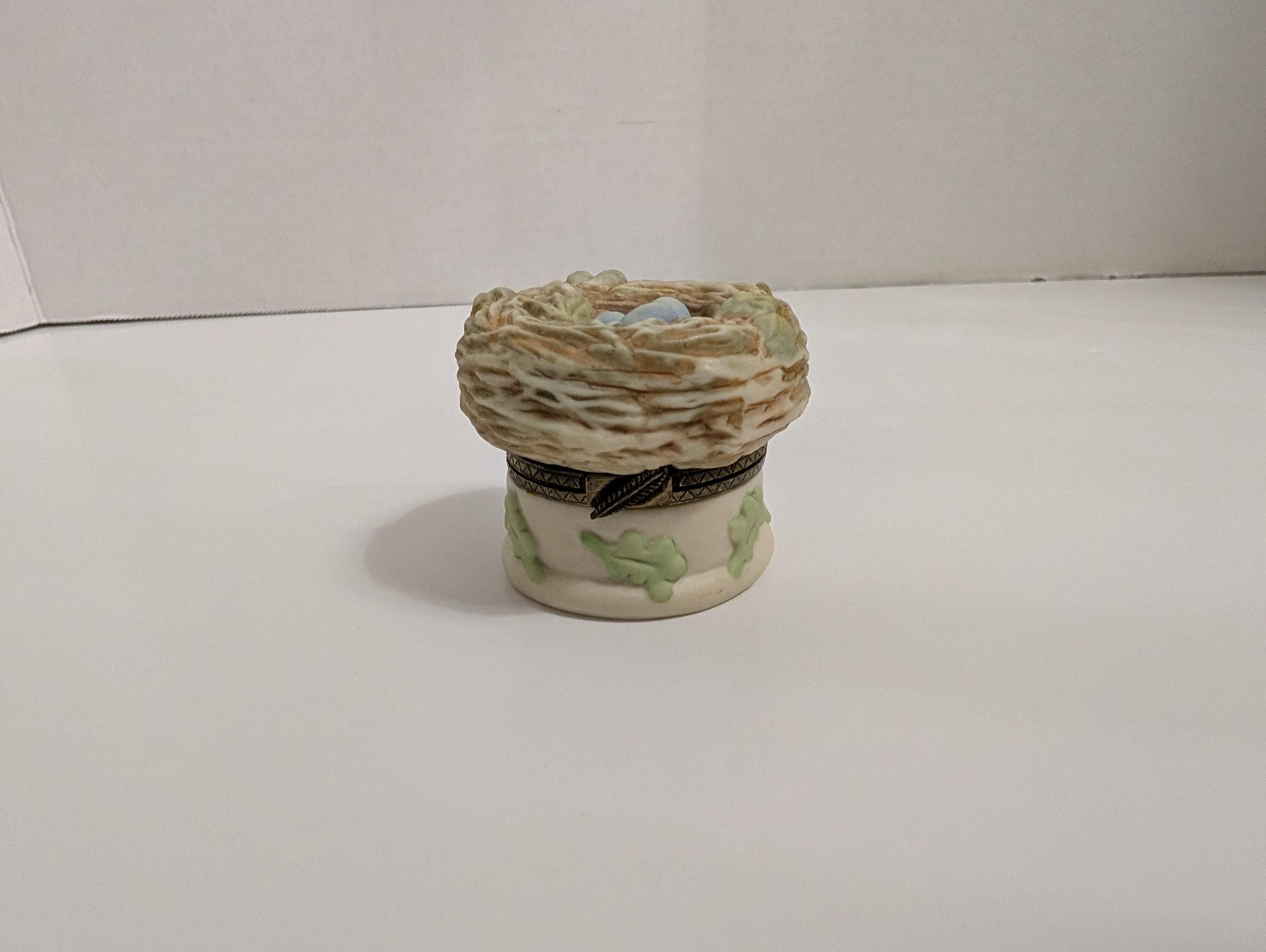 The lid is beautifully sculpted to resemble a rustic bird's nest holding three speckled robin's eggs. The creamy white base is adorned with sculpted green oak leaves, and the piece is finished with an antique-style metal hinge featuring a unique feather-shaped clasp.