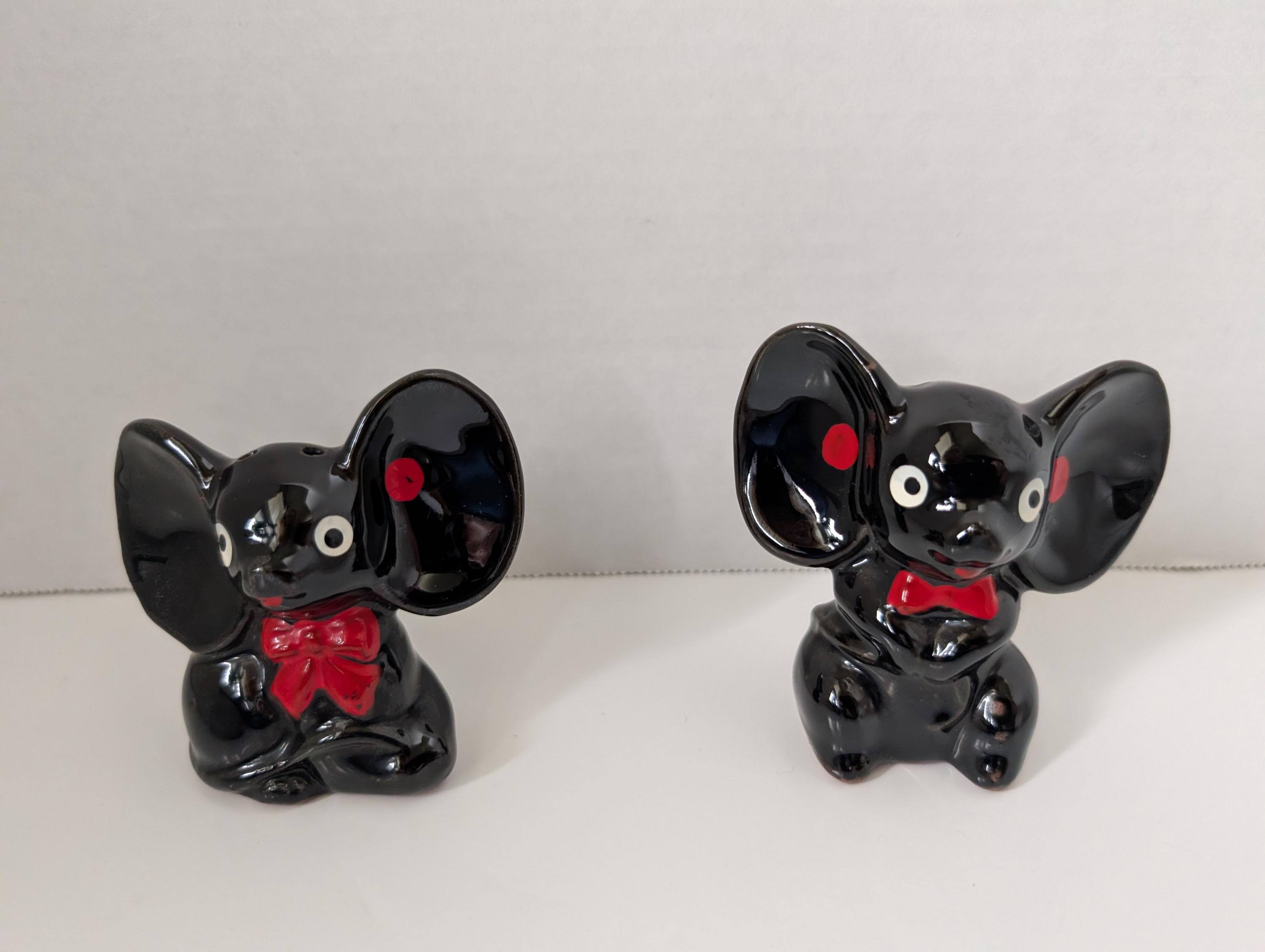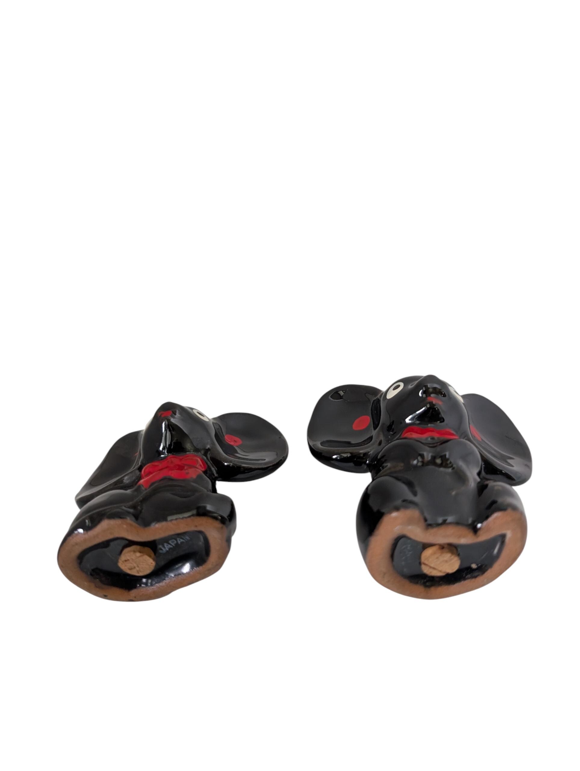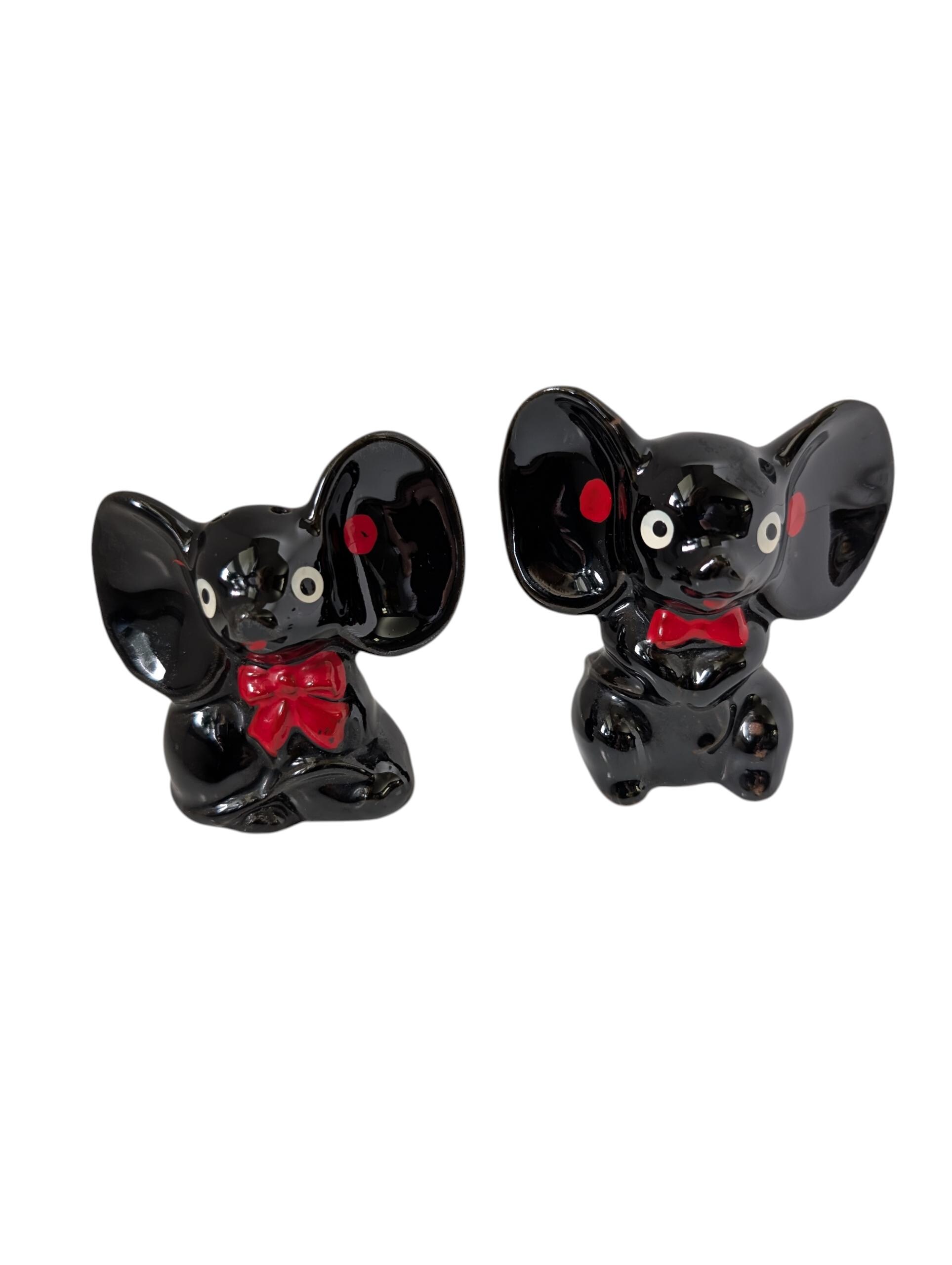 These delightful ceramic elephants feature the classic "Black Gloss" style popular in 1950s Japanese exports. With their oversized ears, expressive white eyes, and hand-painted red bowties, they are a perfect example of the "anthropomorphic" (human-like) kitchenware that collectors love.