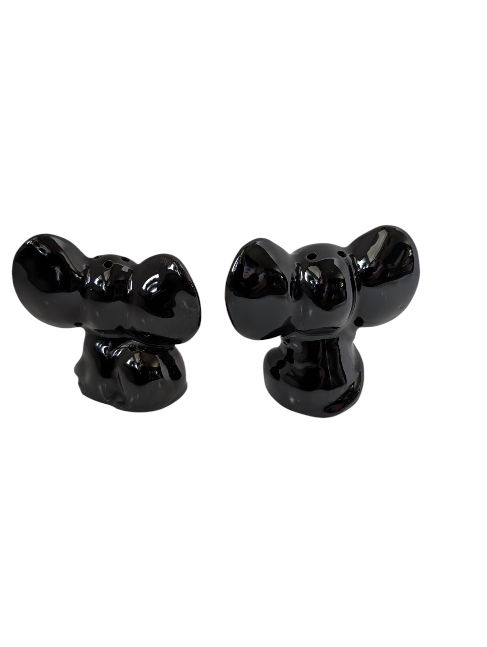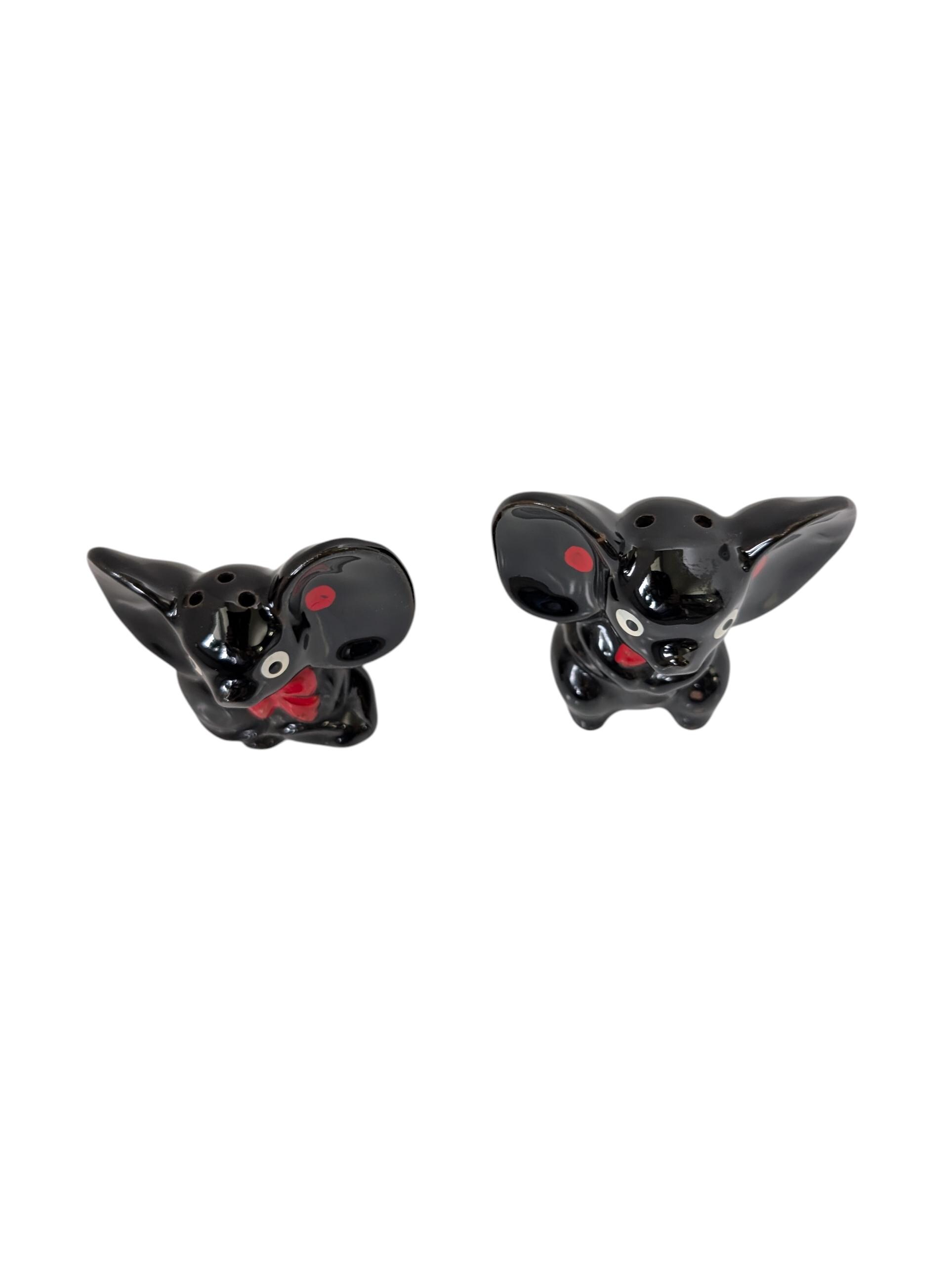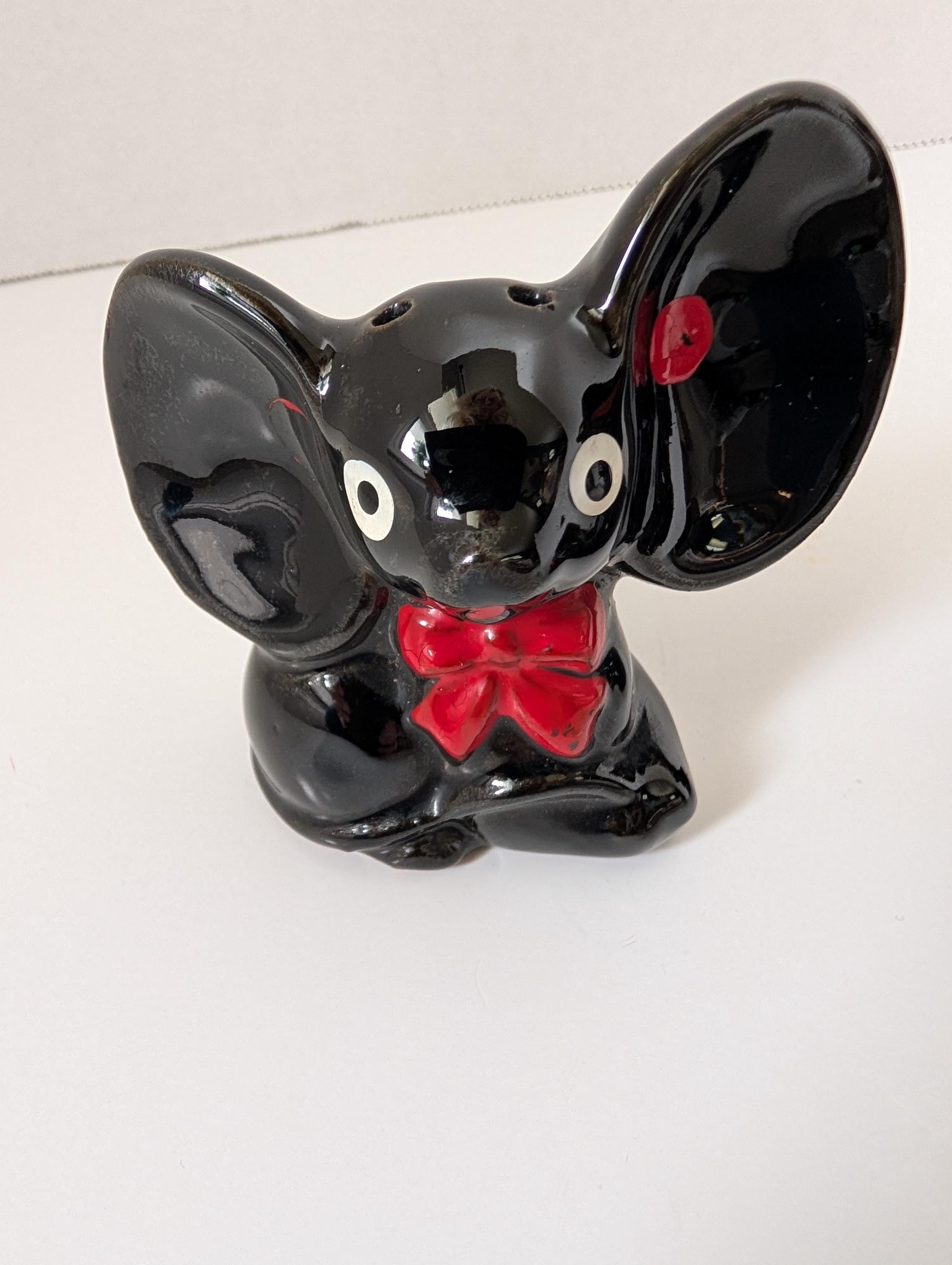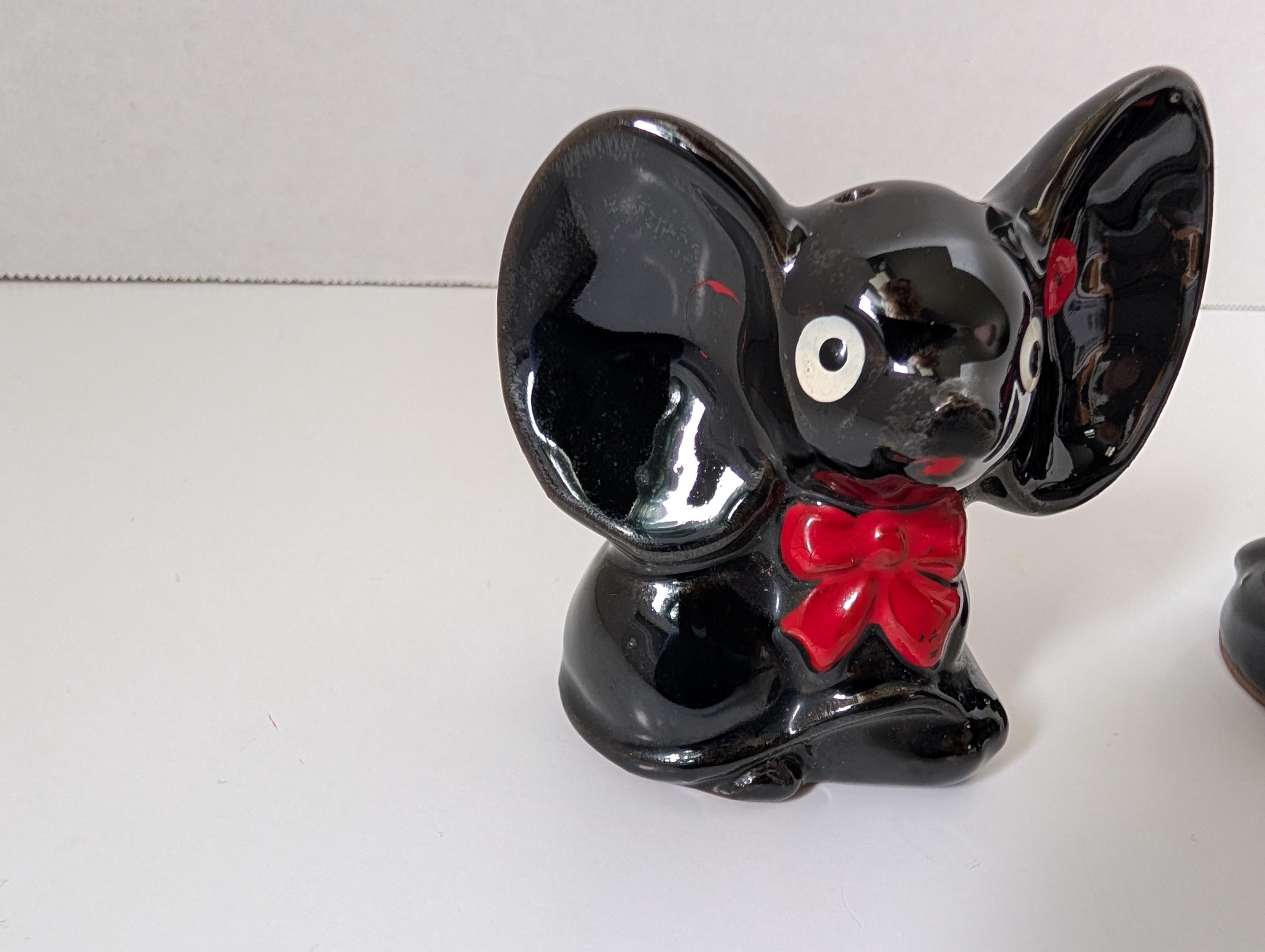 These delightful ceramic elephants feature the classic "Black Gloss" style popular in 1950s Japanese exports. With their oversized ears, expressive white eyes, and hand-painted red bowties, they are a perfect example of the "anthropomorphic" (human-like) kitchenware that collectors love.