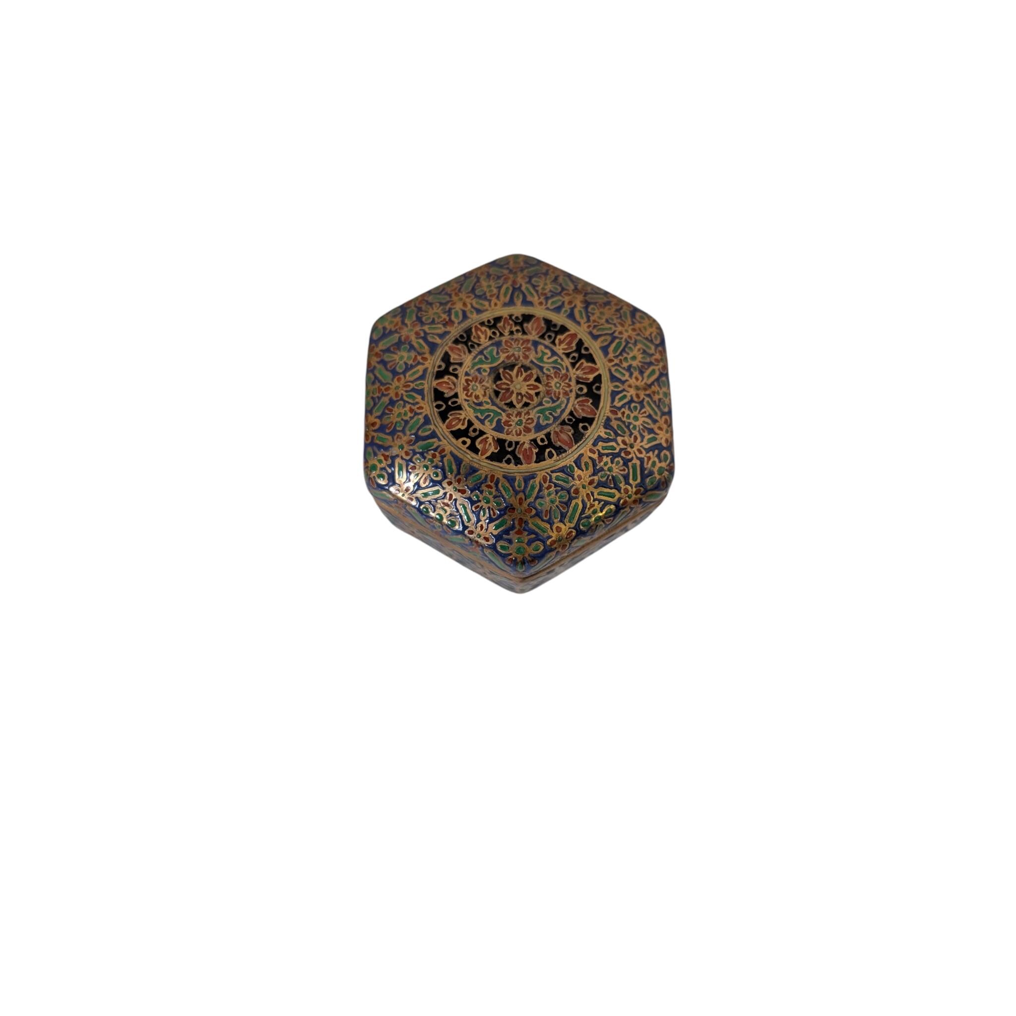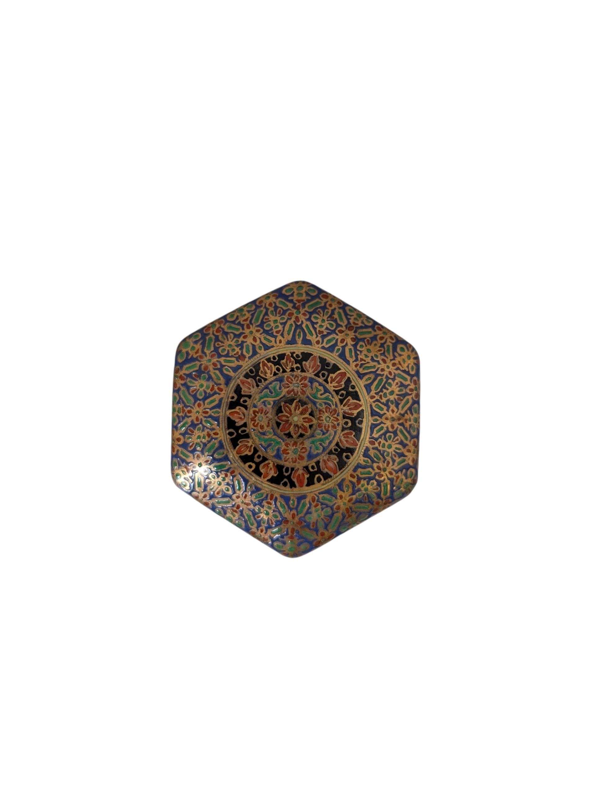 Design: A six-sided (hexagonal) shape with a vibrant geometric floral mandala pattern in cobalt blue, rust red, and emerald green.