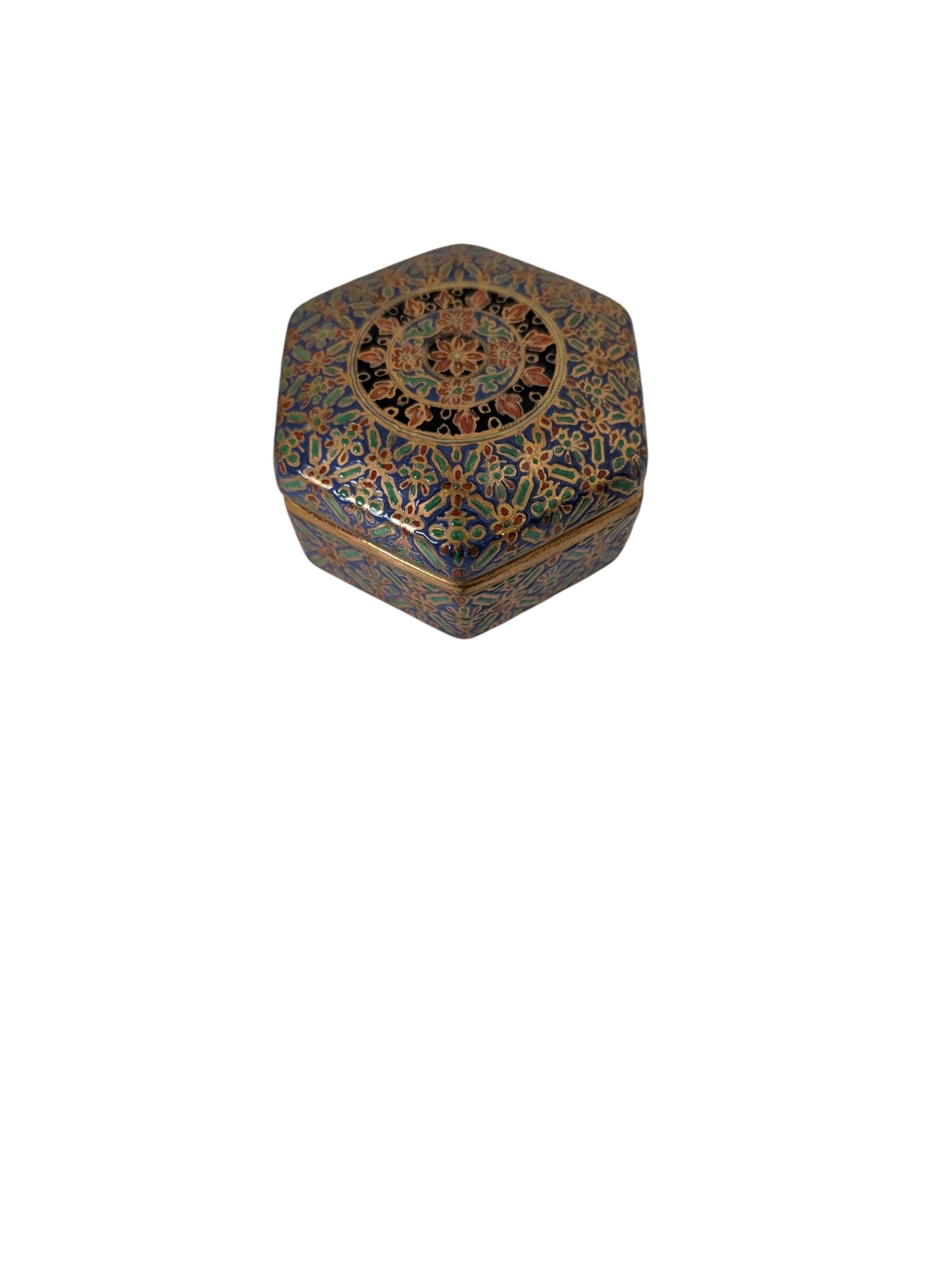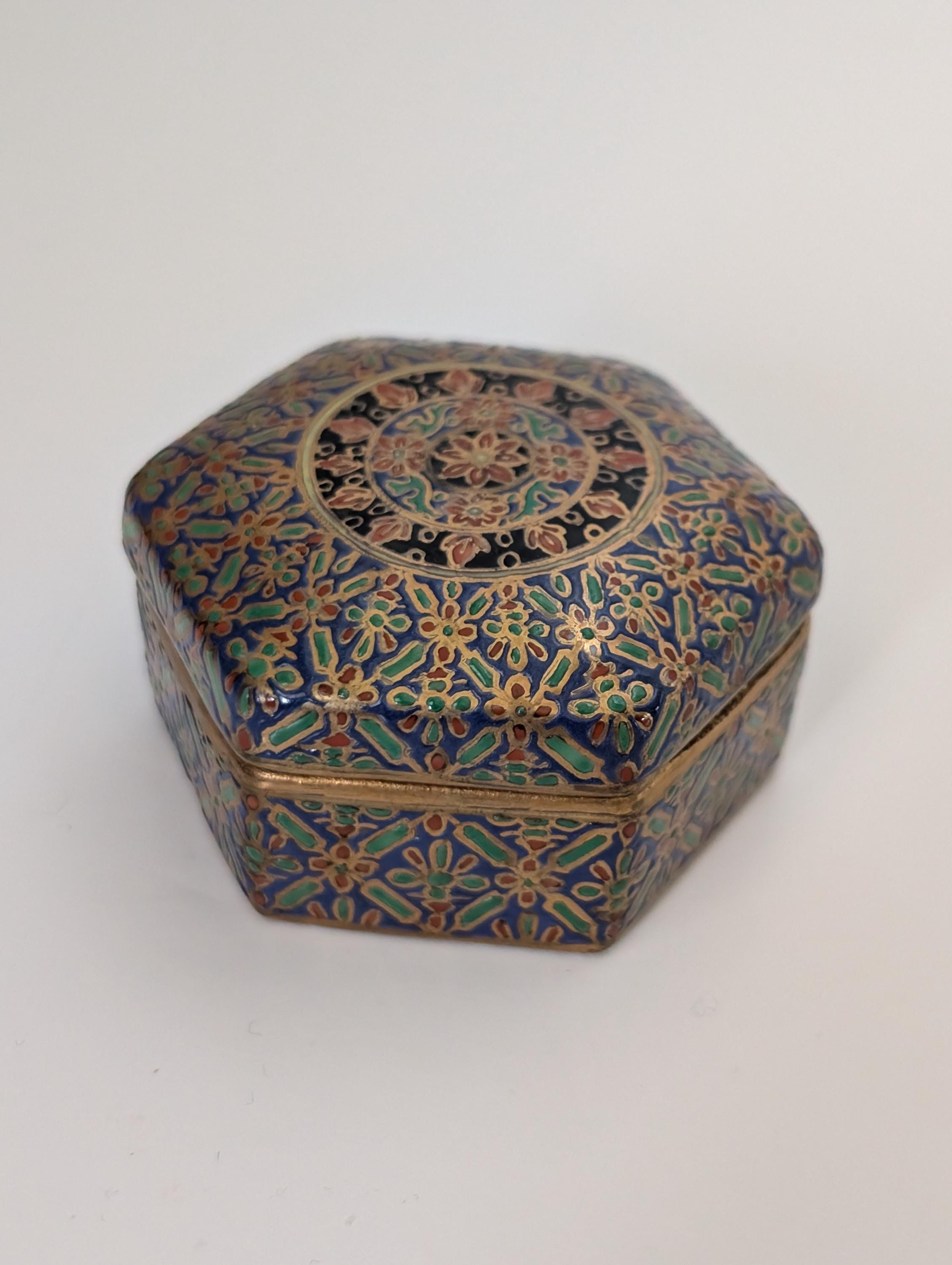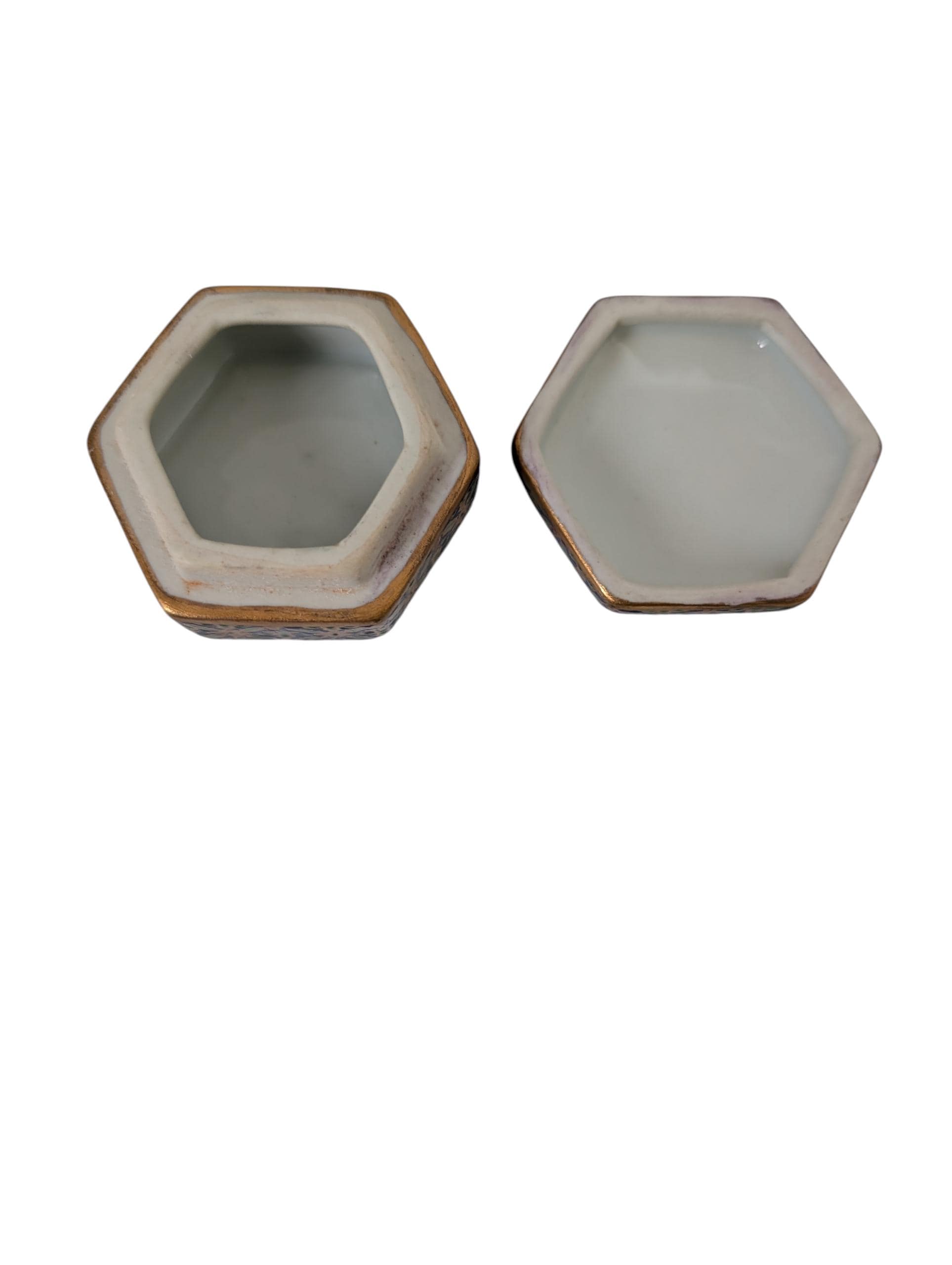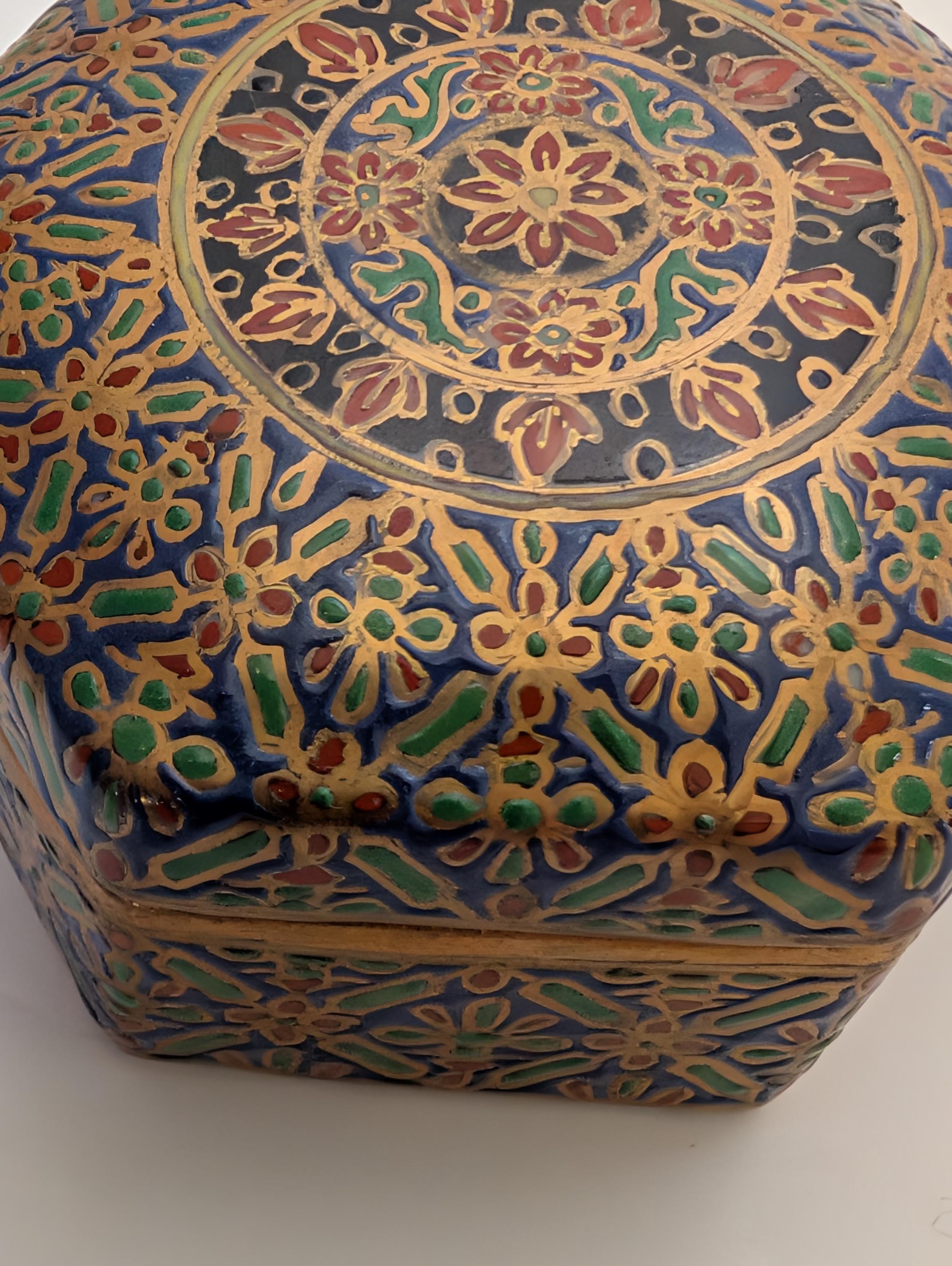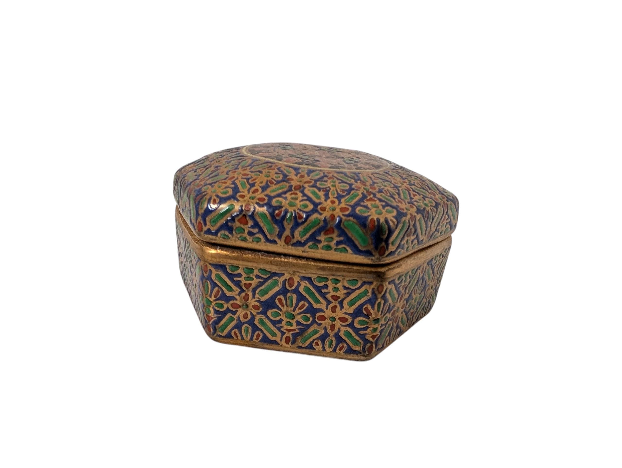 Vintage Hexagon Satsuma Trinket Box | Japanese Porcelain with Gold Moriage | Hand Painted Cobalt Blue & Red Jewelry Ring Box | Signed