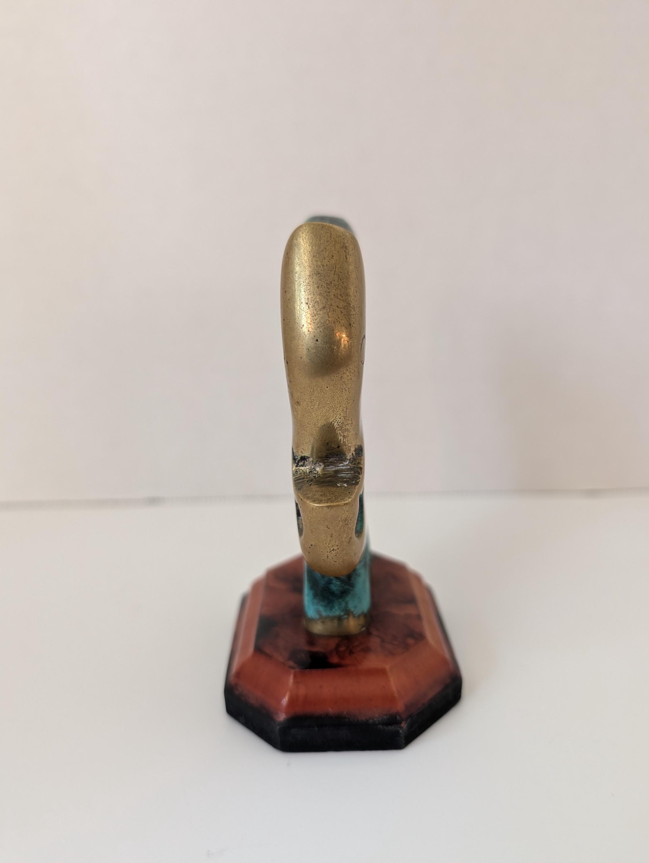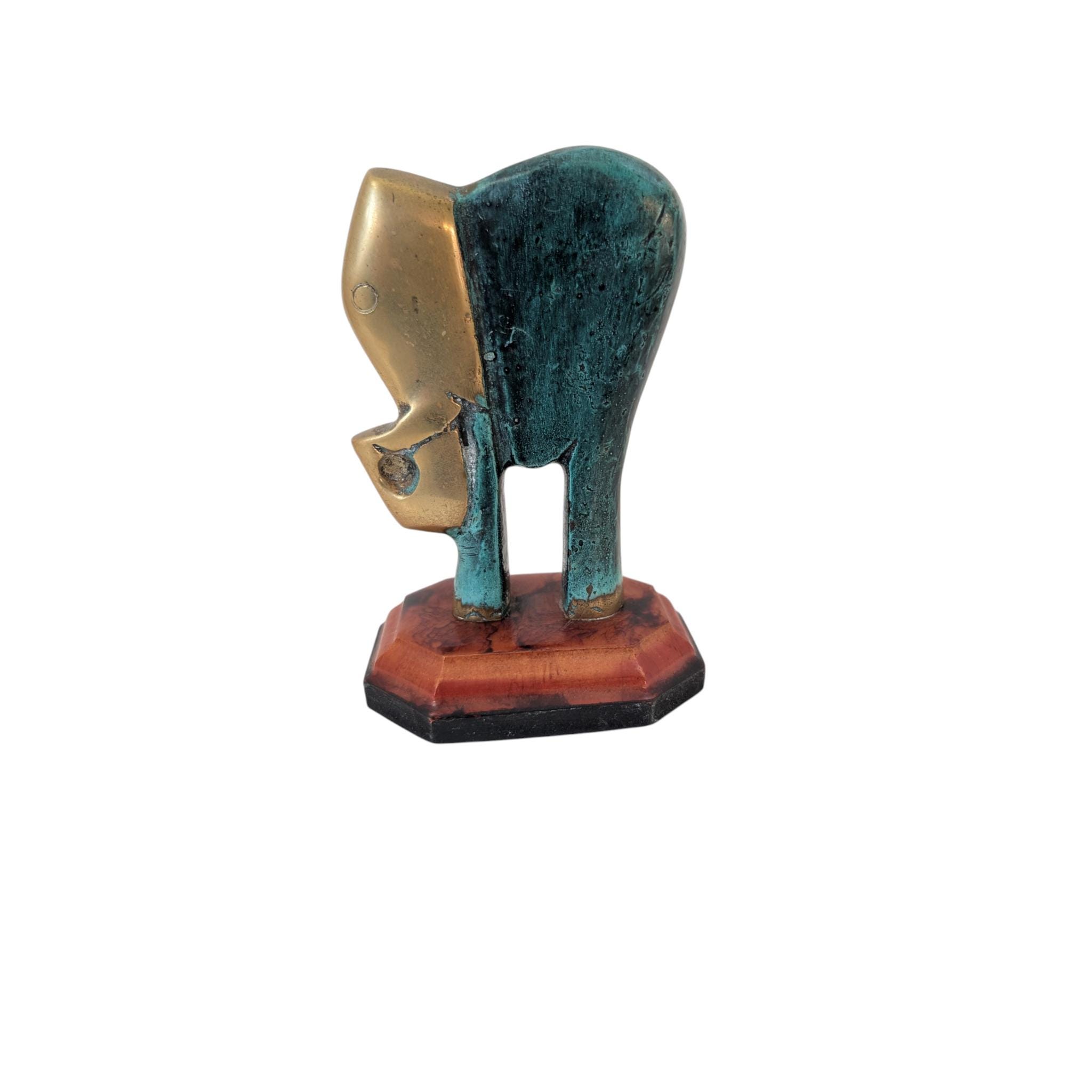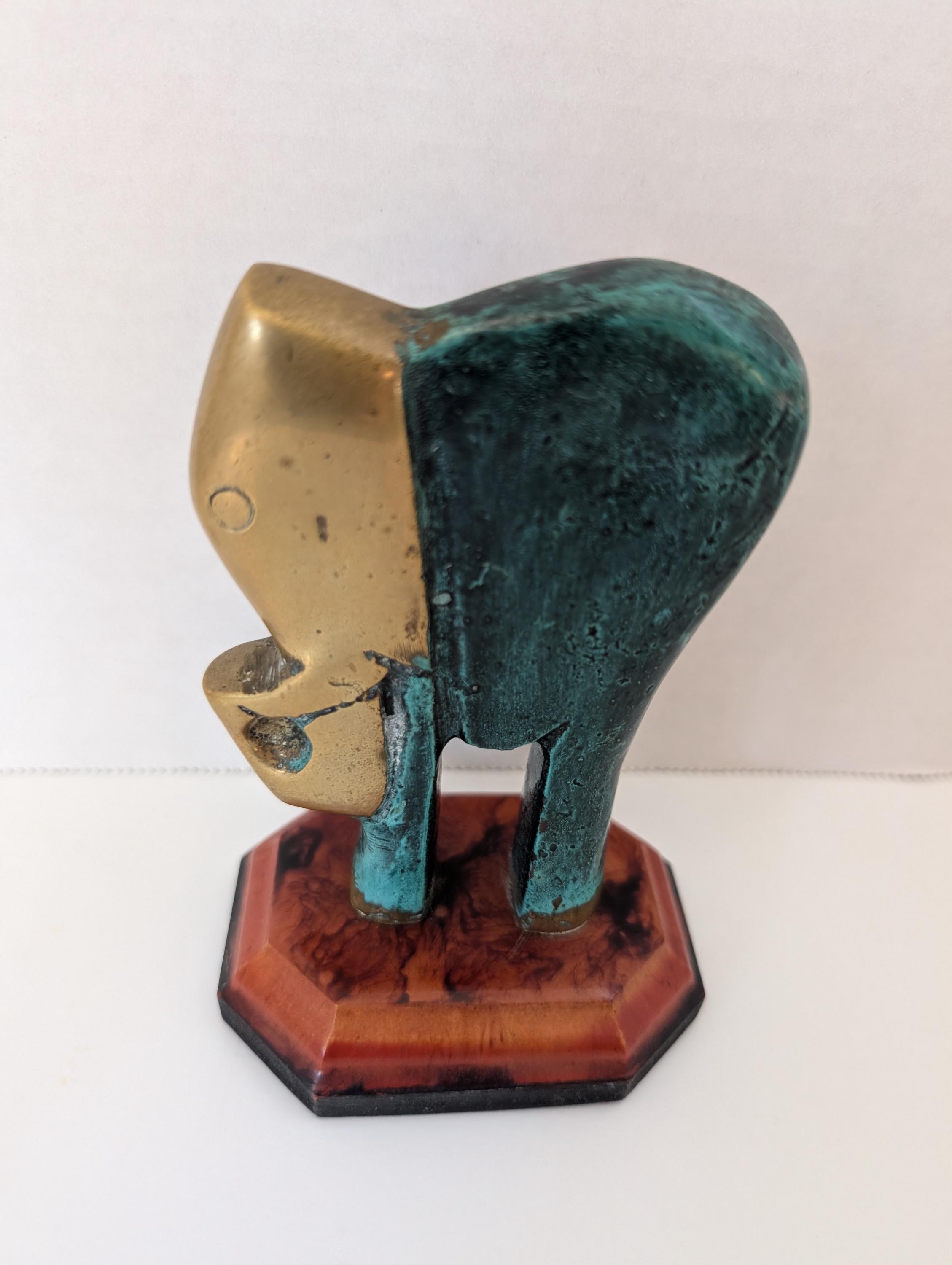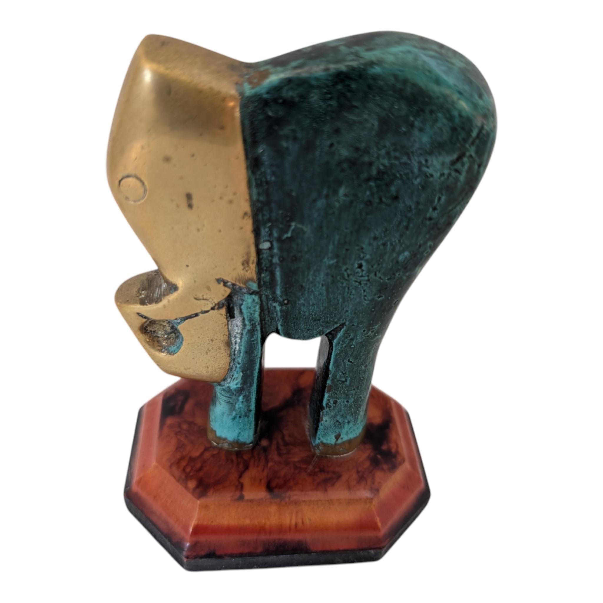 Vintage Modernist Brass Elephant Statue - Verdigris Patina Finish - Hollywood Regency Decor on Two-Tone Octagonal Base - 4.5" MCM Sculpture
